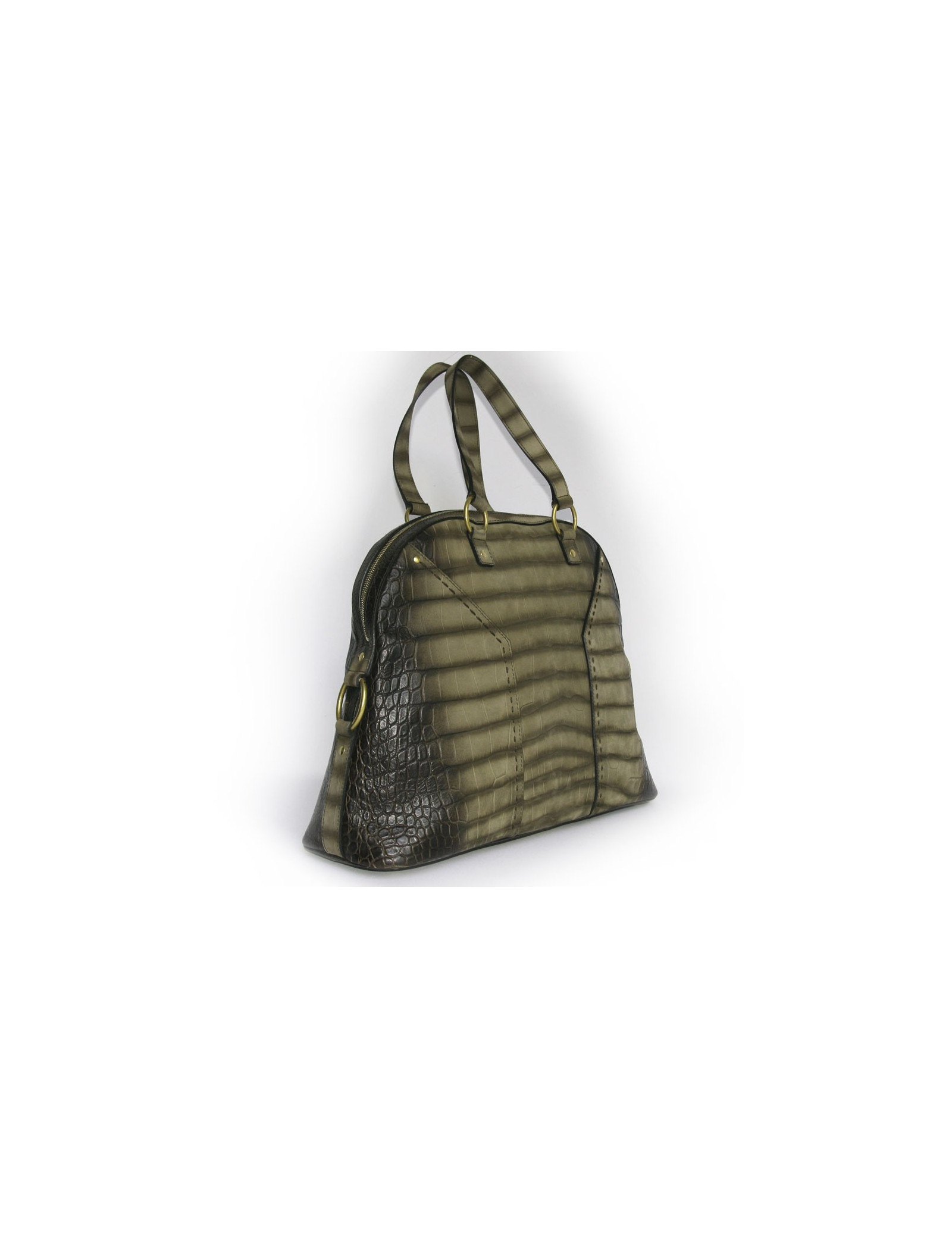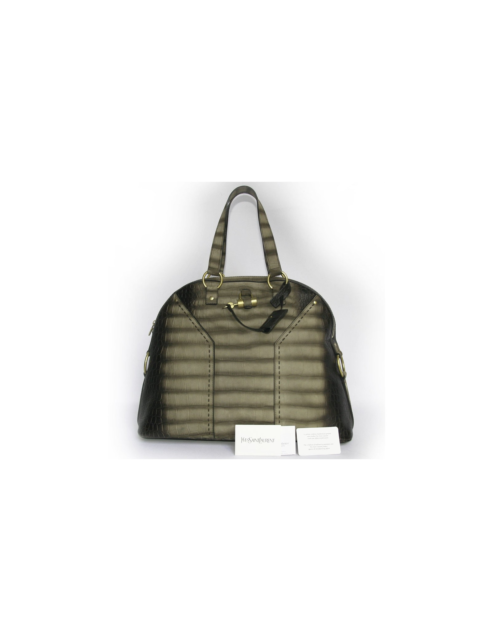 Le véritable it-bag de la Maison Yves Saint Laurent le sac Muse en cuir imitation croco marron et gris. Son accastillage est en laiton doré. Il comporte un cadenas avec une clefs. Son intérieur en tissu avec une grande poche zippée. Il y permet un grand espace de rangement. Il se porte au bras et à l'épaule grâce à ses deux anses. Carte d'authencité. En très bon état.