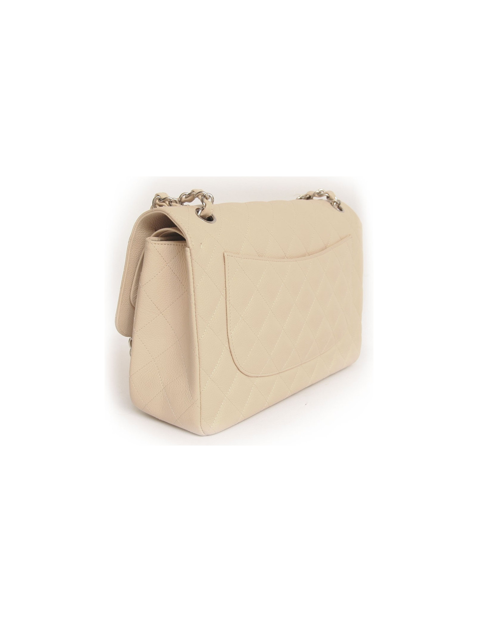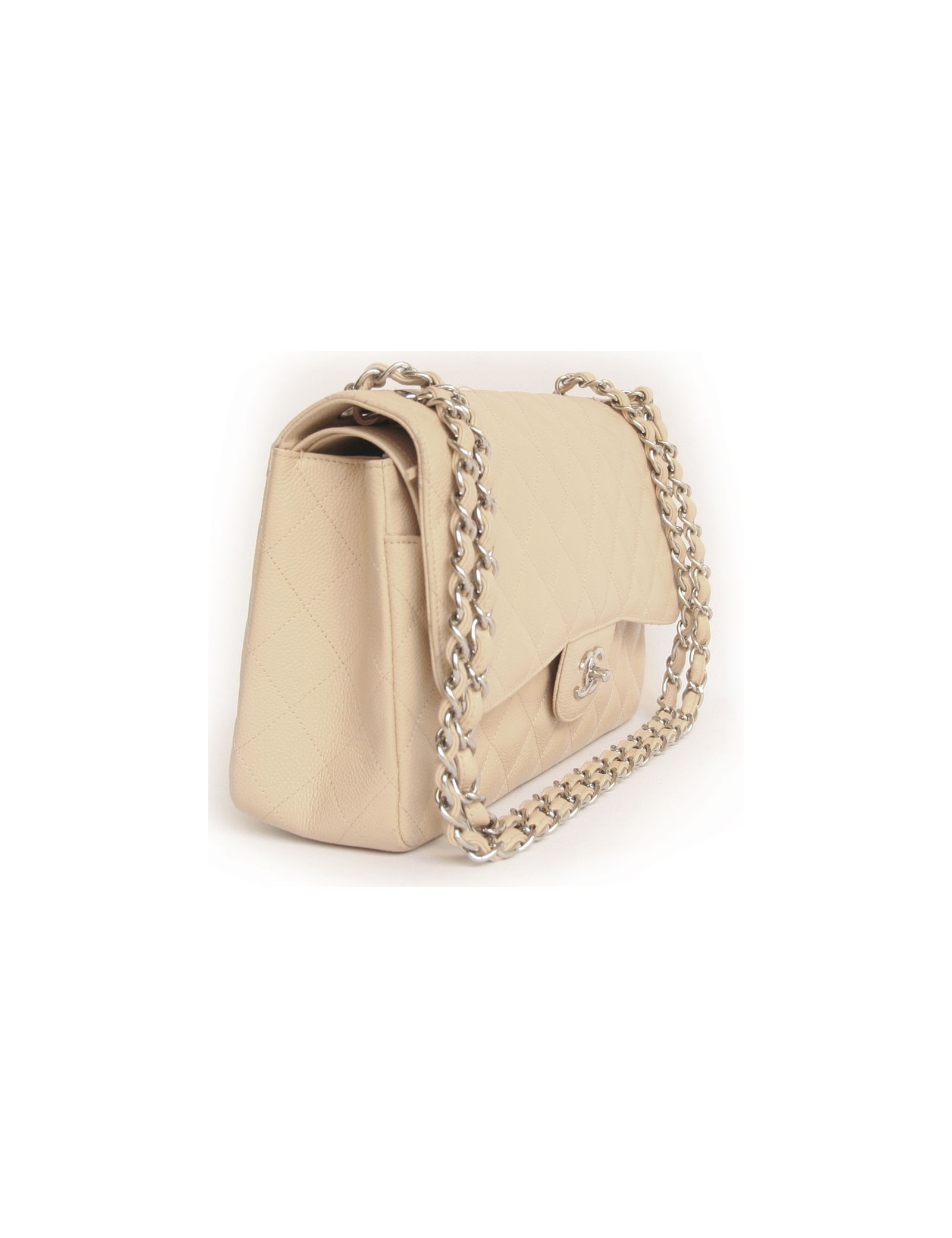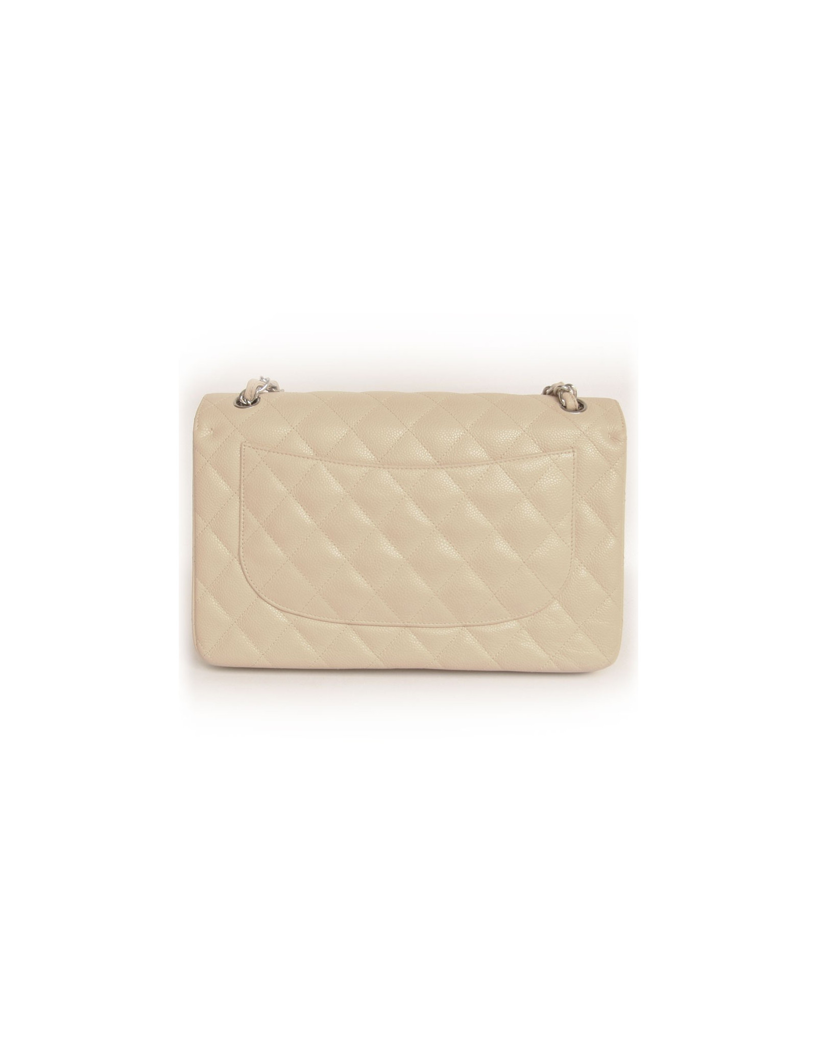 Superbe Jumbo de la Maison Chanel en cuir caviar beige. Double rabat. Deux poches intérieures. Deux poches plates à l'avant ainsi qu'à l'arrière. L'accastillage est en métal argenté. Il se porte à l'épaule et en bandoulière. Hologramme: 14.... et carte d'authencité. En très bon état.