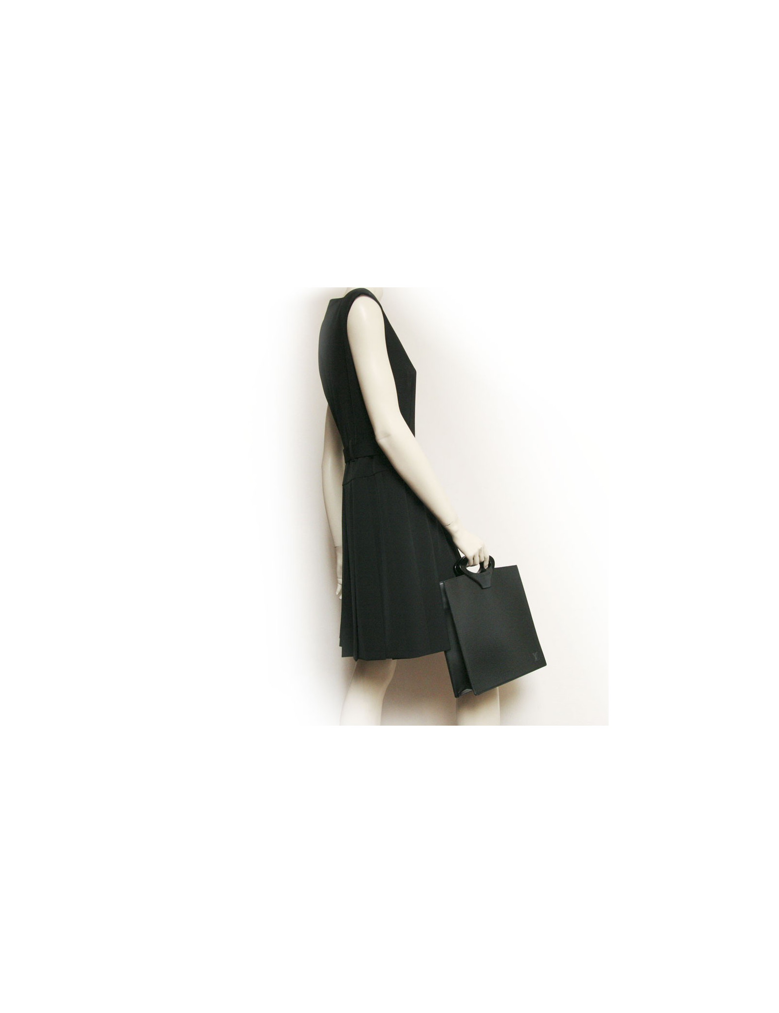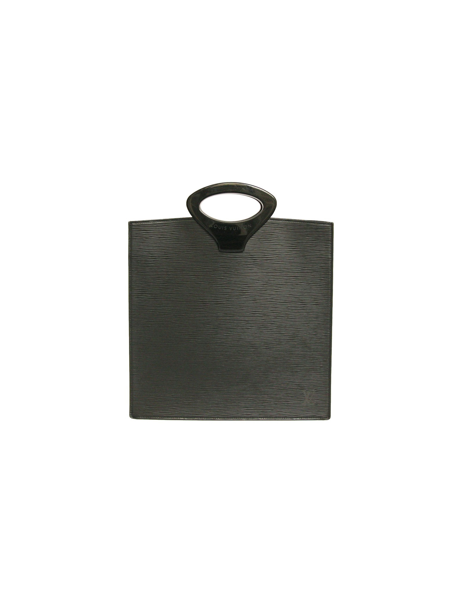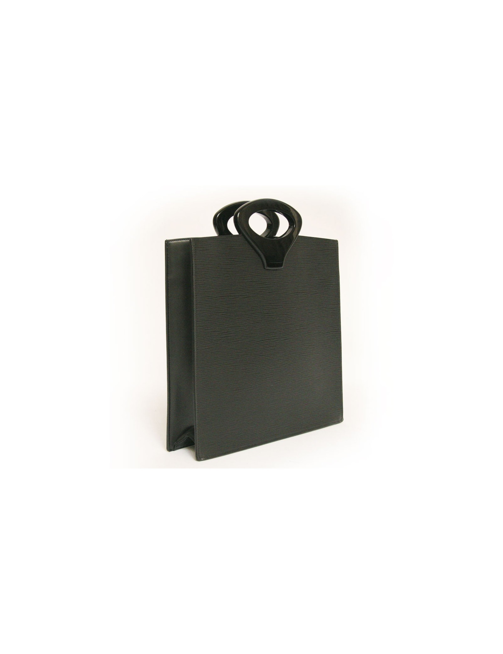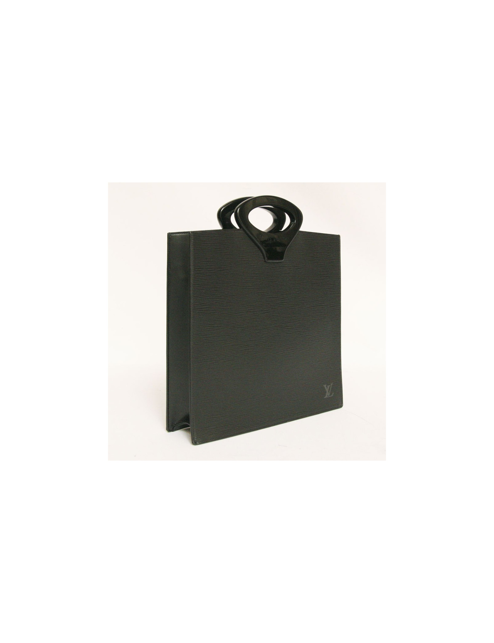 Sac Louis Vuitton en cuir épi noir. Il est de forme rectangulaire. Il se porte uniquement à la main avec deux anses en plastique noir. L'intérieur est gris avec une poche. Sigle LV en bas à droite ainsi que le nom de la marque LOUIS VUITTON sur l'une des anses. En très bon état. A l'arrière du sac très légère marque plus claire.