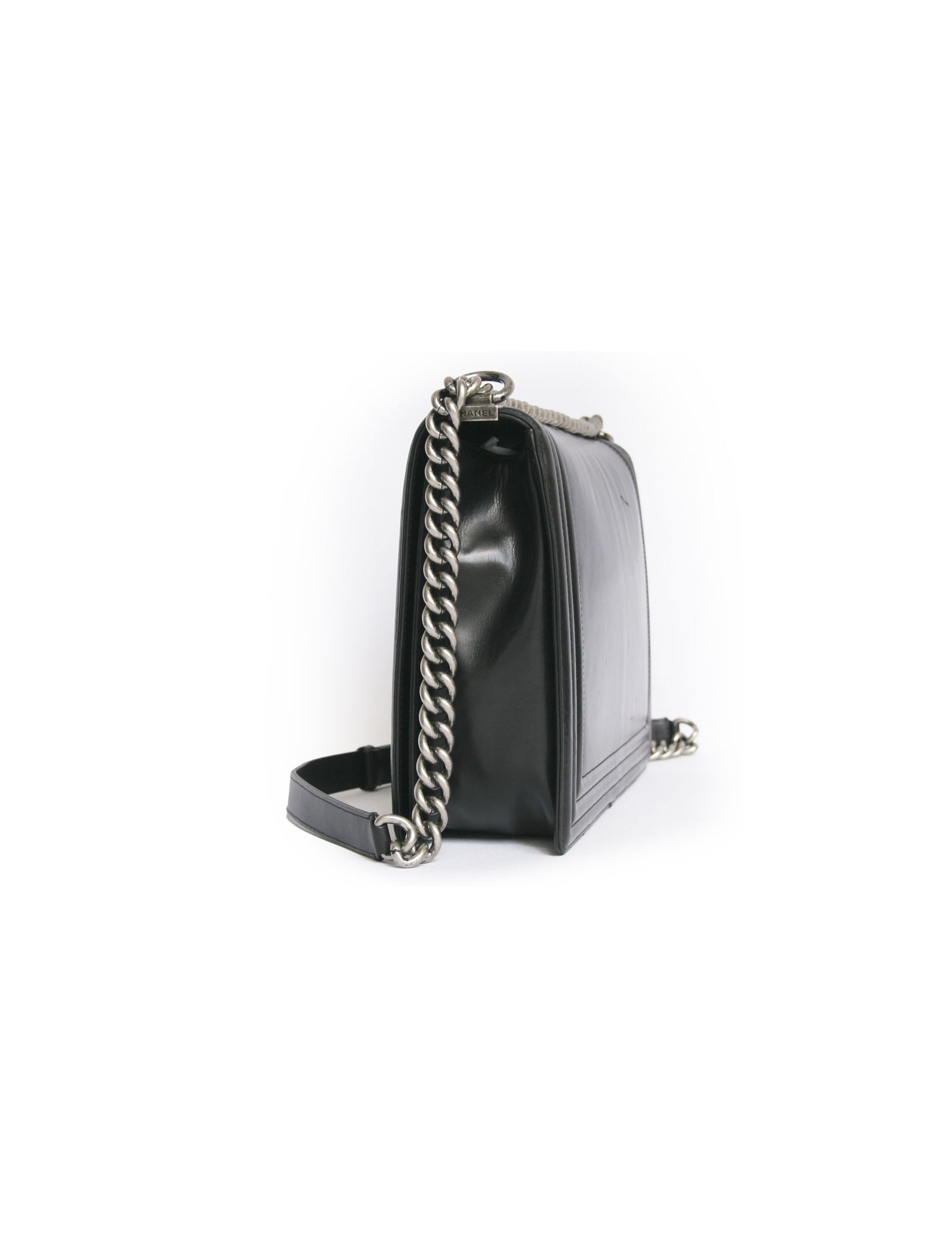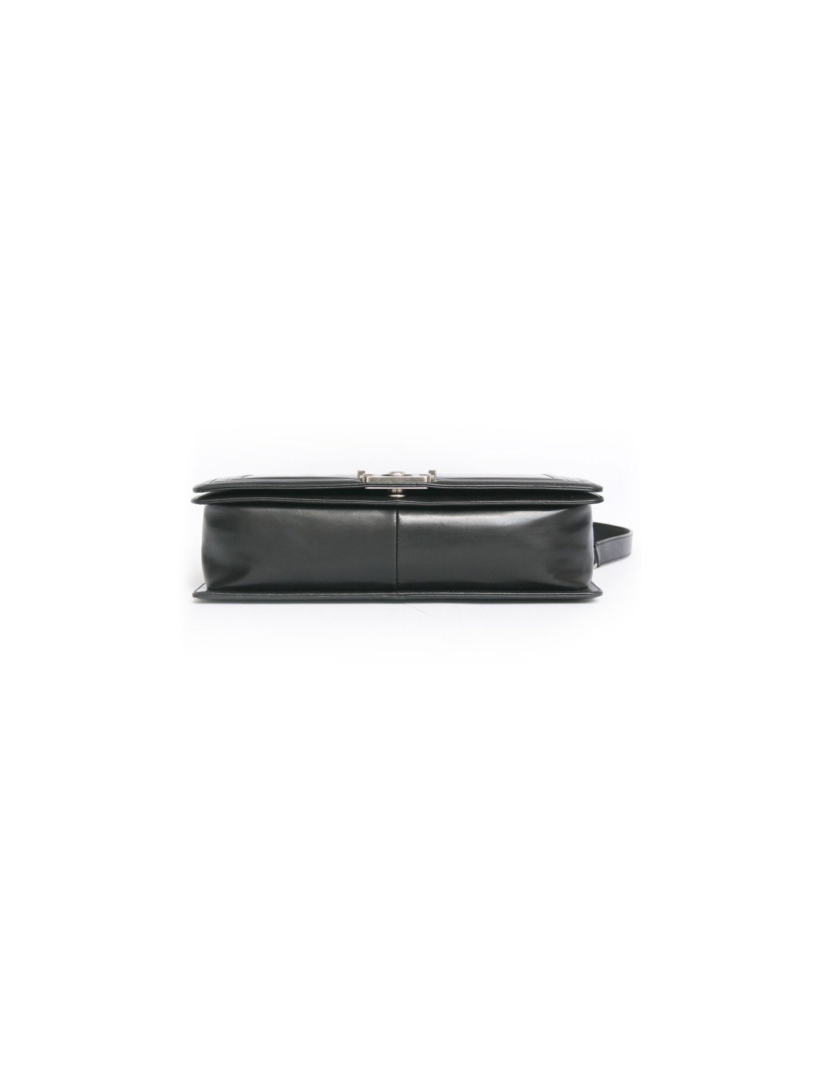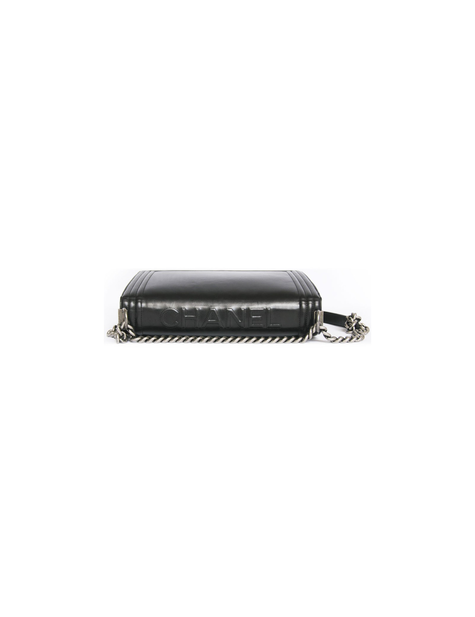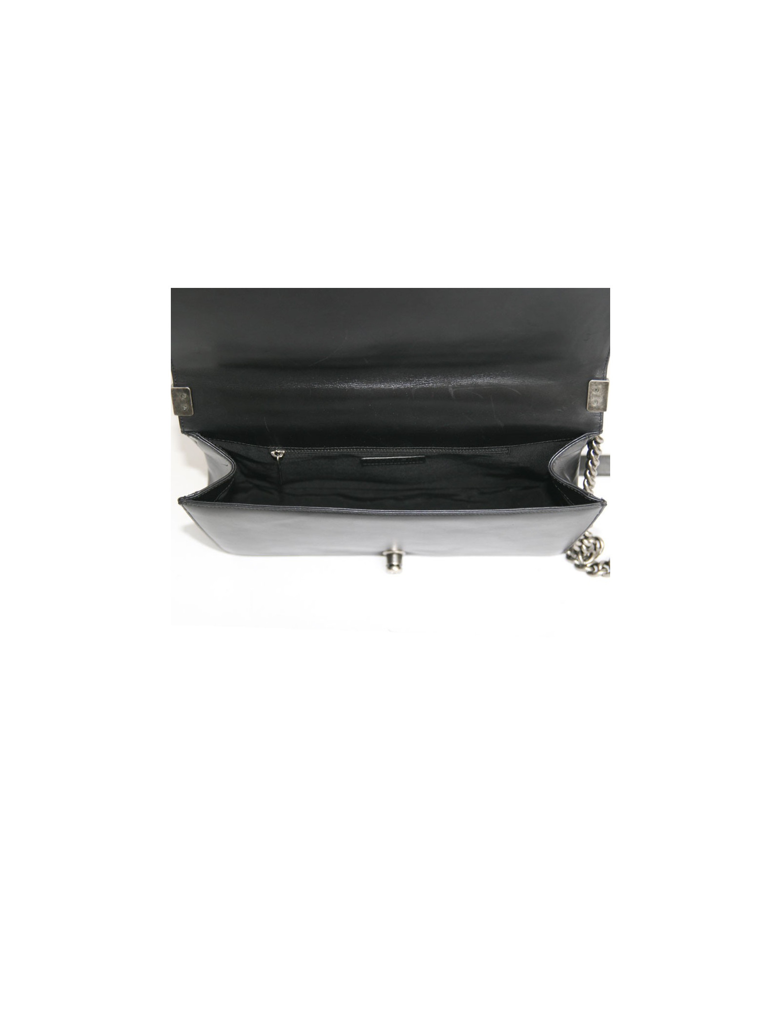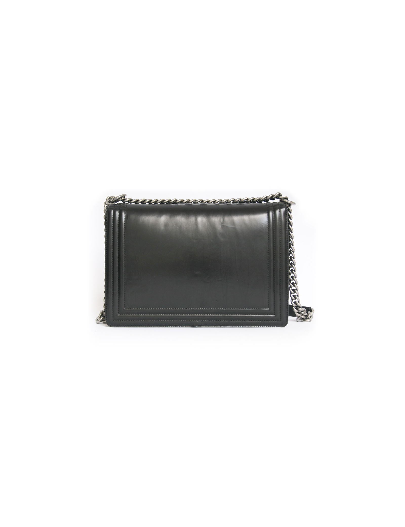 Le fameux sac "Boy" de la Maison Chanel en cuir de veau glacé. Introuvable en boutique. L'inscription en haut du sac en relief "Chanel". L'accastillage est en métal argenté. L'intérieur est en toile avec une poche zippée. En bon état. Quelques marques sur le cuir à l'avant du sac. Voir photos.