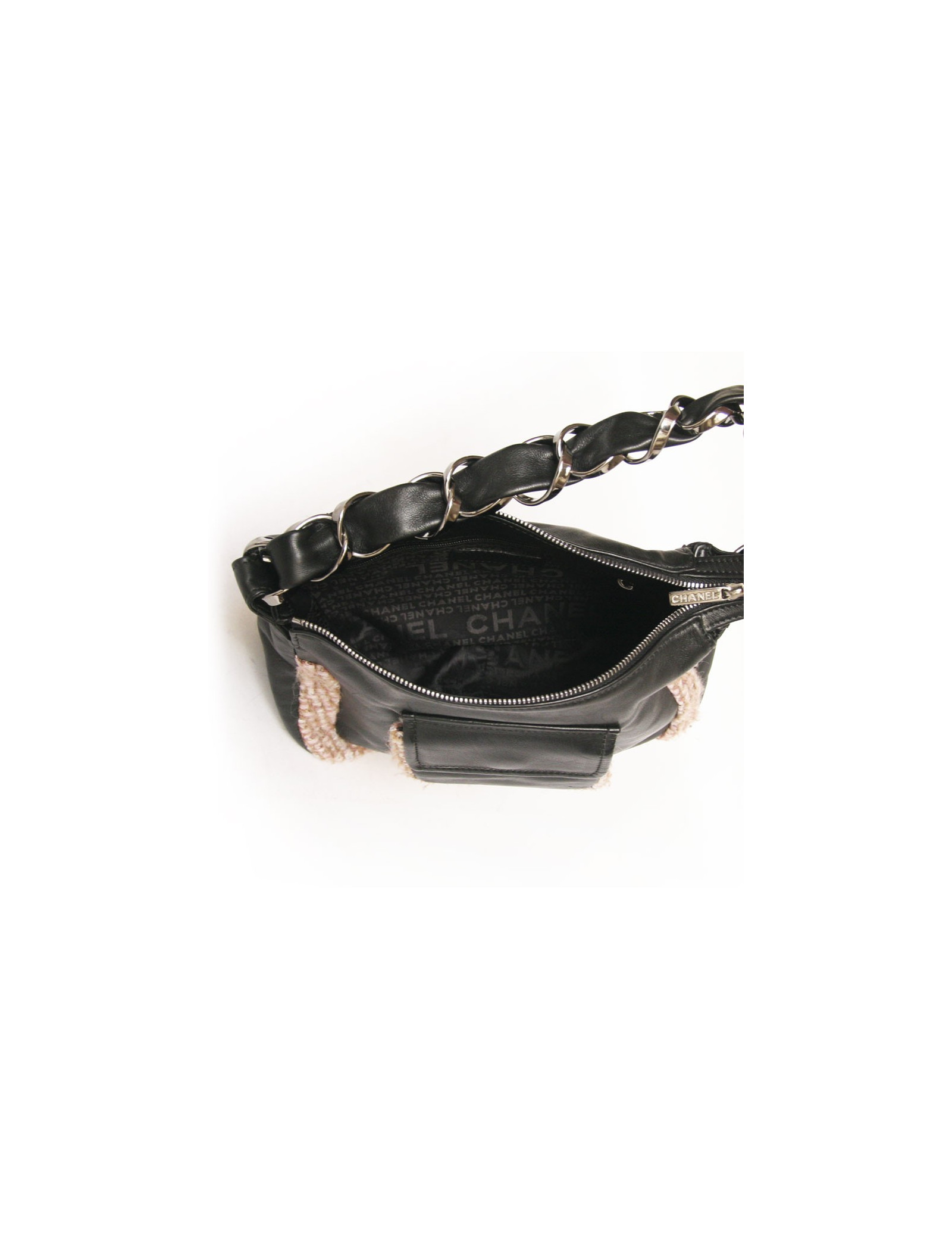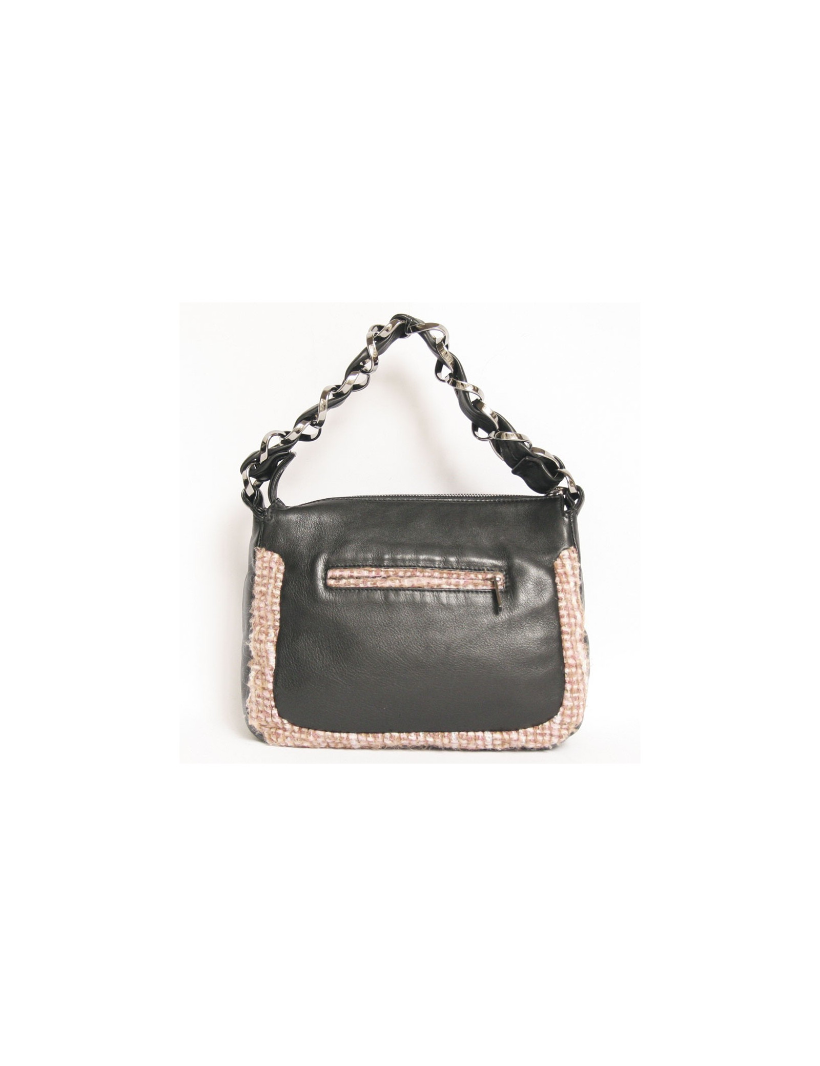 Sac Chanel en cuir noir et tweed dans les tons pastel. Fermeture zippée en métal argenté. L'anse est en cuir et chaine argenté. Il se porte à la main et au bras. L'intérieur est en tissu monogram 'Chanel' avec une poche zippée. Une poche à l'avant aimanté et une poche à l'arrière zippée. En très bon état.