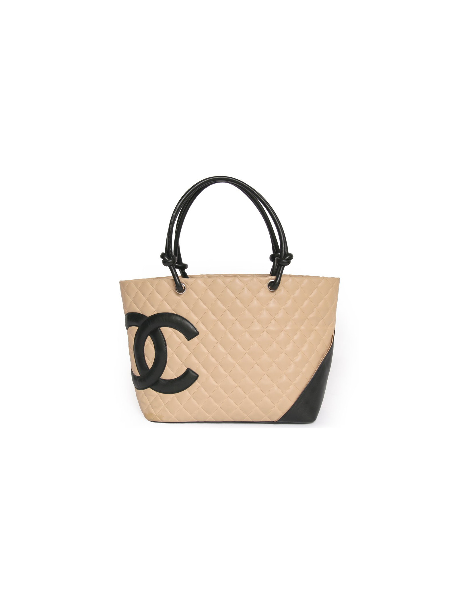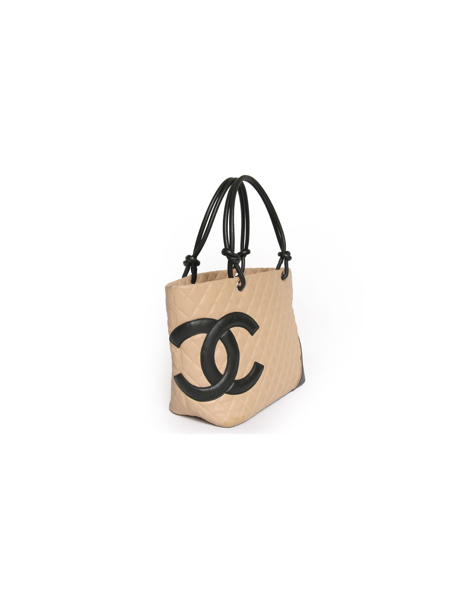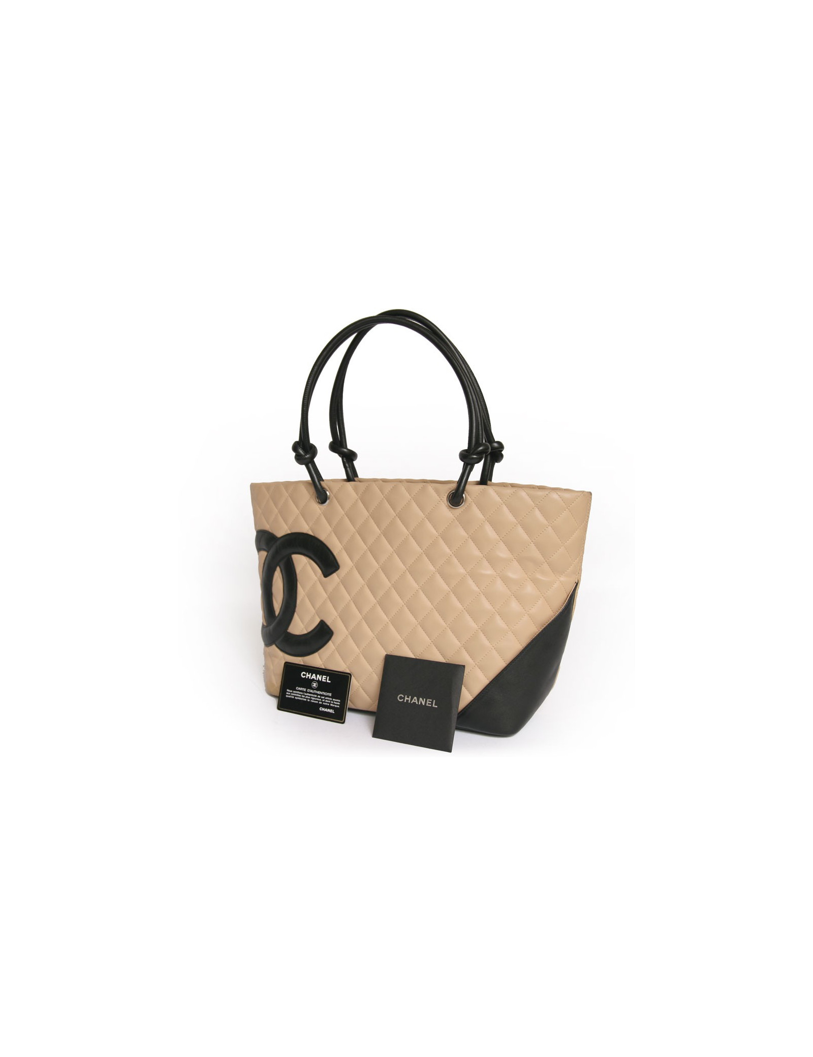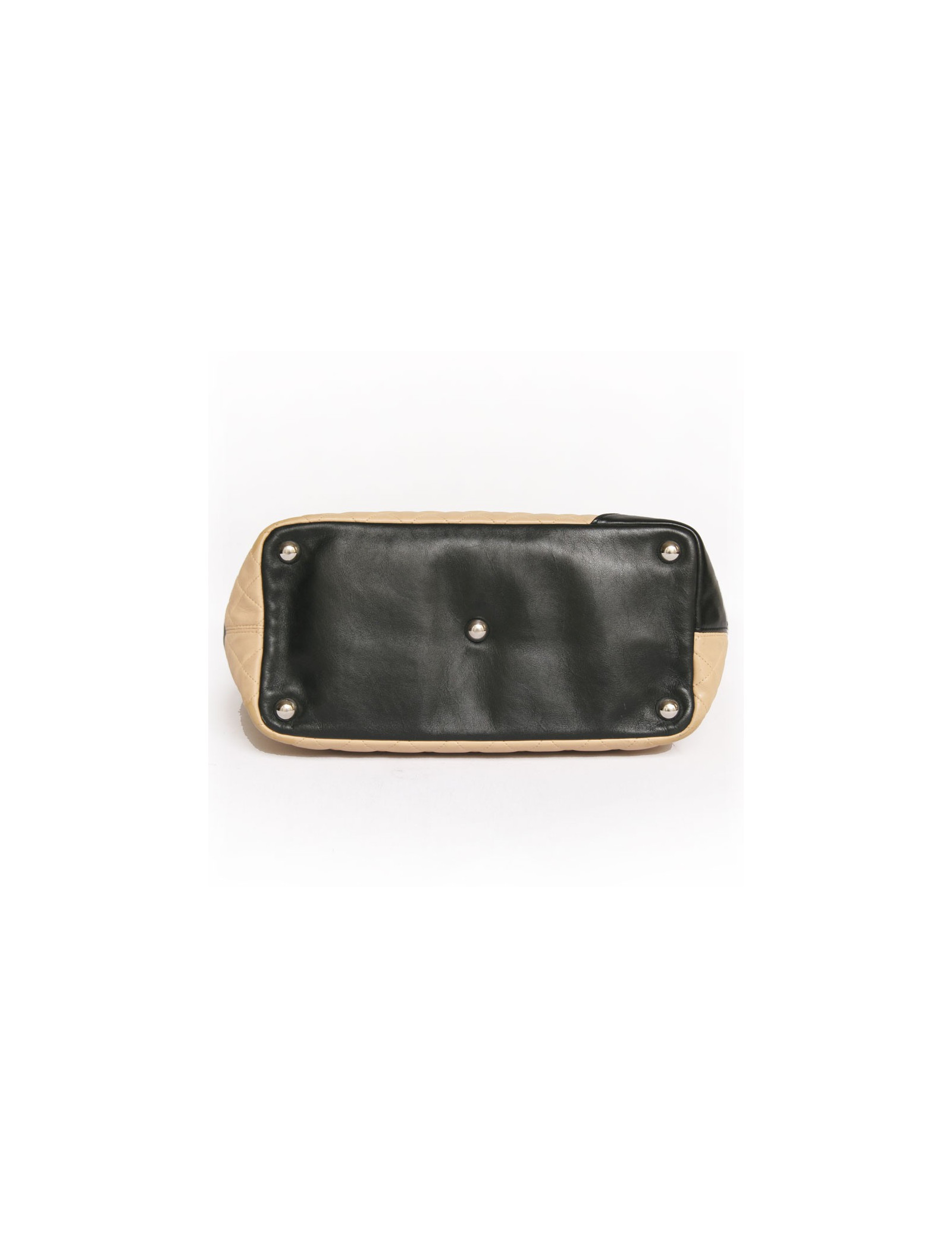 Sac shopping "Cambon" de la Maison Chanel en cuir matelassé bicolore noir et beige. Il se porte à l'épaule avec une double poignée. L'intérieur est en toile noir monogram avec une grande poche zippée. Une poche plaquée à l'arrière du sac. Fermeture zippée. Hologram: 10 ... En bon état. Les coins du sac sont usés ainsi qu'une légère usure sur les bords du sac. Voir photos.