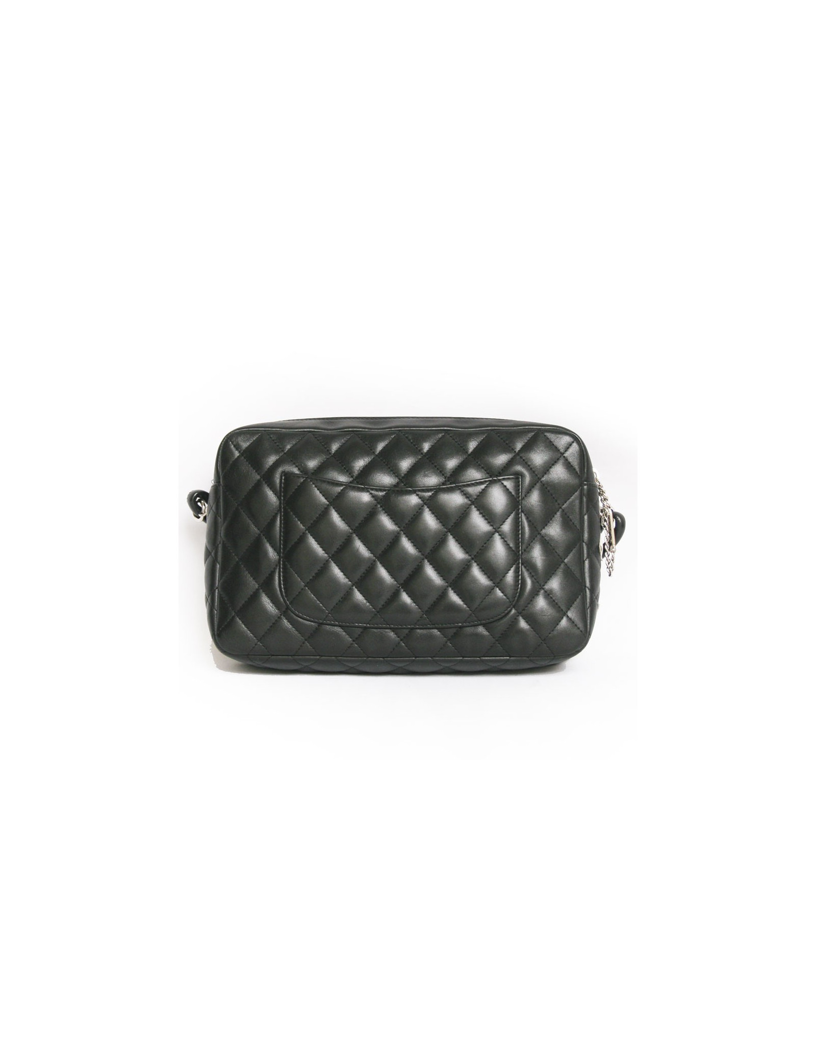 Superbe sac Cambon de la Maison Chanel en cuir matelassé noir. Il se porte de deux facons à l'épaule et en bandoulière. L'intérieur est en toile rose monogrammé avec 4 poches: 1 zippée, 1 pour stylos, 1 pour smartphone et 1 grande poche plate. Fermeture zippée. L'accastillage est en métal argenté. Il y a également une poche plate à l'avant avec un fermoir CC ainsi qu'une à l'arrière. Carte d'authenticité - Hologram :9891.... En très bon état.