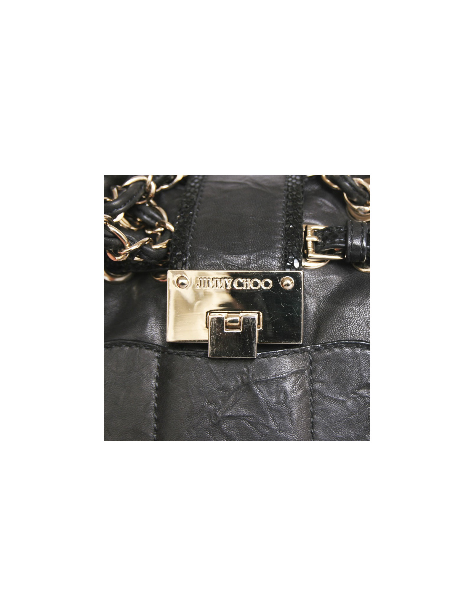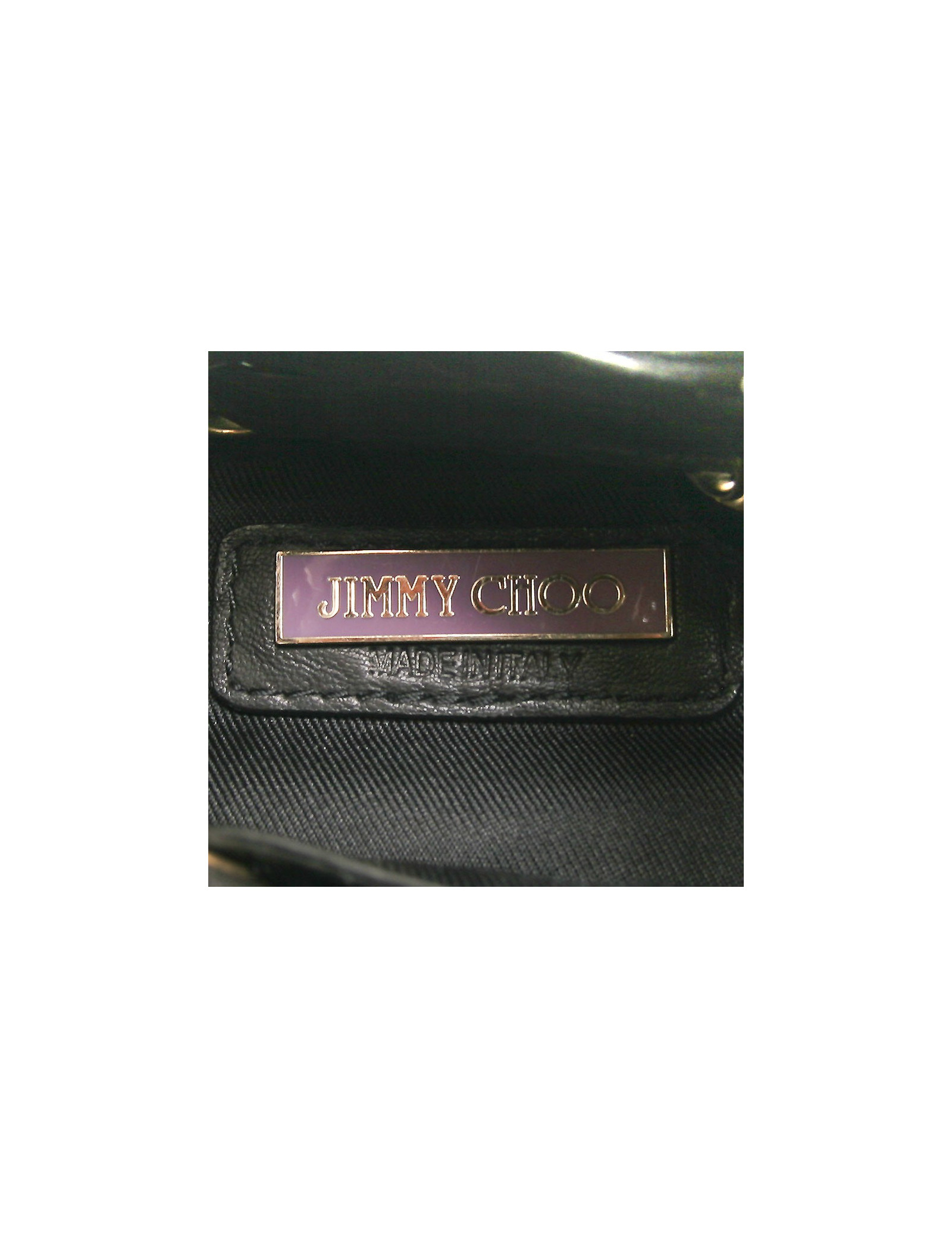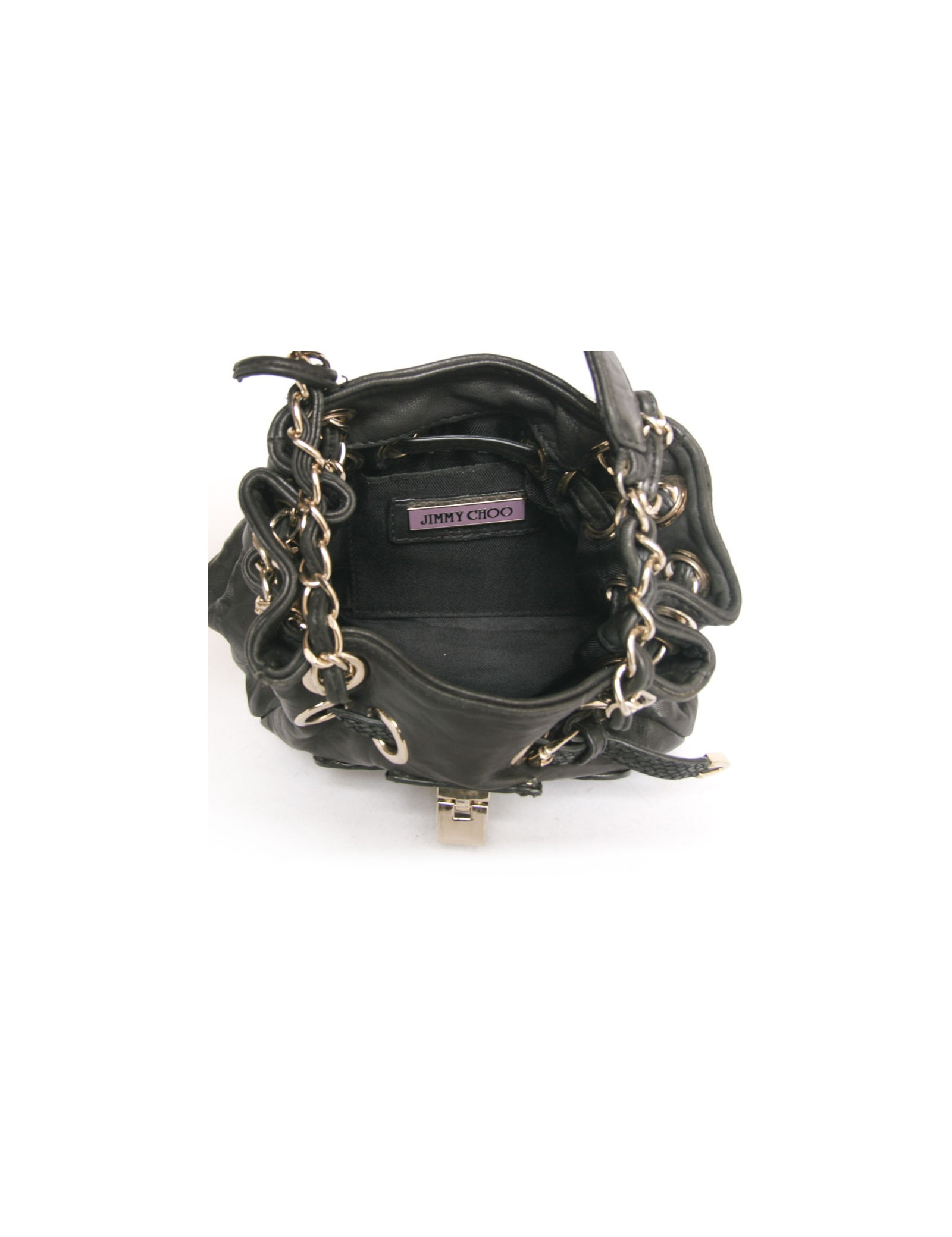 Mini sac Jimmy Choo en cuir noir et serpent. Il se porte à la main à l'aide d'une anse en chaine doré et cuir de la même couleur que le sac. L'accastillage est en métal doré. L'intérieur est en tissu noir avec une petite poche. En très bon état. Légère patine du cuir sur les coutures à l'avant du sac.