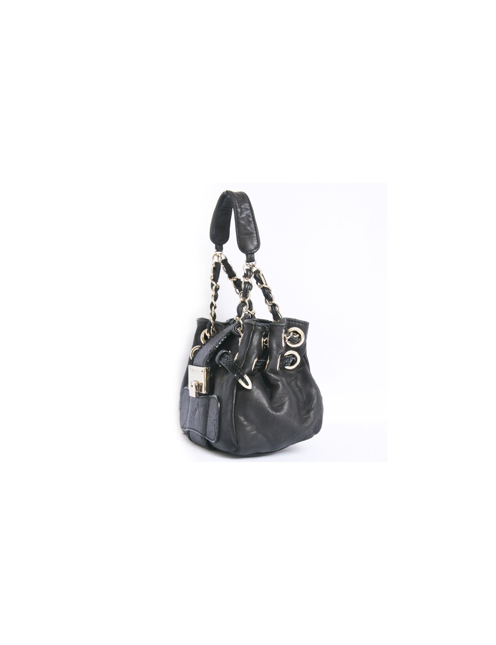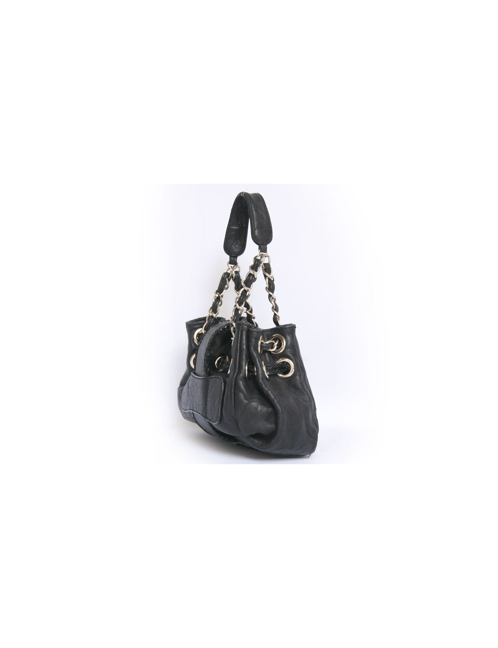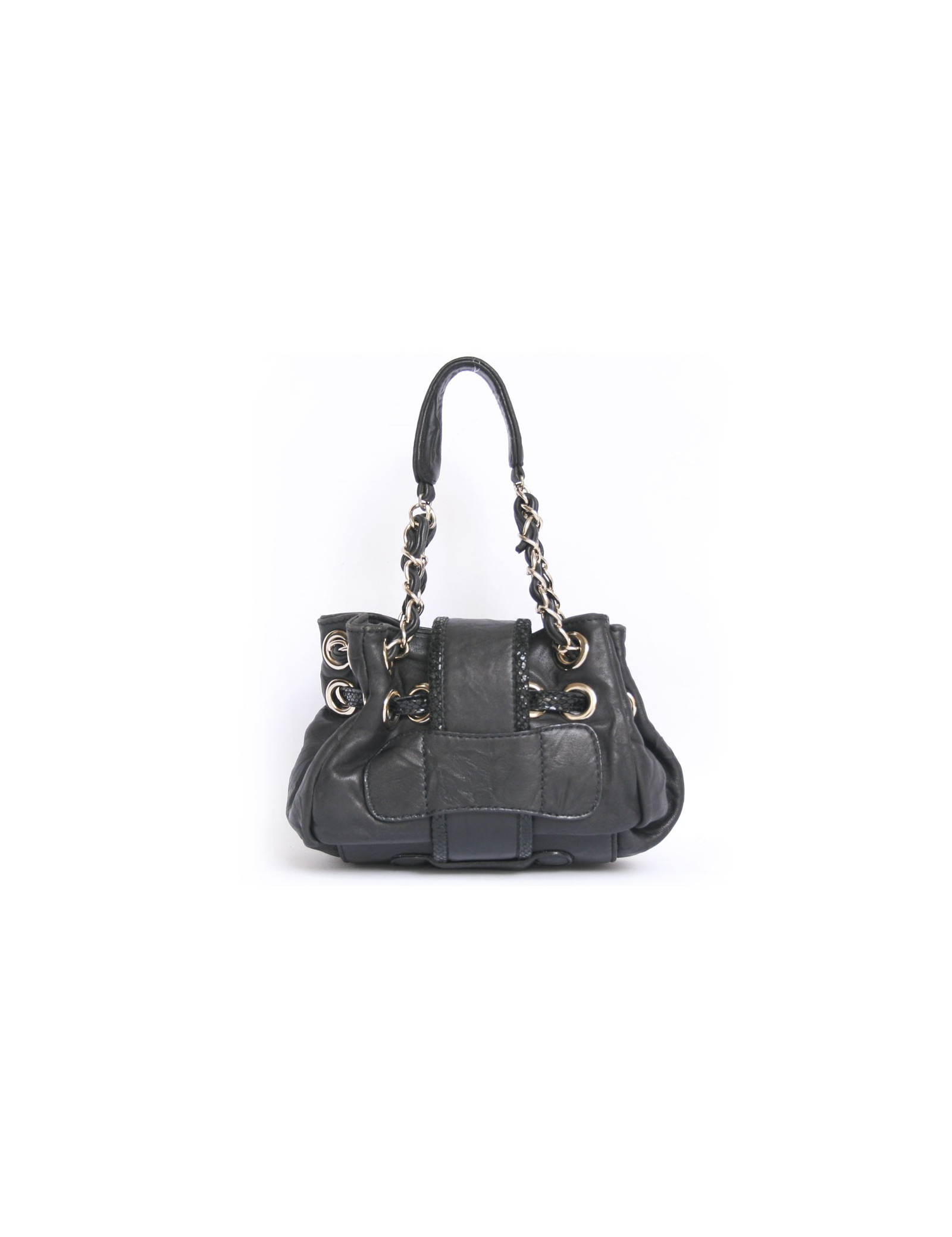 Mini sac Jimmy Choo en cuir noir et serpent. Il se porte à la main à l'aide d'une anse en chaine doré et cuir de la même couleur que le sac. L'accastillage est en métal doré. L'intérieur est en tissu noir avec une petite poche. En très bon état. Légère patine du cuir sur les coutures à l'avant du sac.