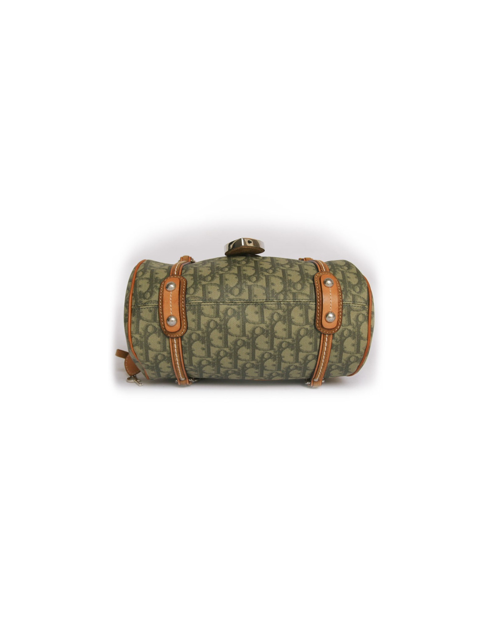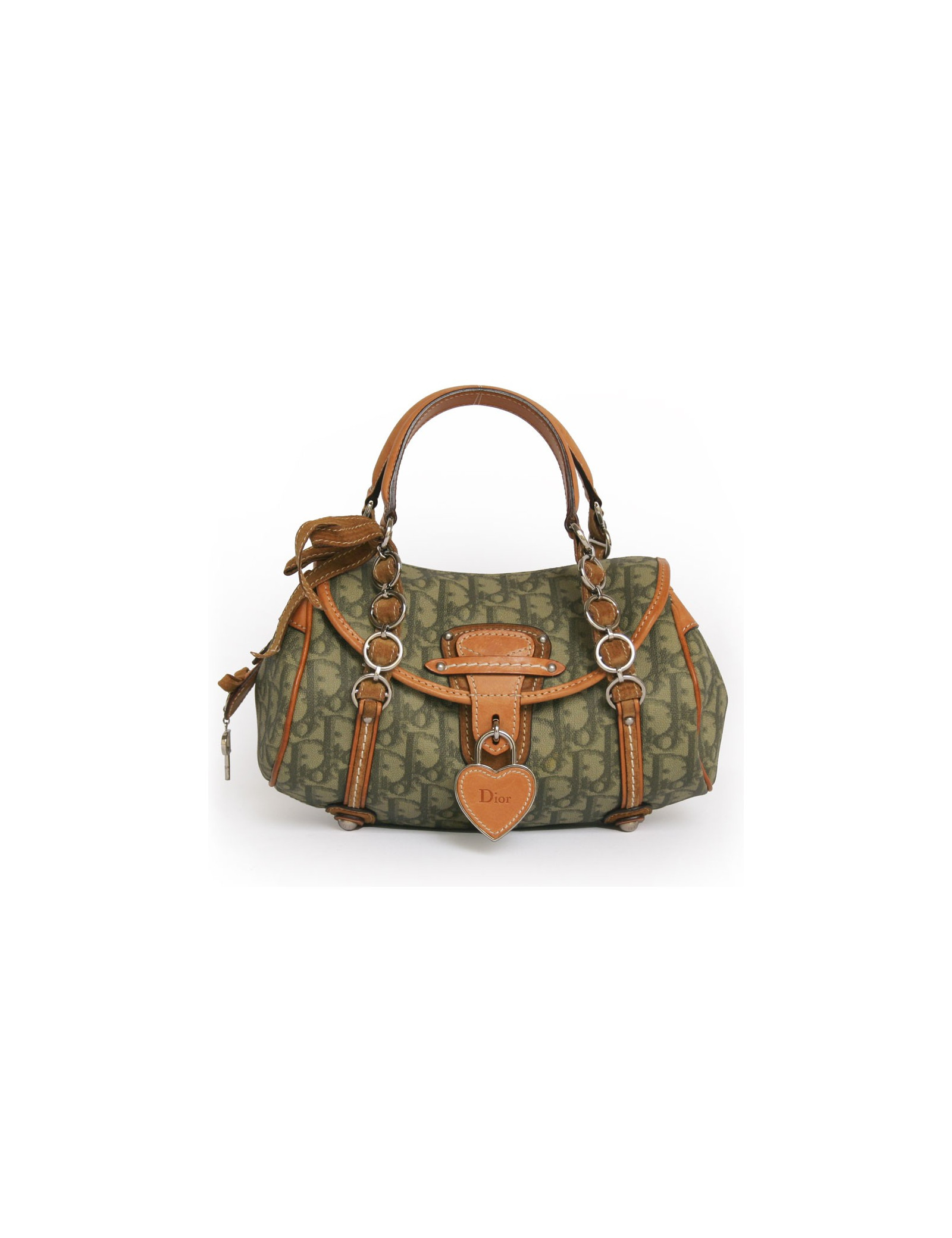Mini sac Christian Dior en toile enduite monogram vert kaki. La bijouterie est en métal argenté. L'intérieur est en satin beige avec une poche zippée. Fermeture pression. Provient des soldes. Cadenas coeur et clef. En très bon état.