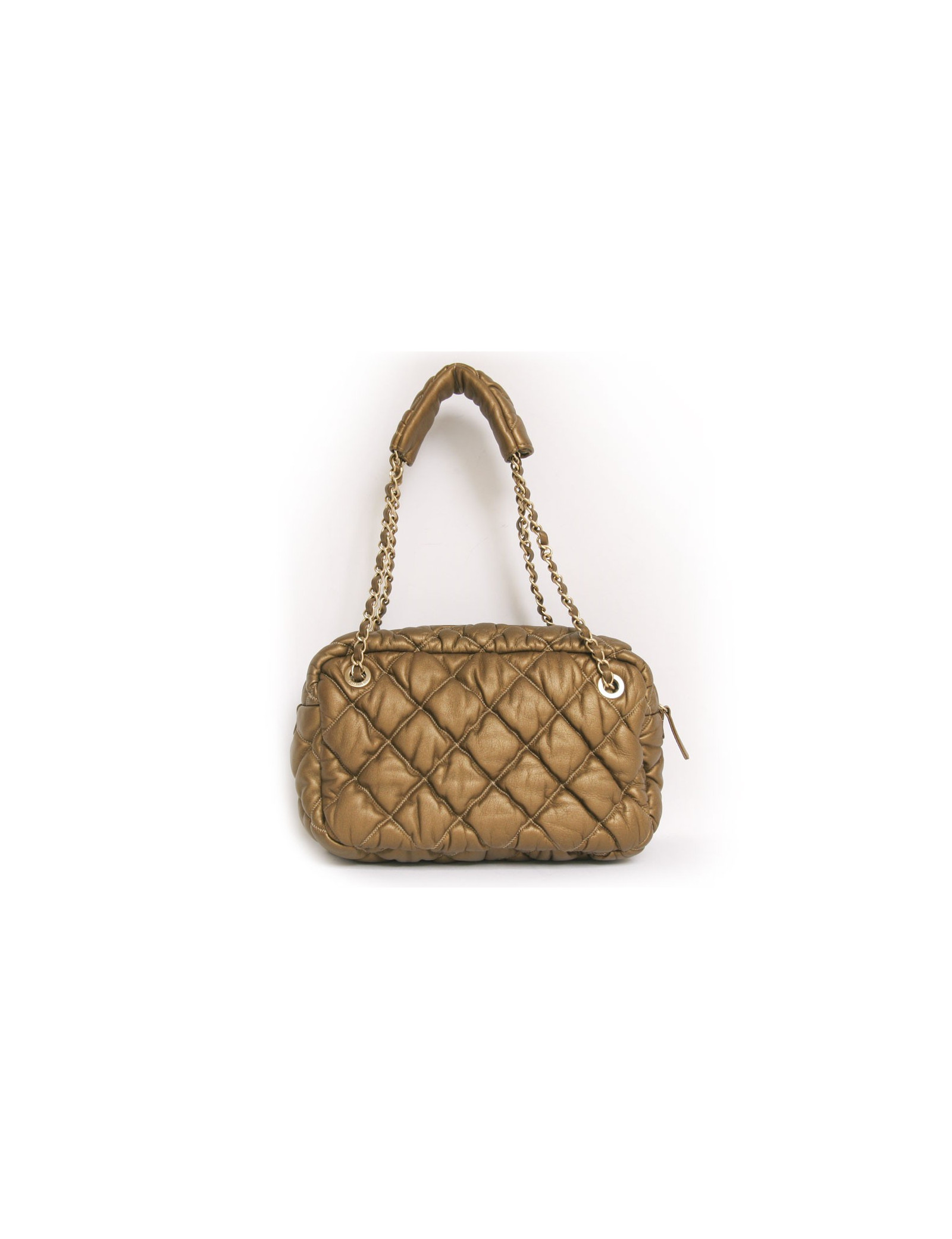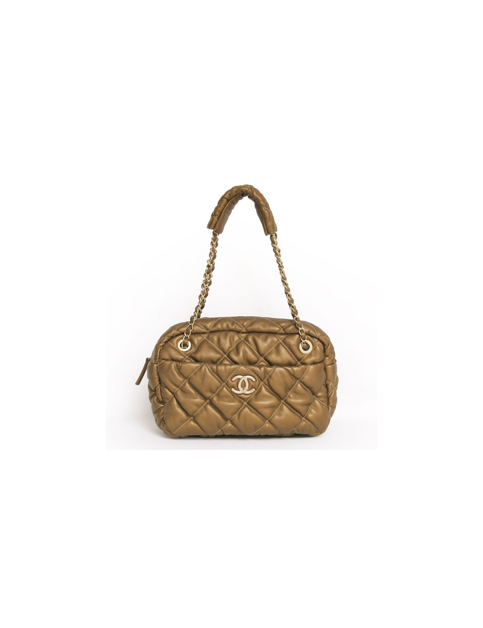 Sac Chanel en cuir d'agneau matelassé de couleur bronze. La bijouterie est en laiton doré. Fermeture zippée. L'intérieur est en tissu beige avec 3 poches dont une zippée. Il y a également une poche à l'avant du sac. Il se porte à l'épaule à l'aide d'une double anse en cuir bronze et chaine doré. Provient des soldes. En très bon état.