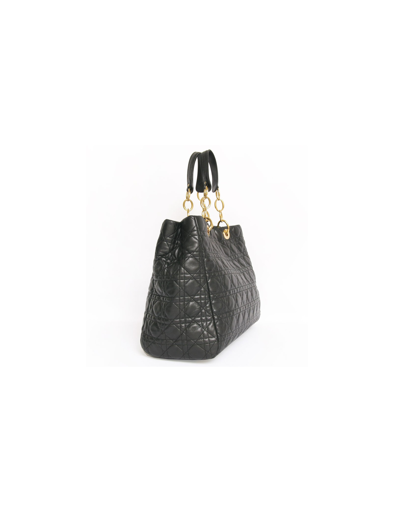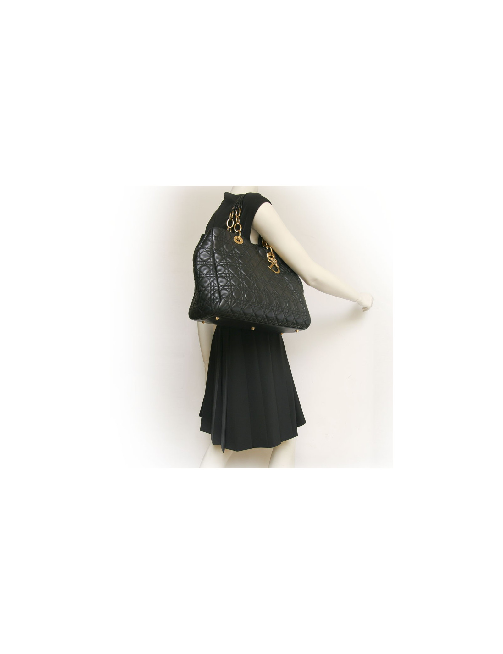 Sac cabas de la Maison Christian Dior en cuir à cannage noir. La bijouterie est en métal doré. Fermeture aimantée. L'intérieur est en toile noire monogram avec deux espaces de rangement séparés par une grande poche zippée. Il y a 3 poches dont une zippée. Double poignée. En très bon état. Carte d'authenticité.
