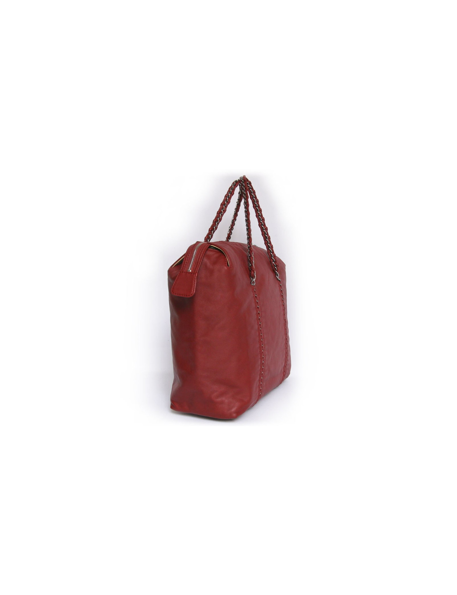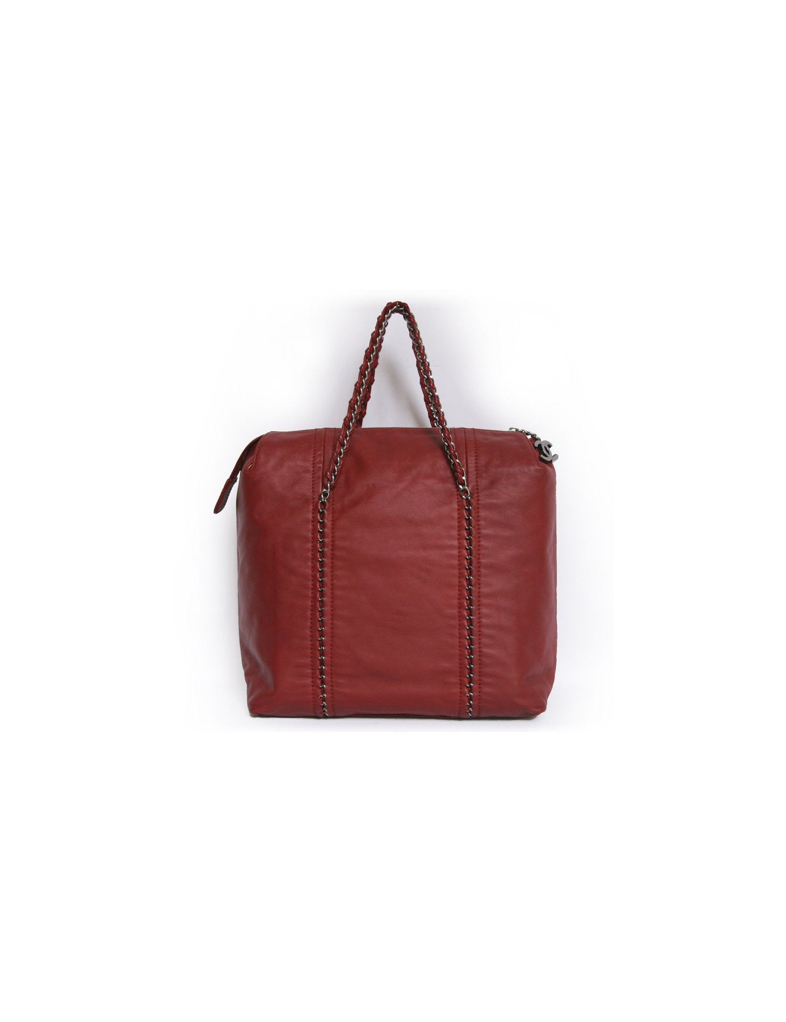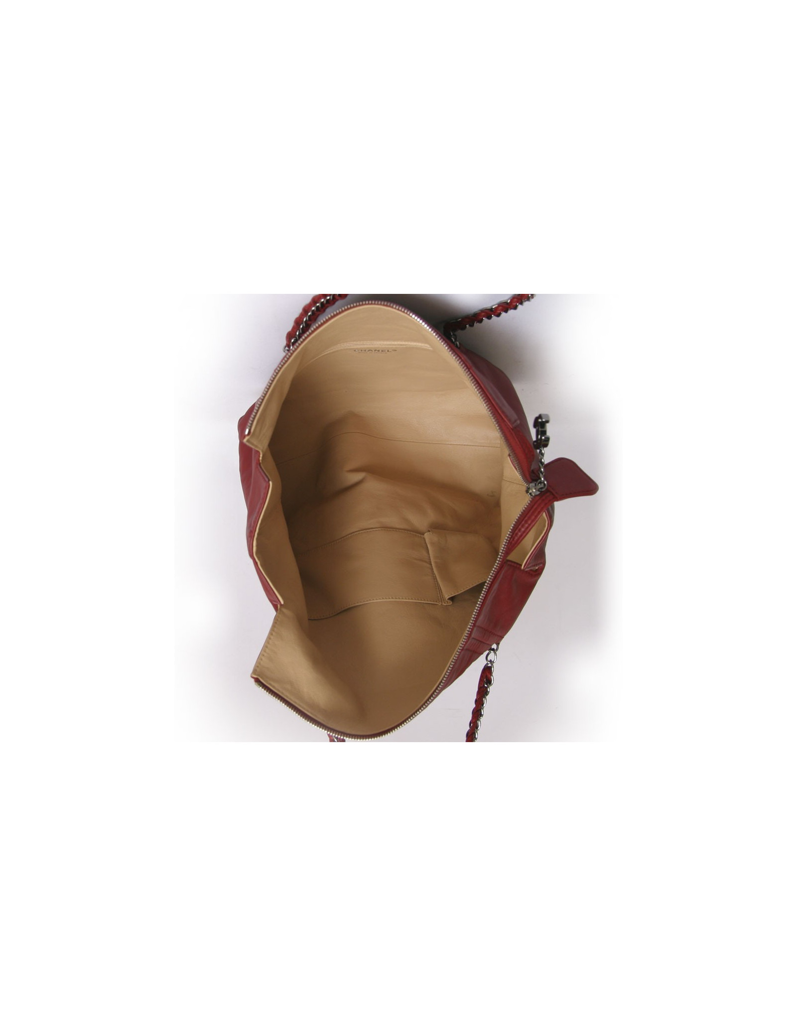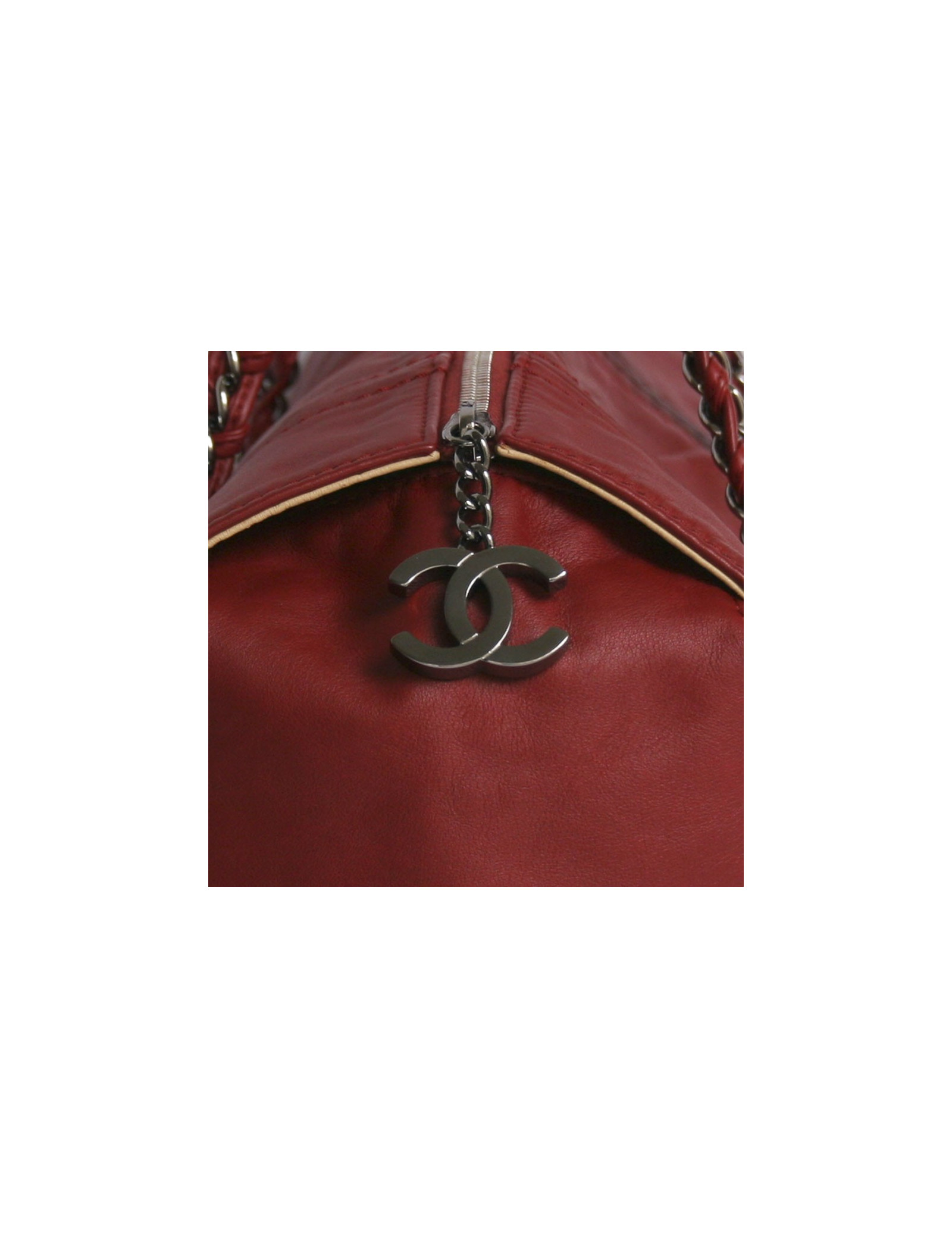 Sac cabas Chanel en cuir d'agneau bordeaux. Il se porte au bras et à la main à l'aide d'une double poignées en chaine argenté et cuir de la meme couleur que le sac. Fermeture zippée. L'intérieur est en cuir beige avec 3 poches dont 1 zippée. Provient des soldes. En très bon état.