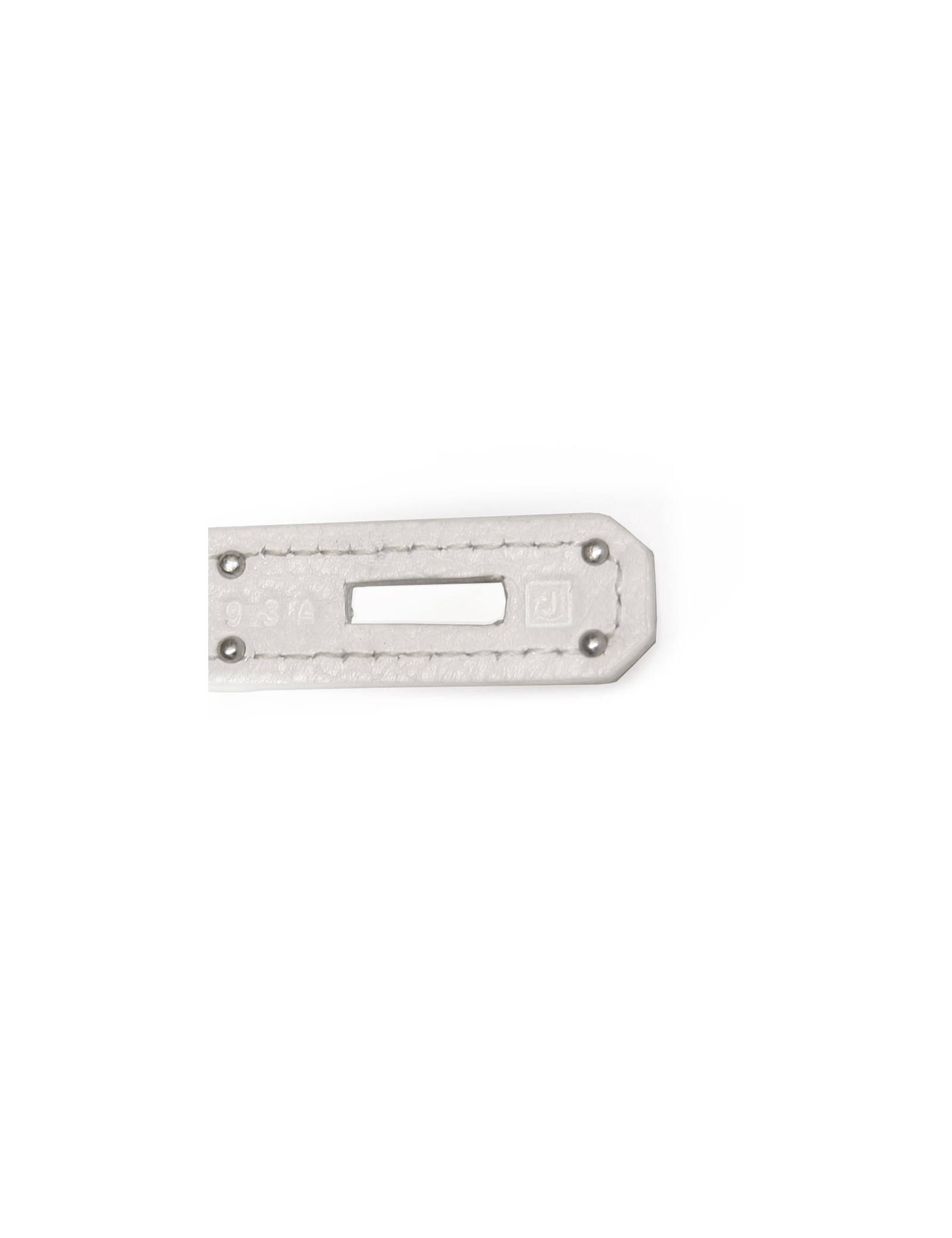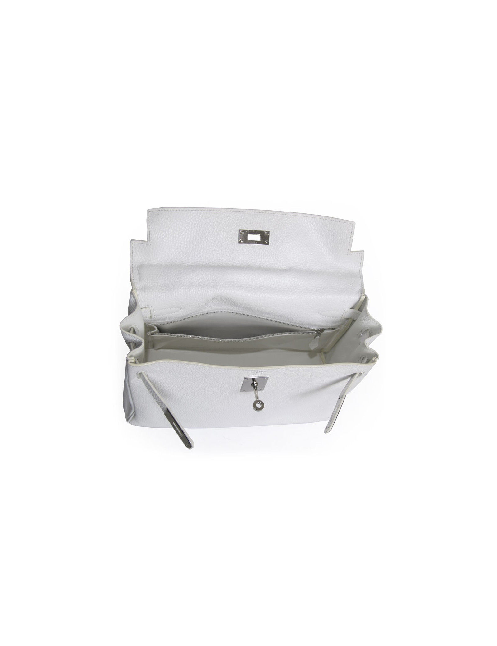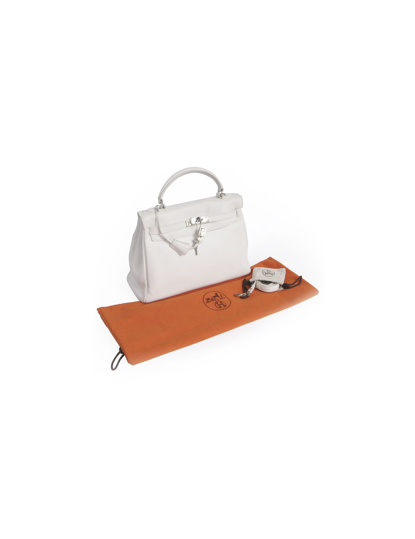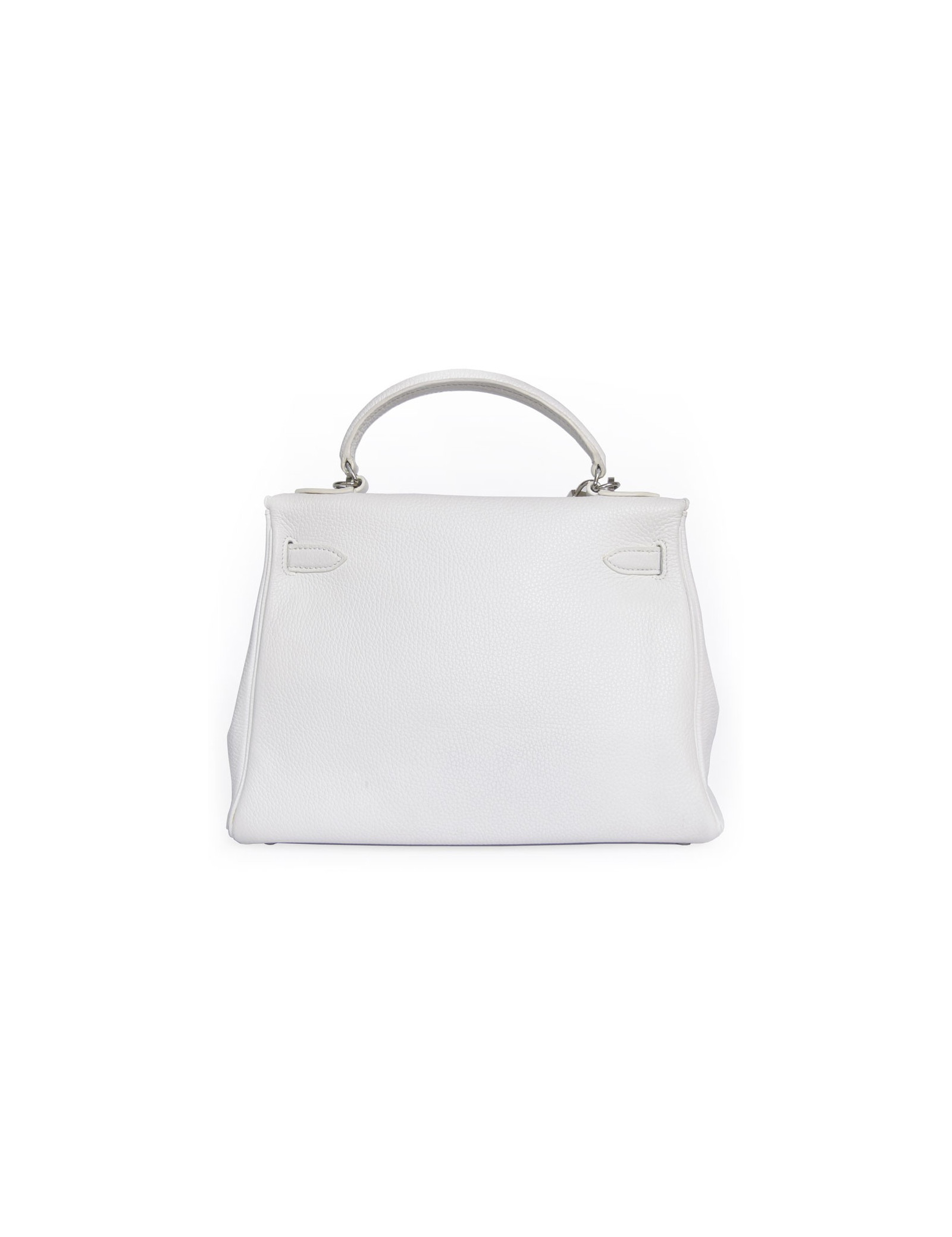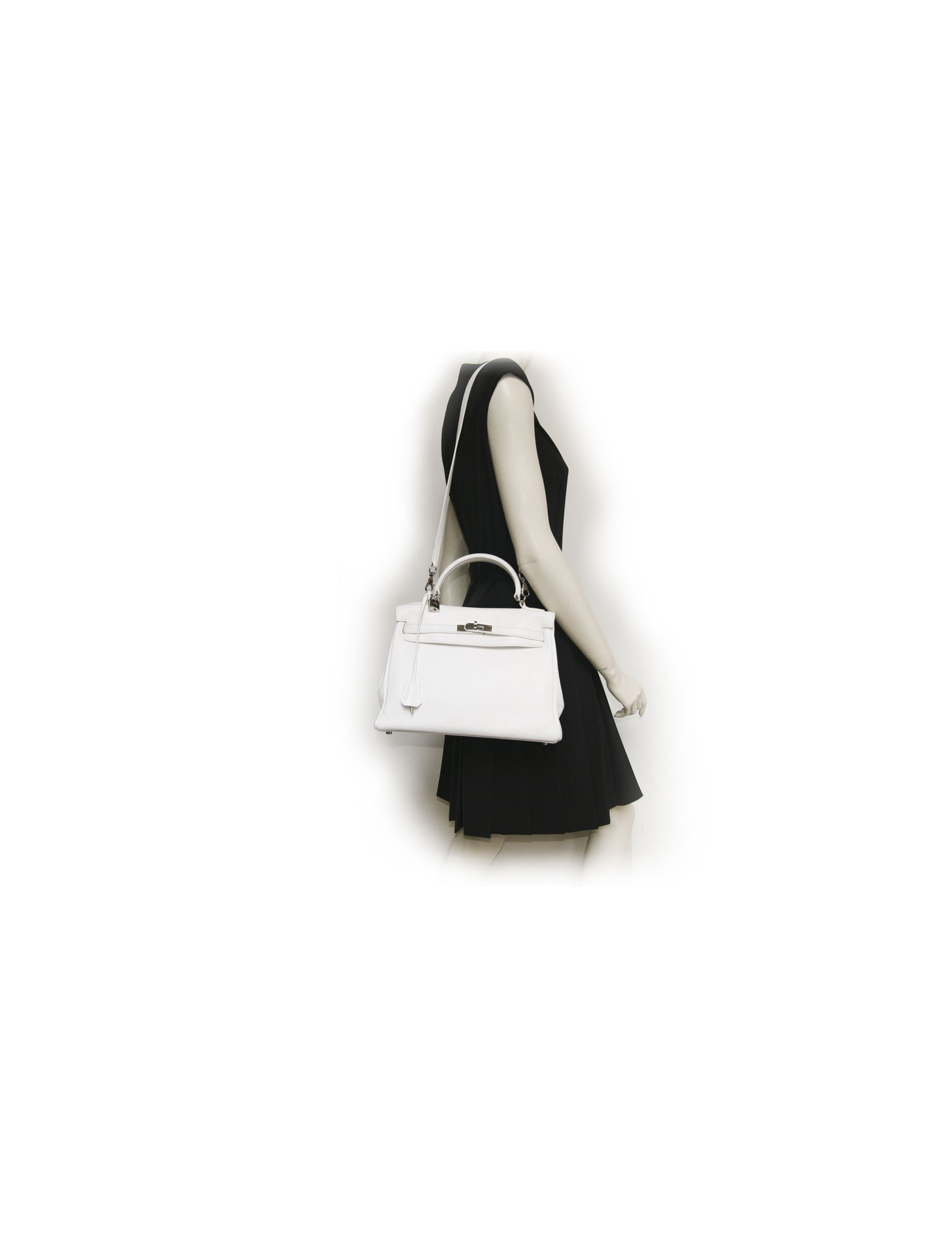 Sac Kelly II, 32 en cuir taurillon clémence blanc Hermès. Il se porte à la main ainsi qu'à l'épaule à l'aide d'une bandoulière amovible. La bijouteries est en palladium. Cadenas, clochette et clefs. A l'intérieur, 3 poches dont 1 grande zippée. Lettre J dans un carré. En très bon état.