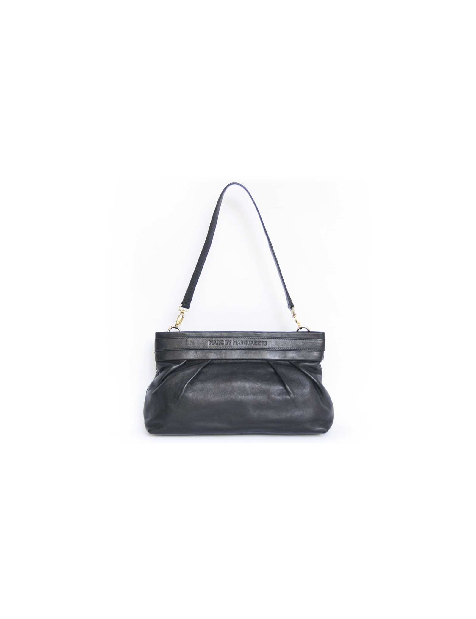 Sac / pochette en cuir noir Marc by Marc Jacobs. Il peut soit se porter à l'épaule à l'aide d'une bandoulière amovible ou à la main en pochette. Les ferrures sont en métal doré. Fermeture zippée. L'intérieur est en toile noire avec deux poches, une pour smartphone et une zippée. En très bon état.