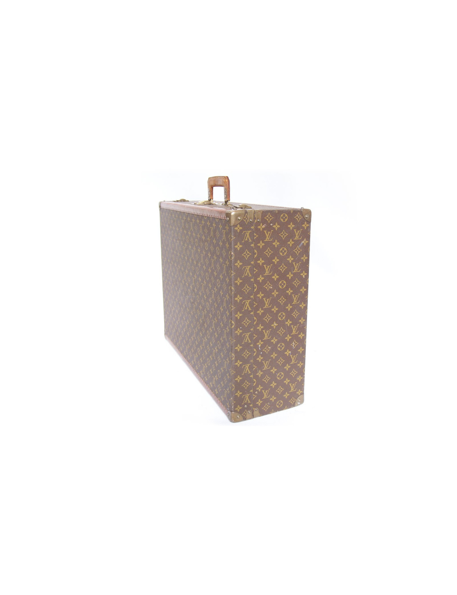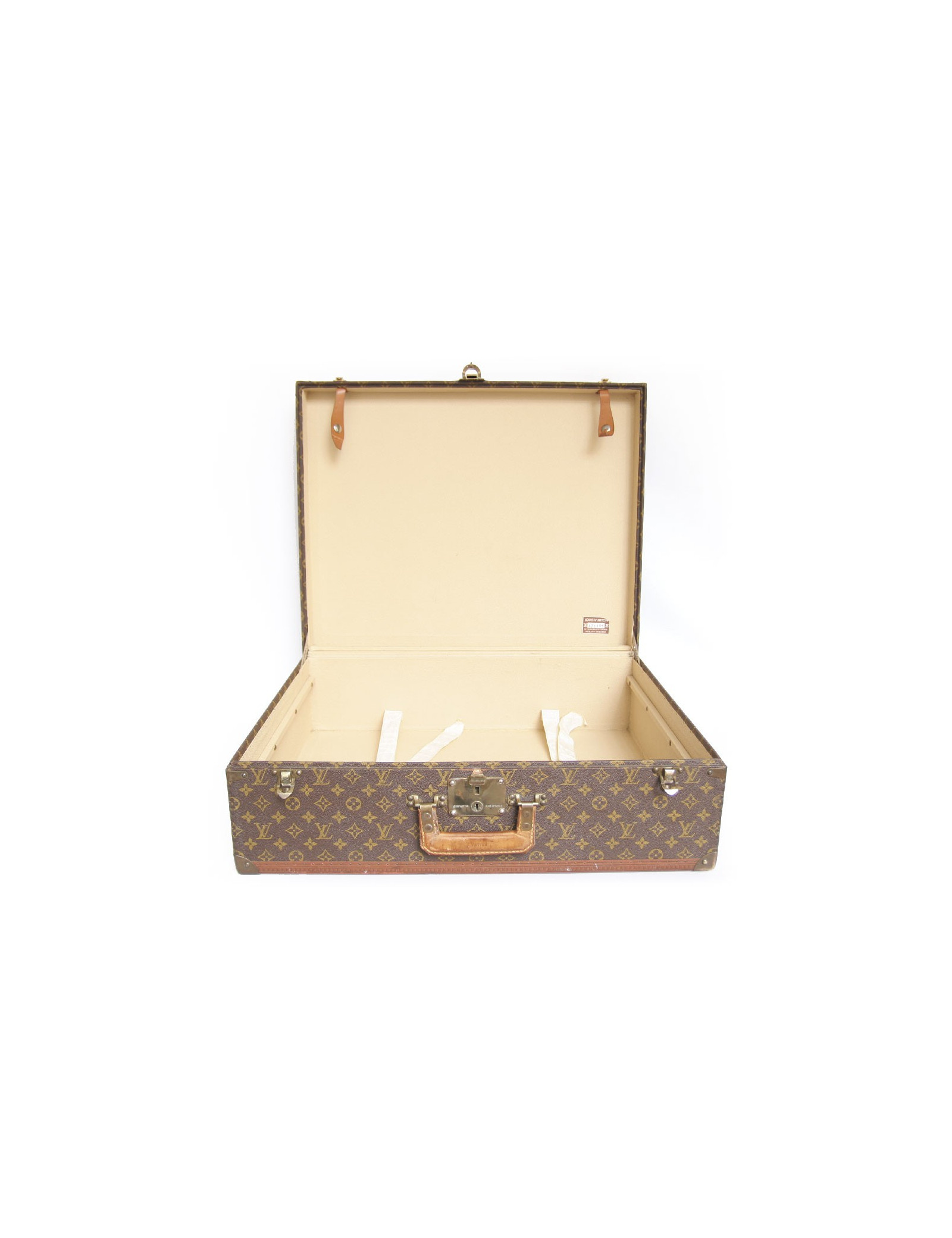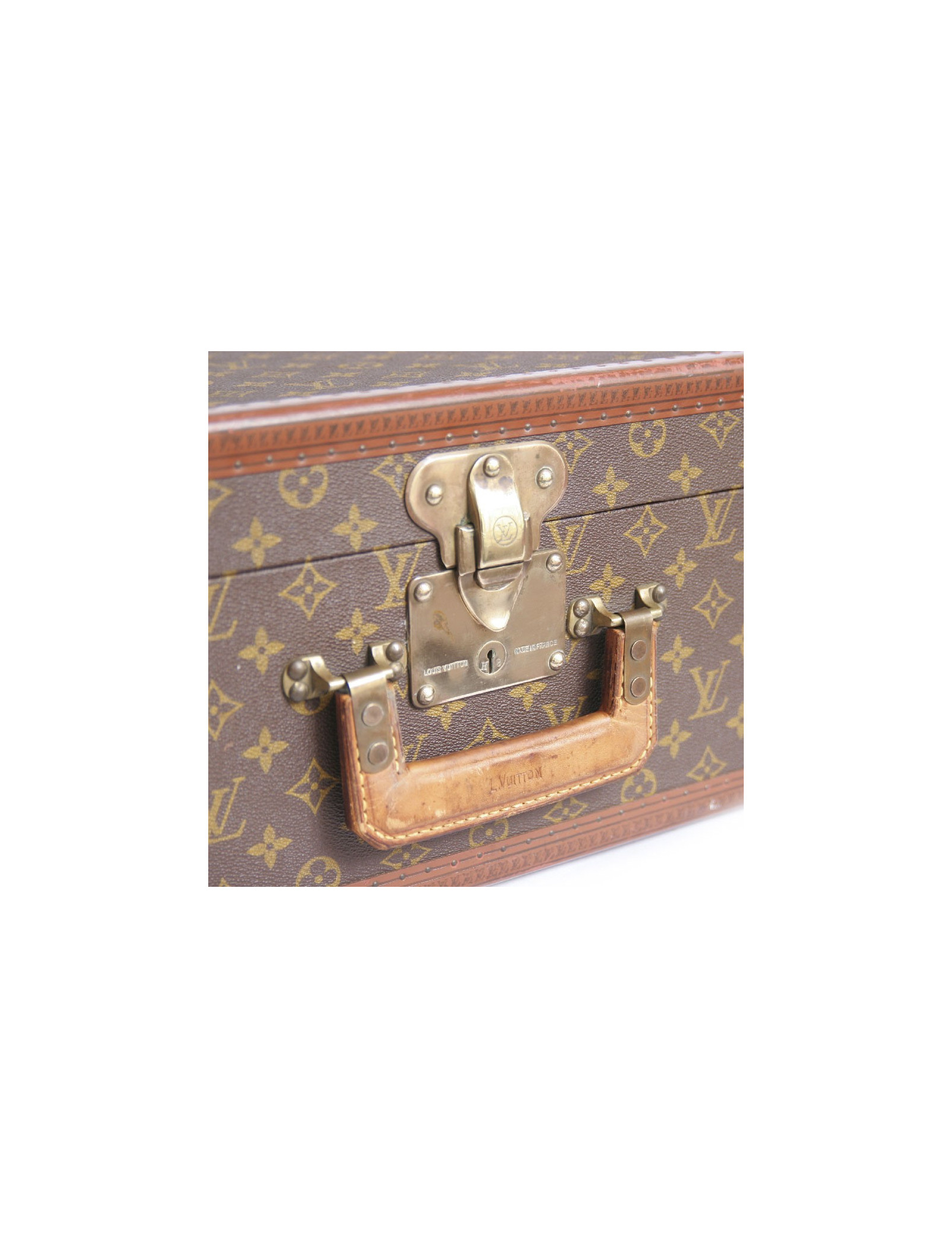 Valise rigide Alzer de la Maison Louis Vuitton en toile Monogram, un caisson à deux sangles, coins et garniture en laiton. Il manque le porte étiquette et ses deux clés. Numéro d'authencité 875695. Excellent état, légère patine du cuir sur les bordures de la valise ainsi que quelques marques d'usures. Voir photos.
