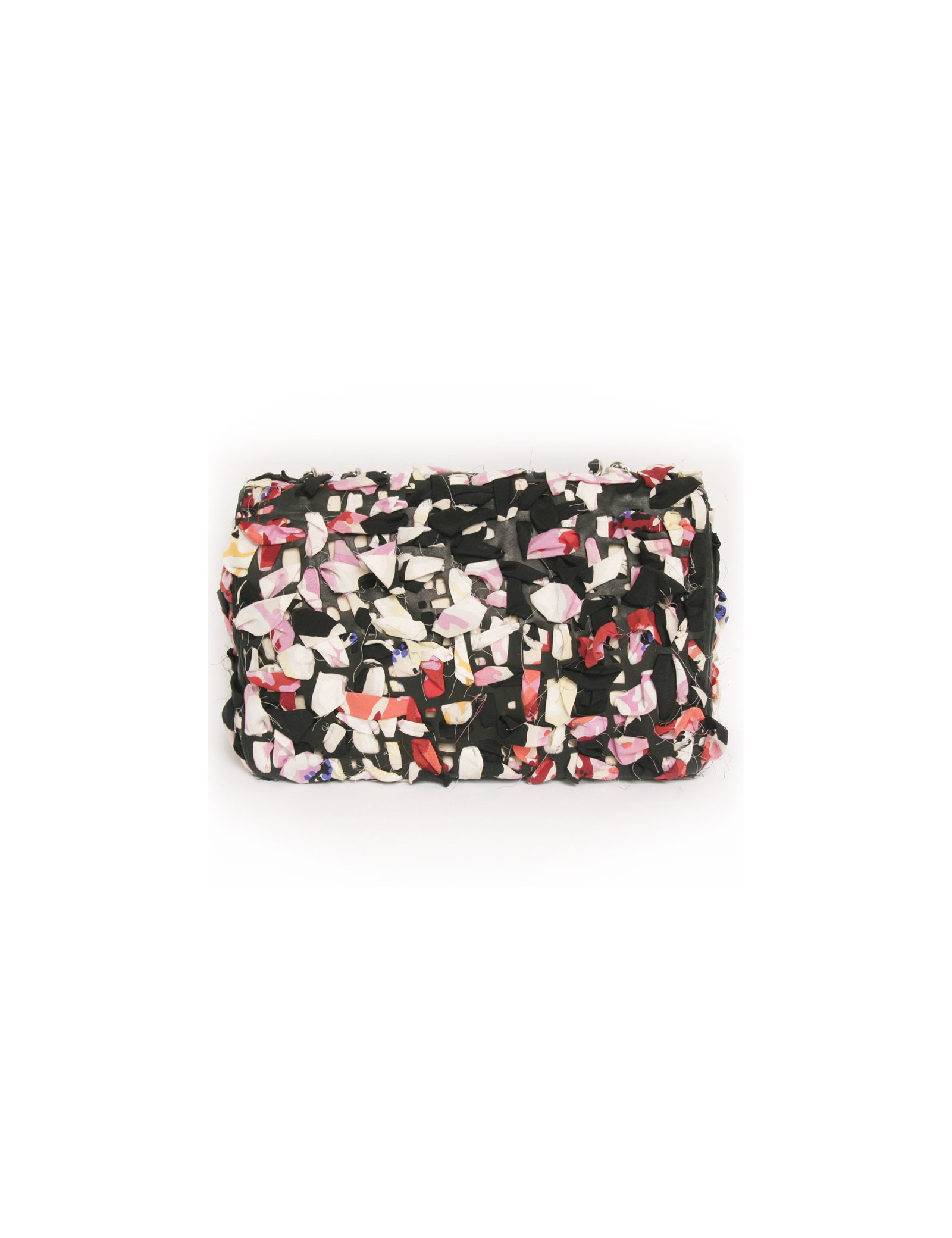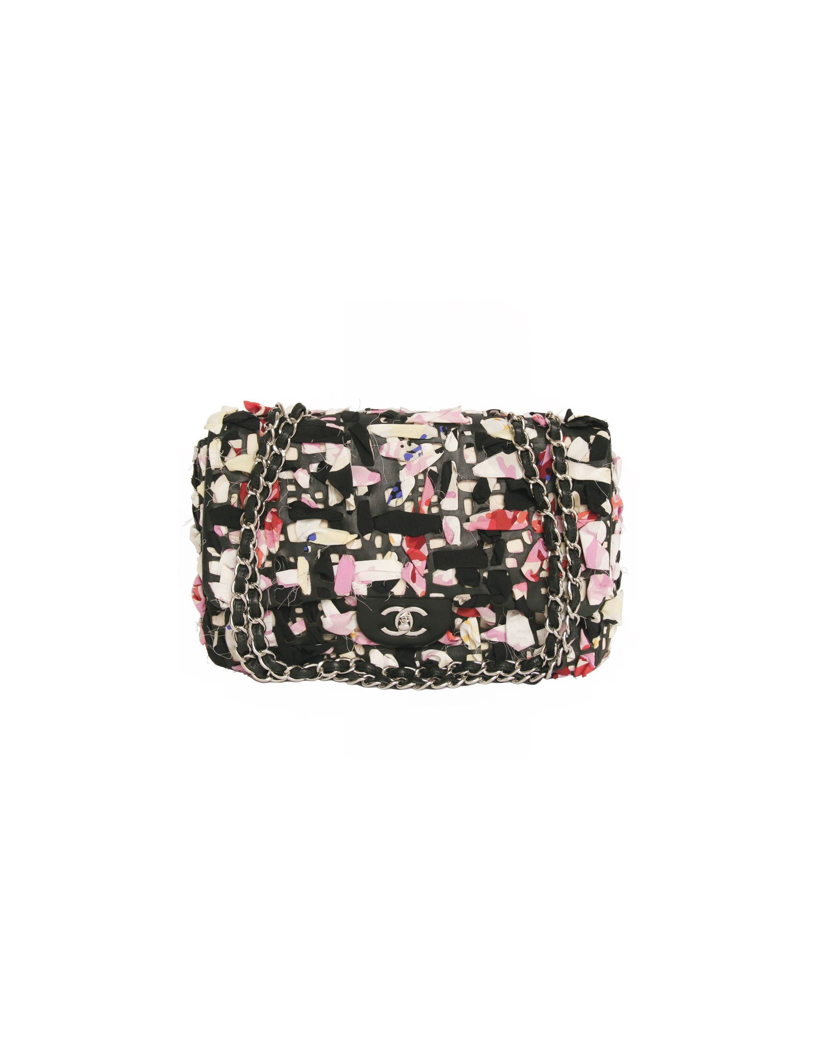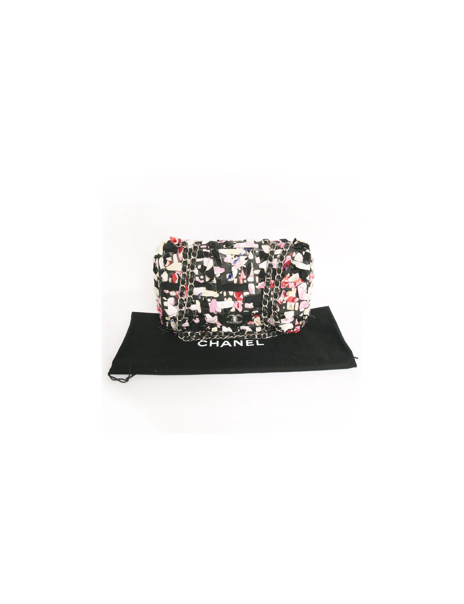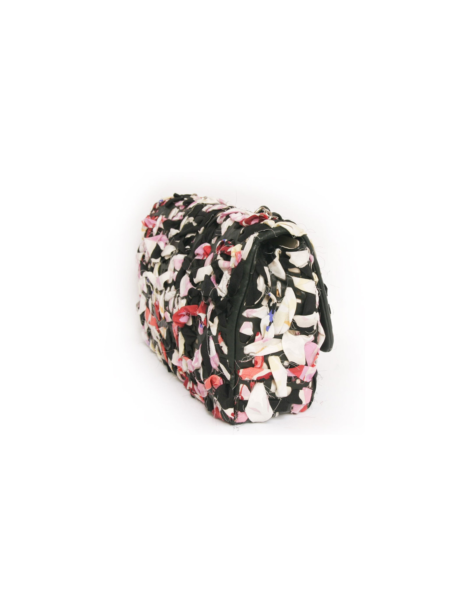 Sac Timeless de la Maison Chanel en cuir et bandes de tissu multicolores. Entrelaçements des bandes de tissu avec du cuir noir. Fermoir "CC". La bijouterie est en métal argenté. L'intérieur est en toile beige avec deux poches plaquées dont une zippée. En très bon état.