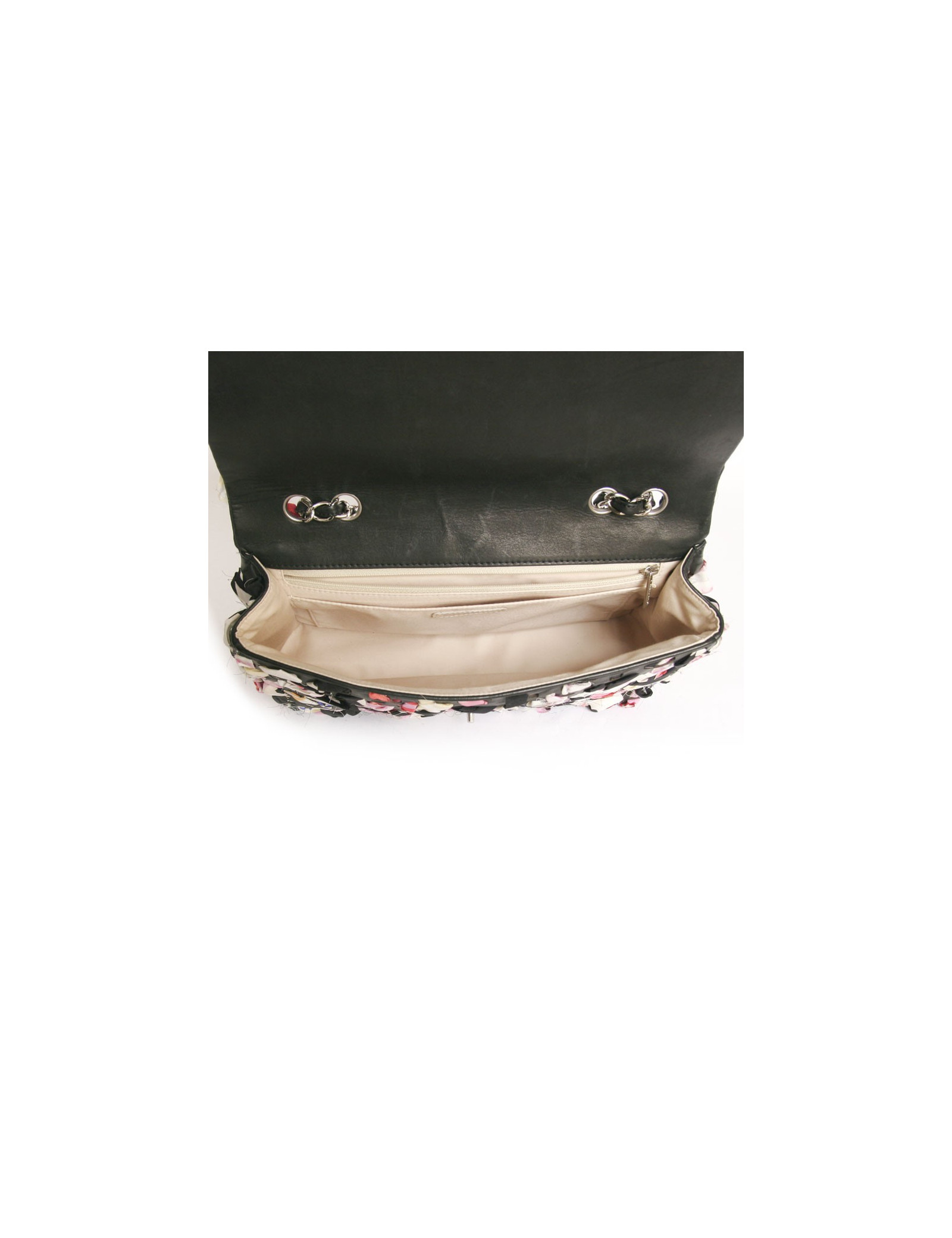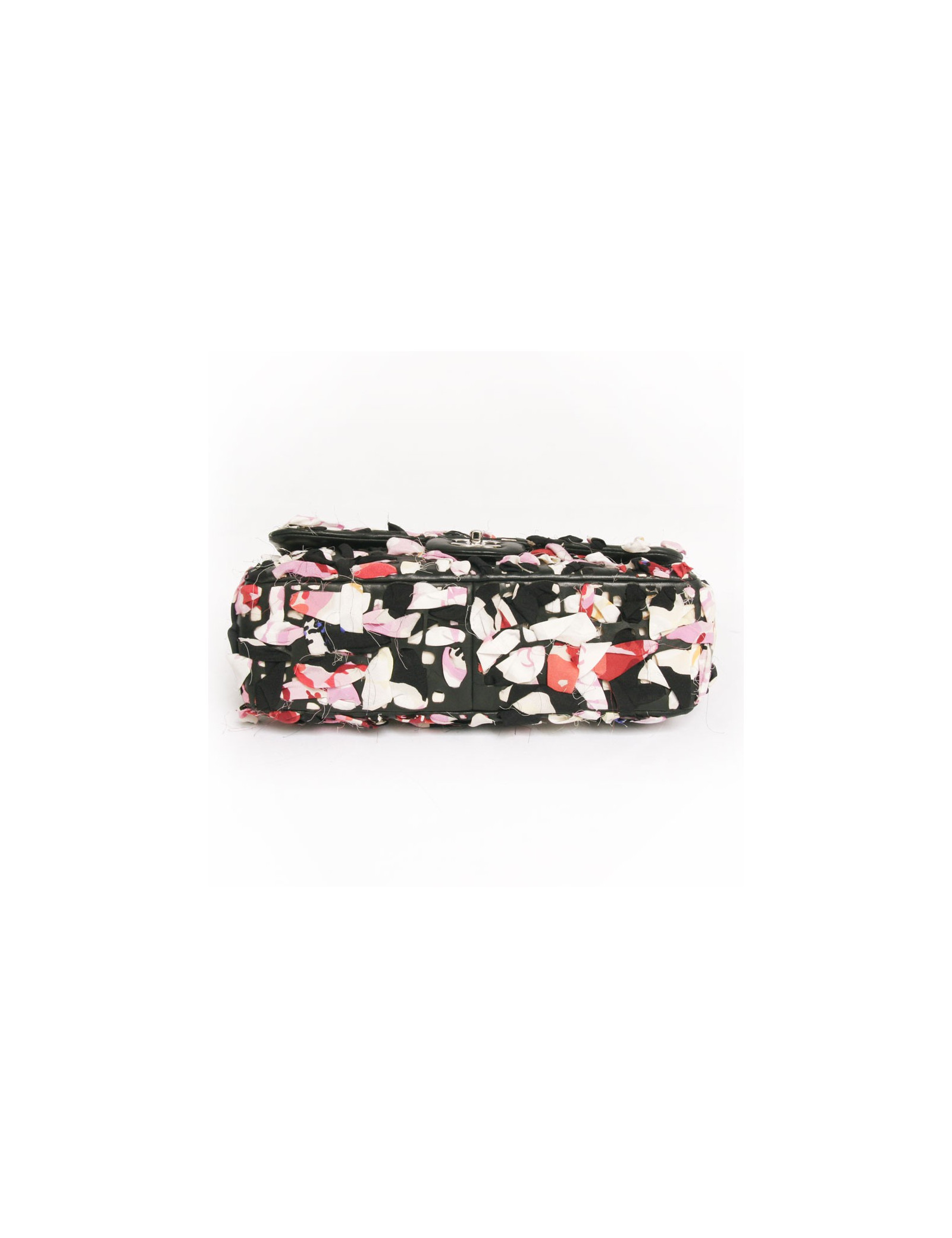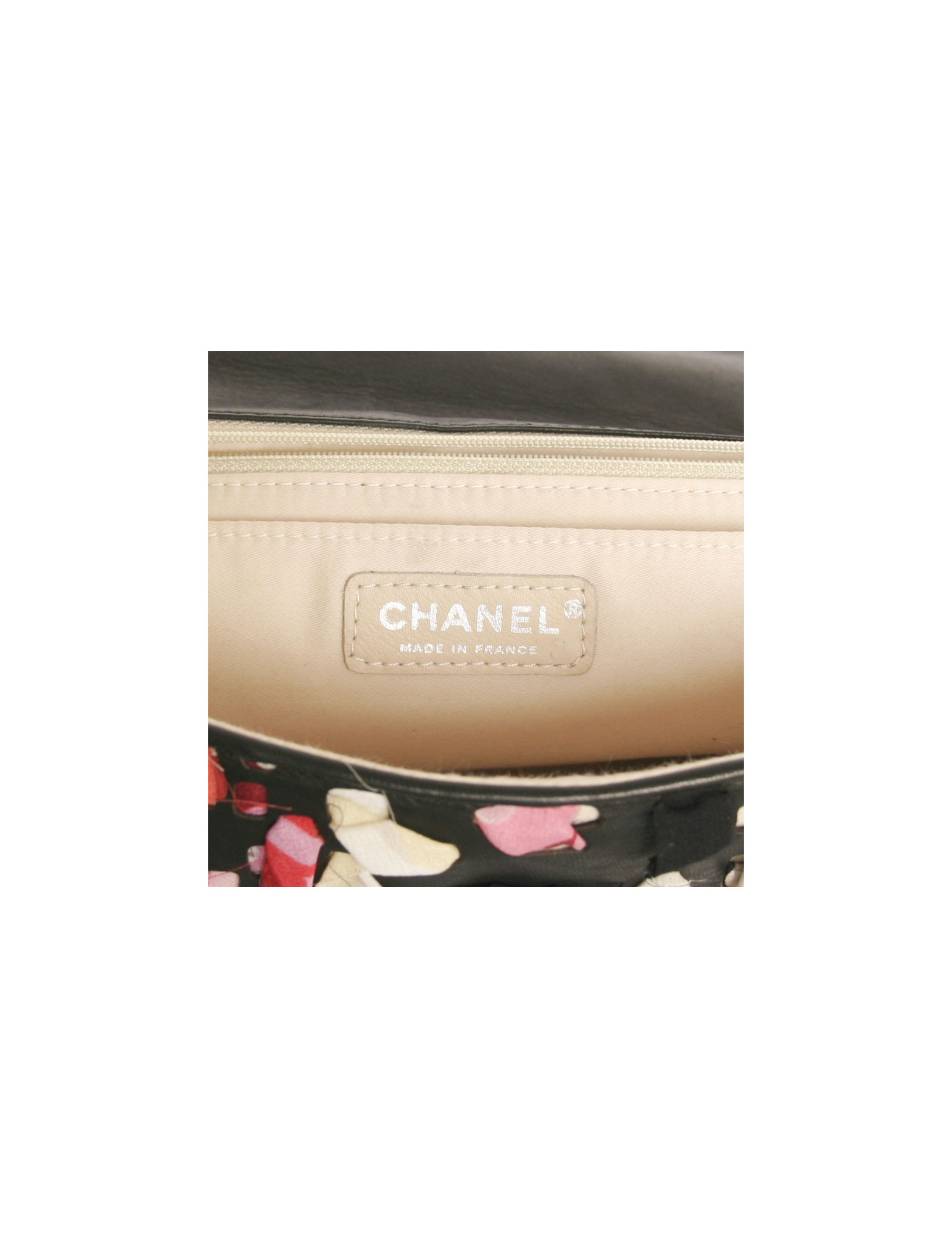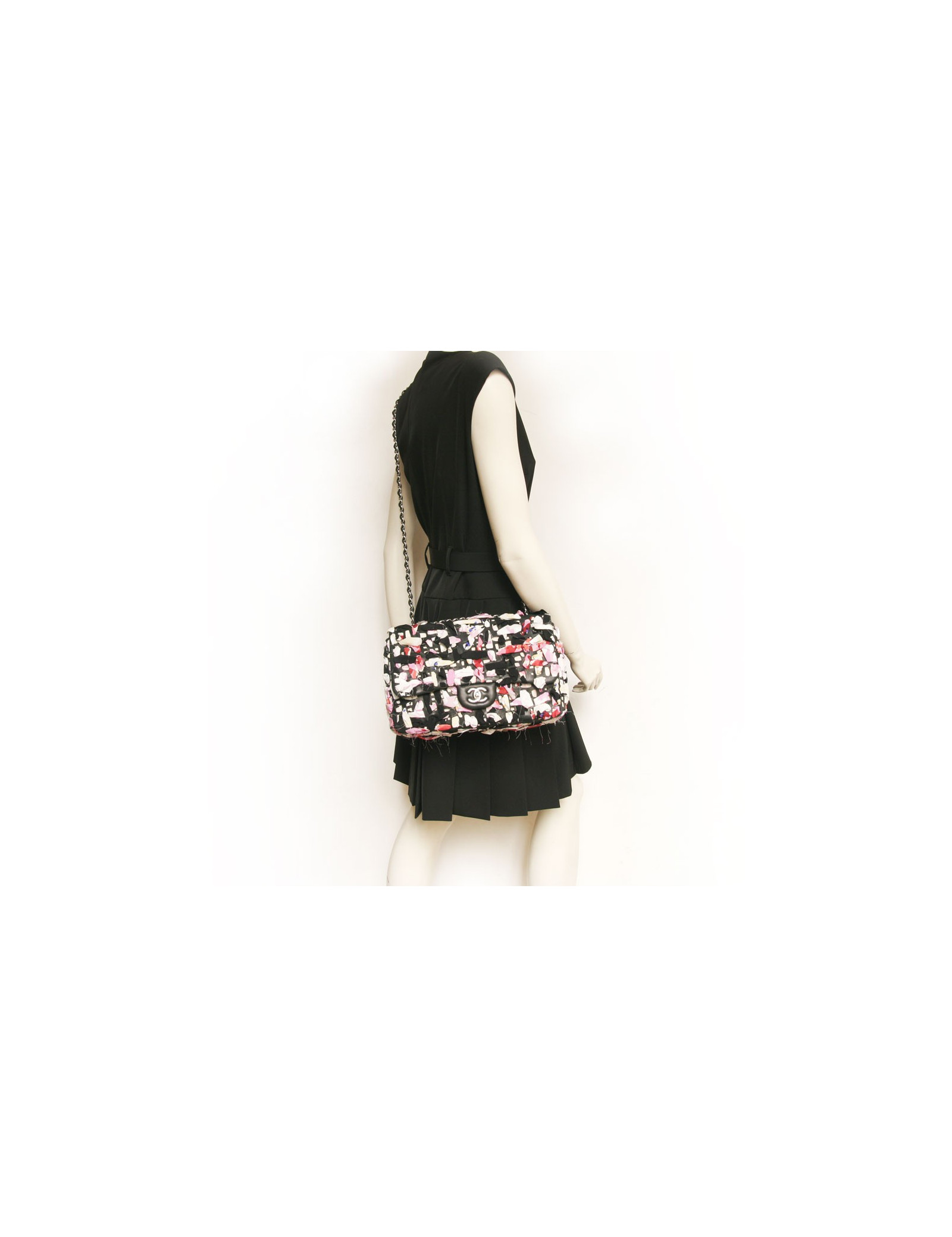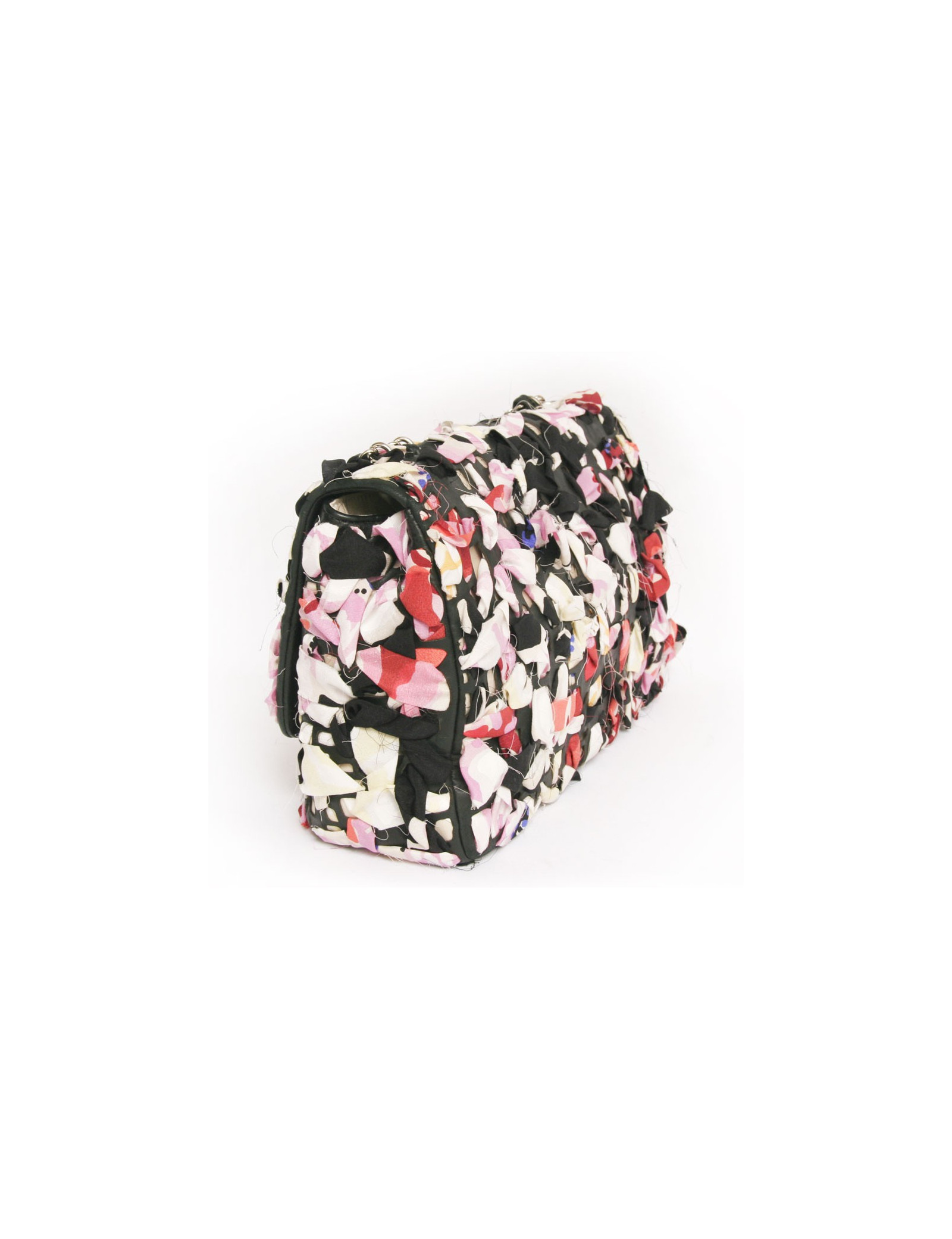 Sac Timeless de la Maison Chanel en cuir et bandes de tissu multicolores. Entrelaçements des bandes de tissu avec du cuir noir. Fermoir "CC". La bijouterie est en métal argenté. L'intérieur est en toile beige avec deux poches plaquées dont une zippée. En très bon état.