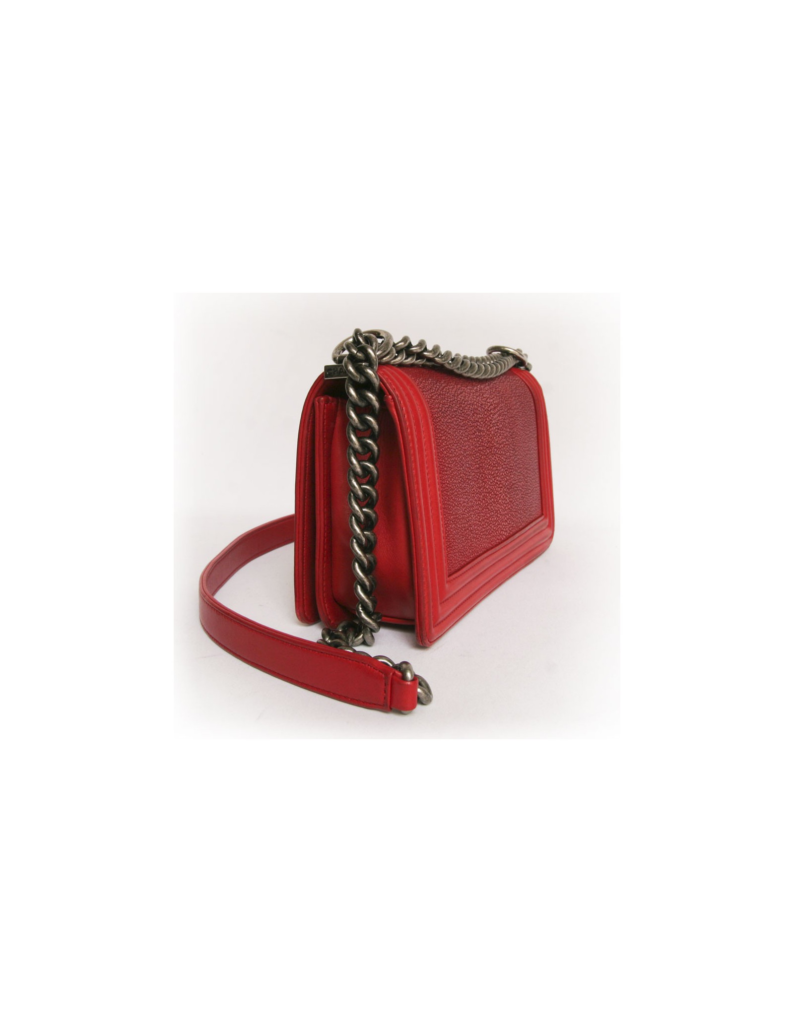 Mythique sac "Boy" de la Maison Chanel en cuir et galuchat rouge. L'anse est en chaîne argent vieilli et cuir rouge. Fermeture rabat et bouton poussoir iconique. Les bordures sont en cuir rouge. La doublure à l'intérieur du sac est en tissu gris avec une poche zippée. Vendu avec son dustbag et sa boite Chanel. Fabriqué en Italie. Hologramme numéro 1612... et carte d'authenticité. En très bon état.