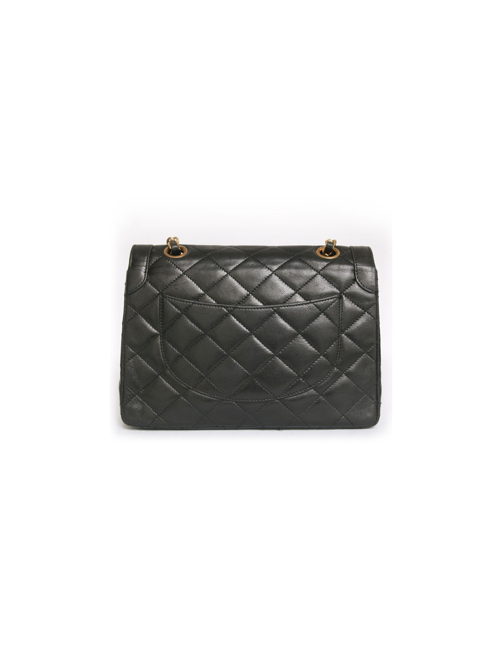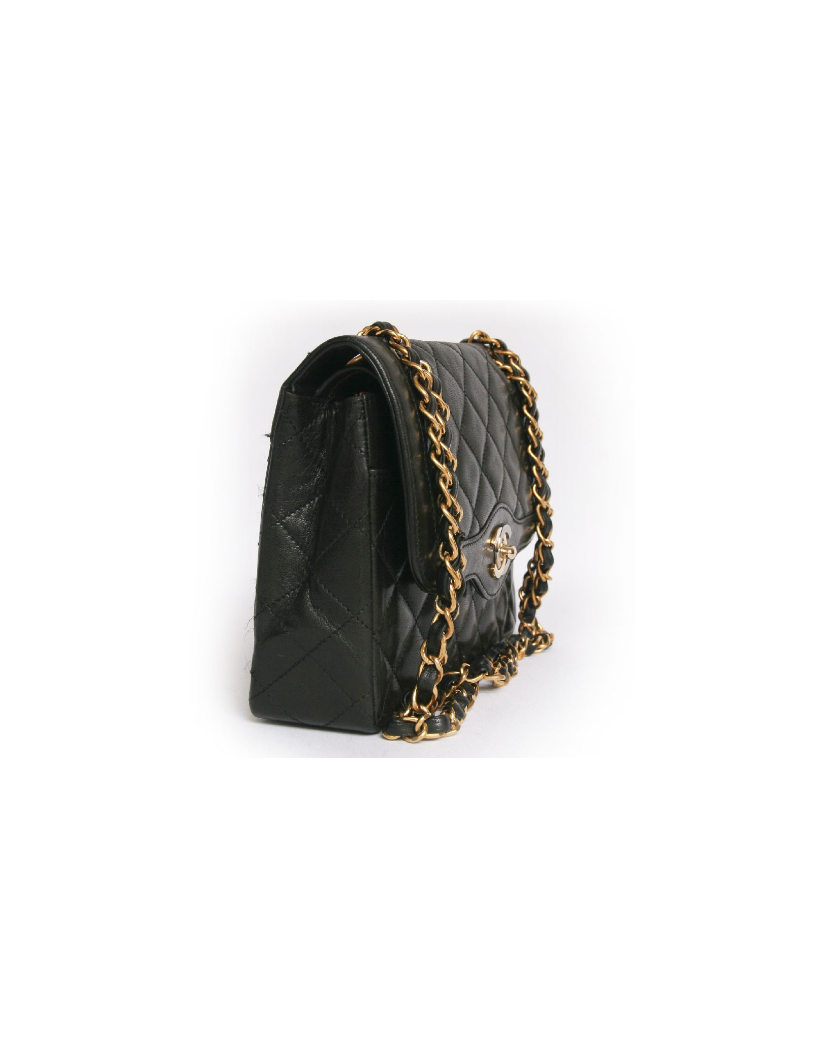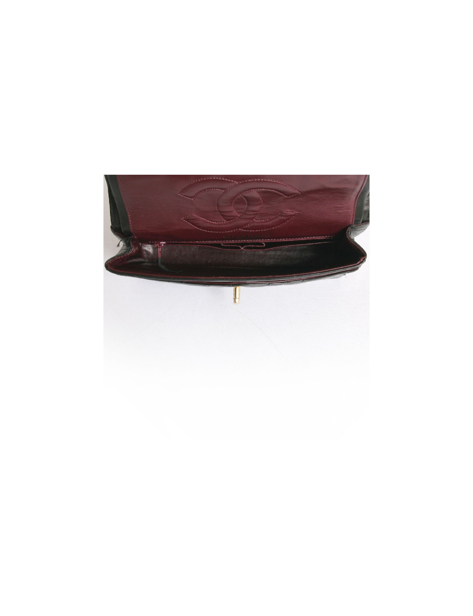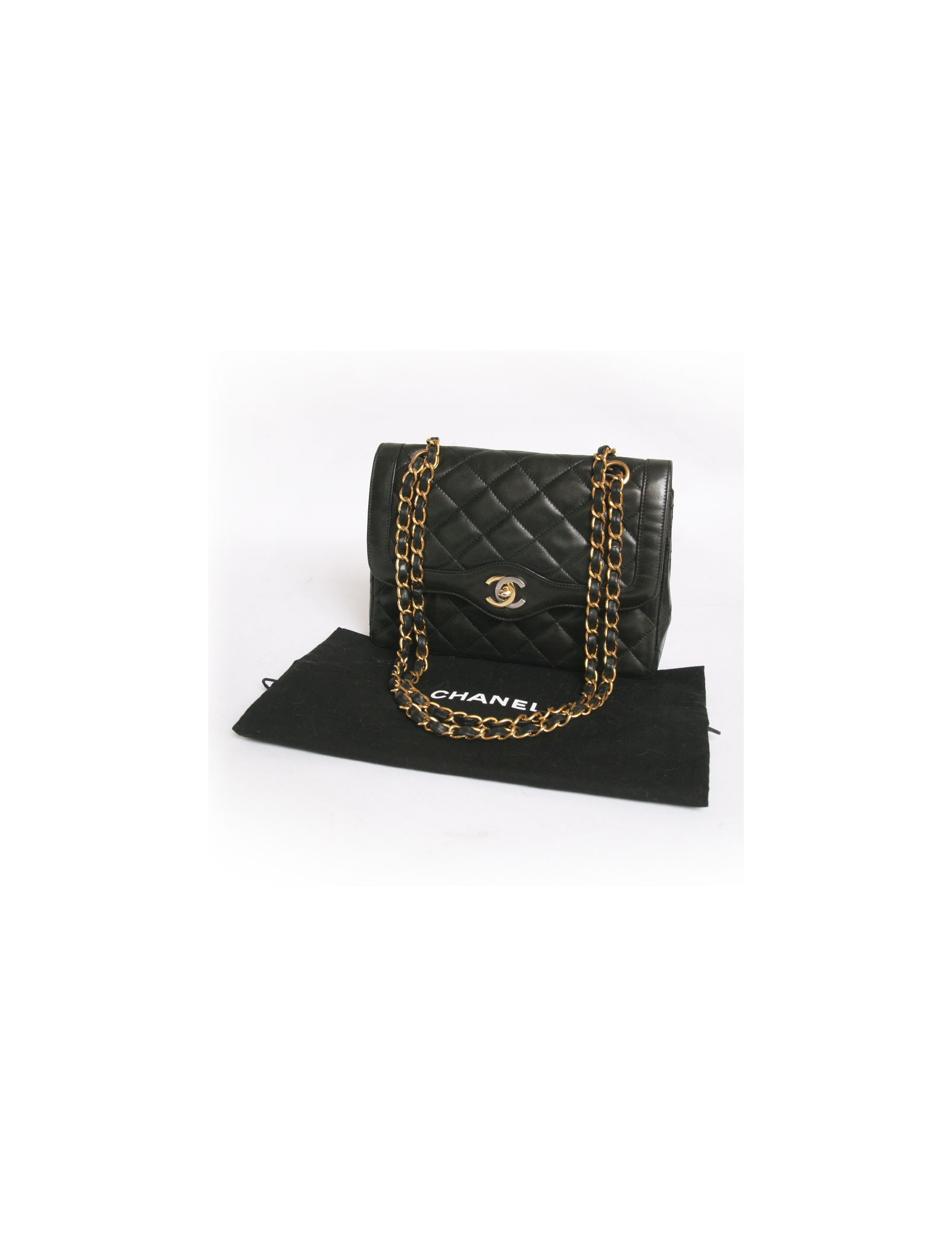 Sac Chanel vintage en cuir matelassé noir Haute Couture. Les ferrures sont en métal doré. Fermoir "CC". Double rabat. L'intérieur est bordeaux avec 3 poches dont 1 zippée. Une poche plaquée à l'arrière. La bandoulière est en cuir noir et chaînes dorées. En très bon état. Quelques légères griffures sur l'arrière du sac.