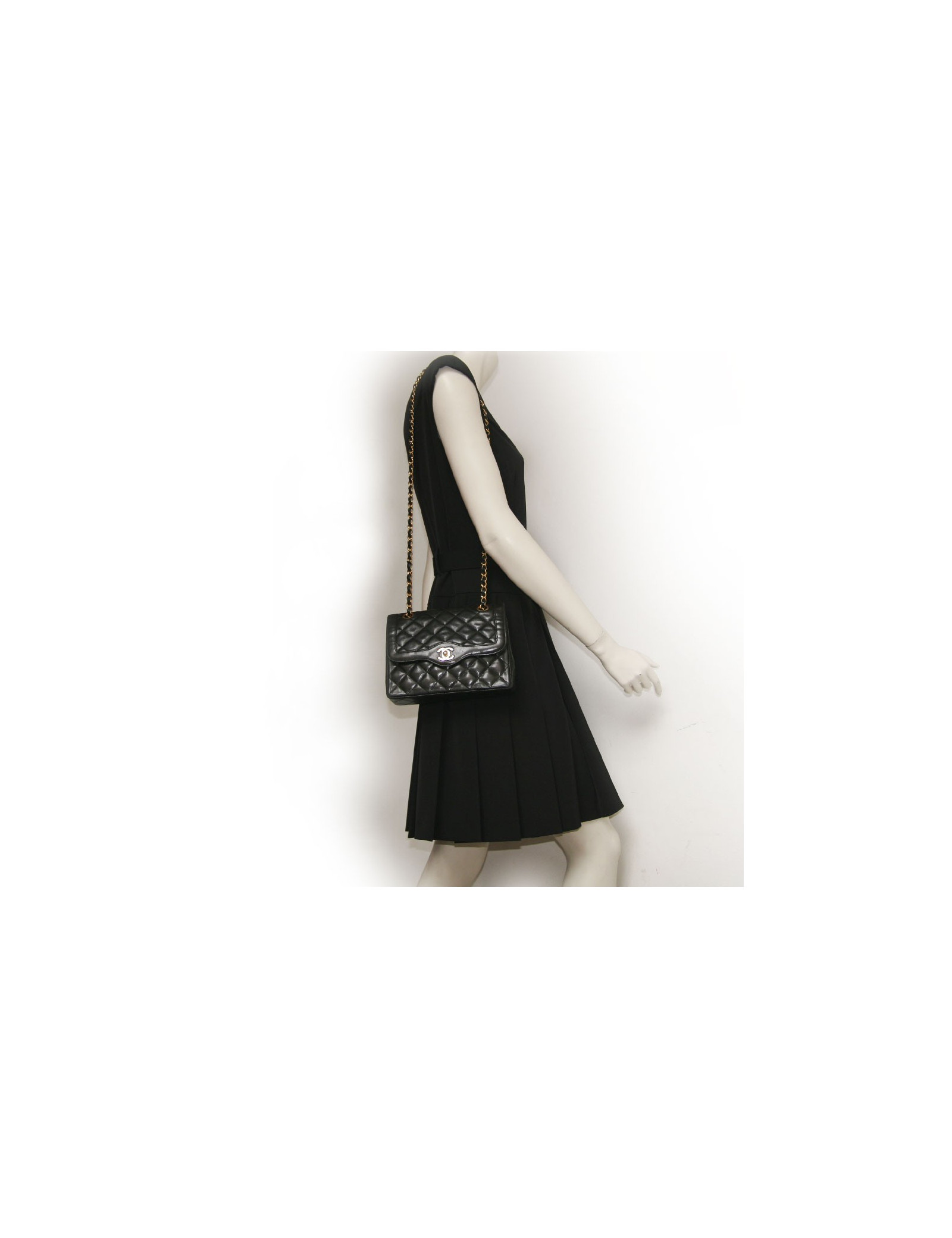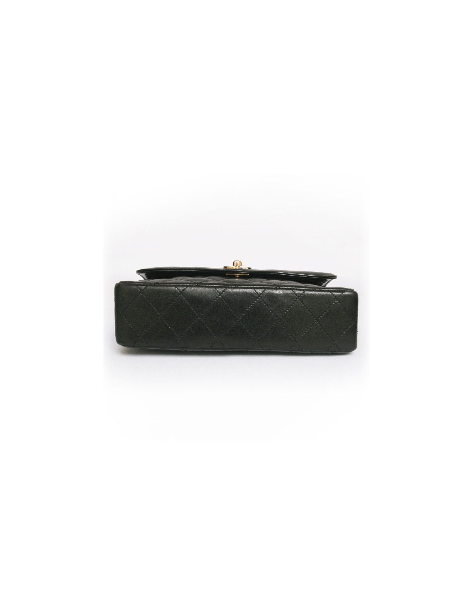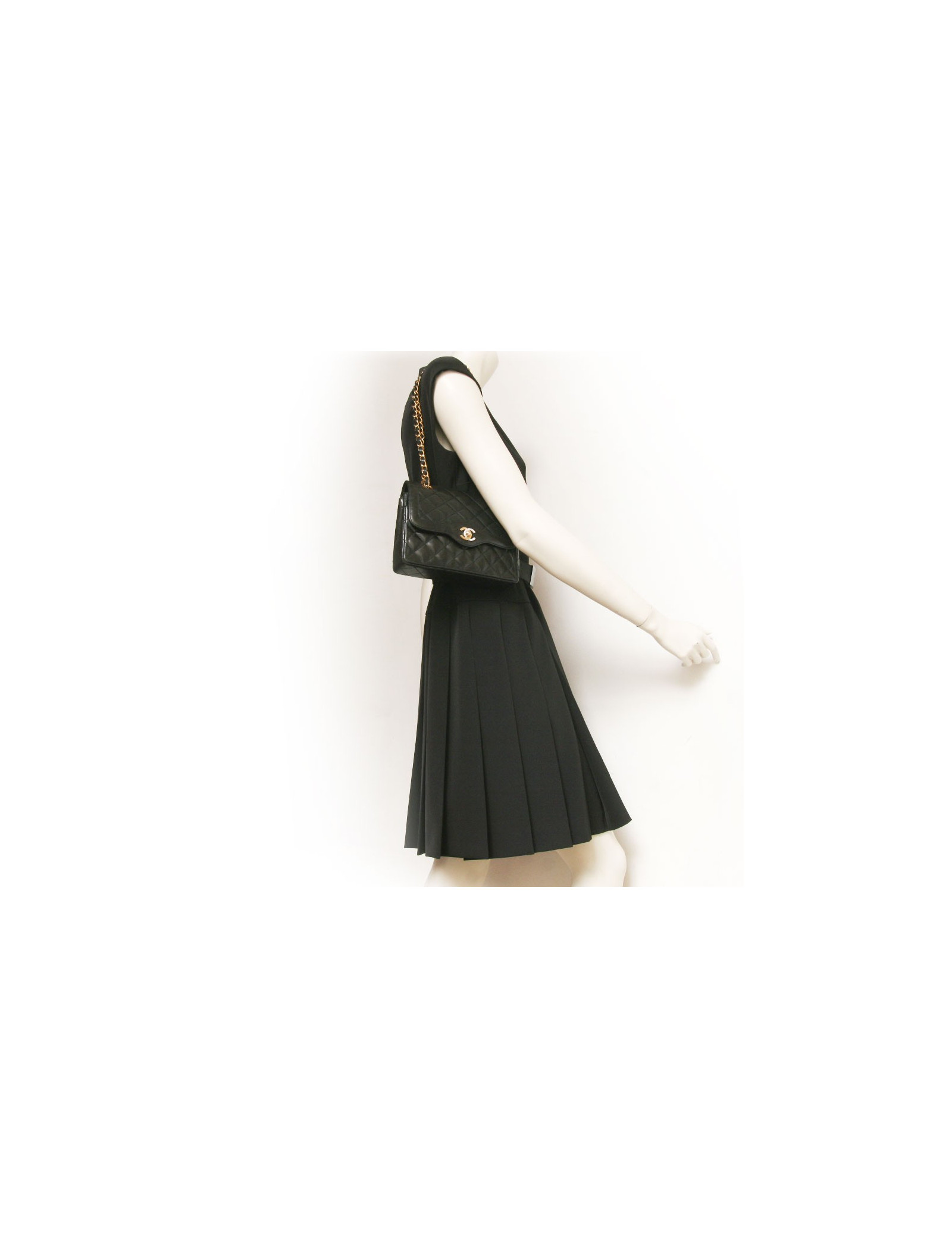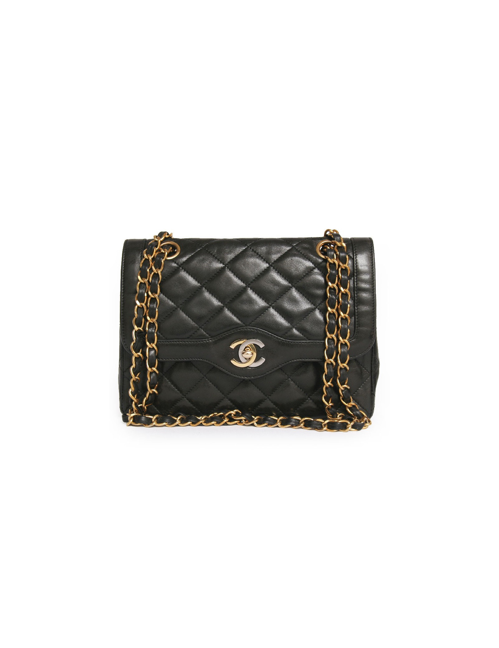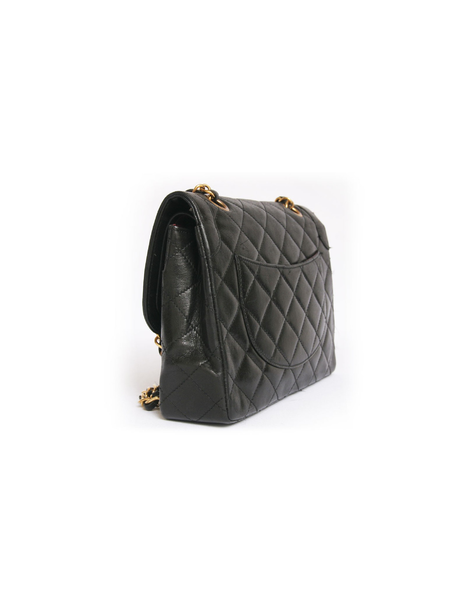 Sac Chanel vintage en cuir matelassé noir Haute Couture. Les ferrures sont en métal doré. Fermoir "CC". Double rabat. L'intérieur est bordeaux avec 3 poches dont 1 zippée. Une poche plaquée à l'arrière. La bandoulière est en cuir noir et chaînes dorées. En très bon état. Quelques légères griffures sur l'arrière du sac.