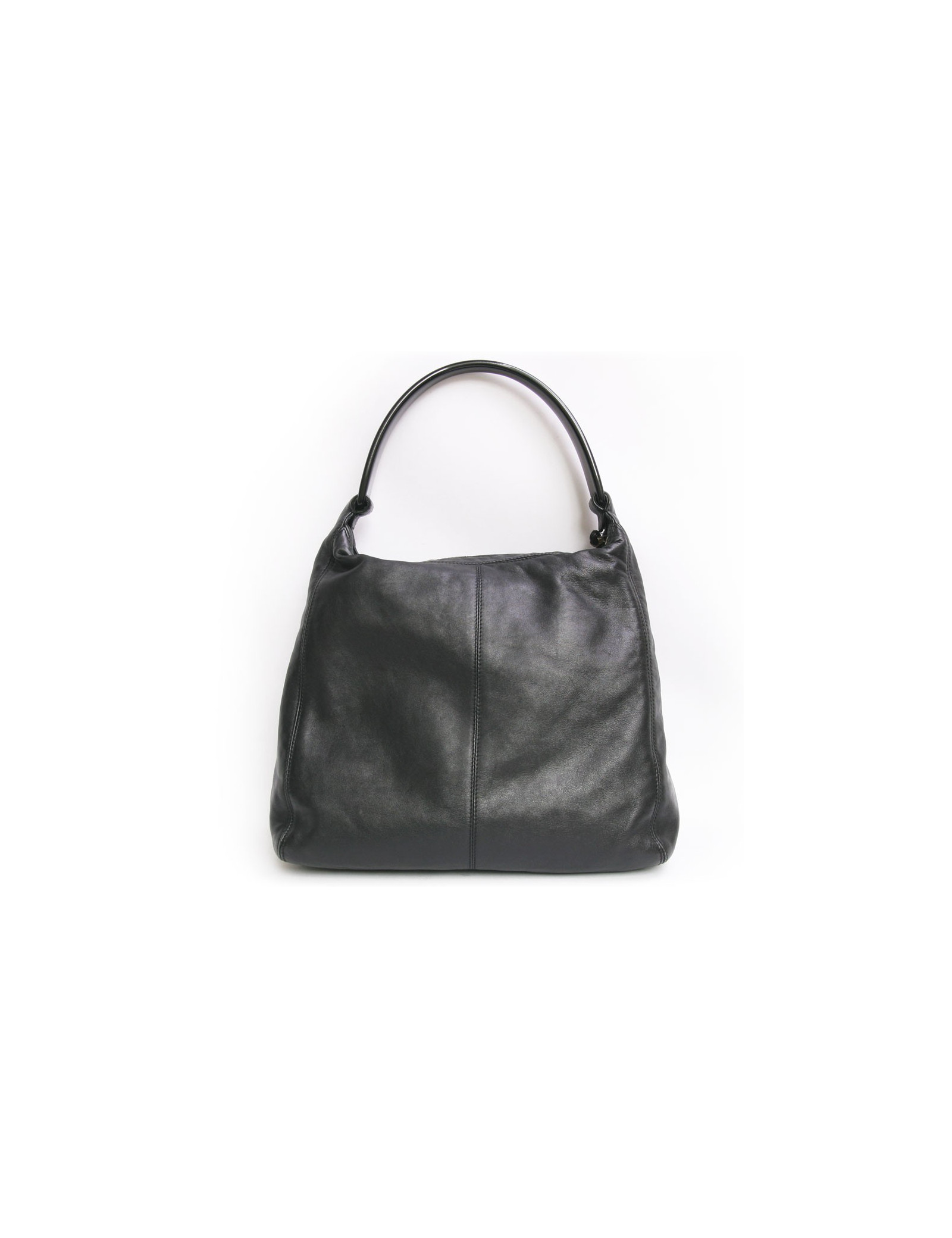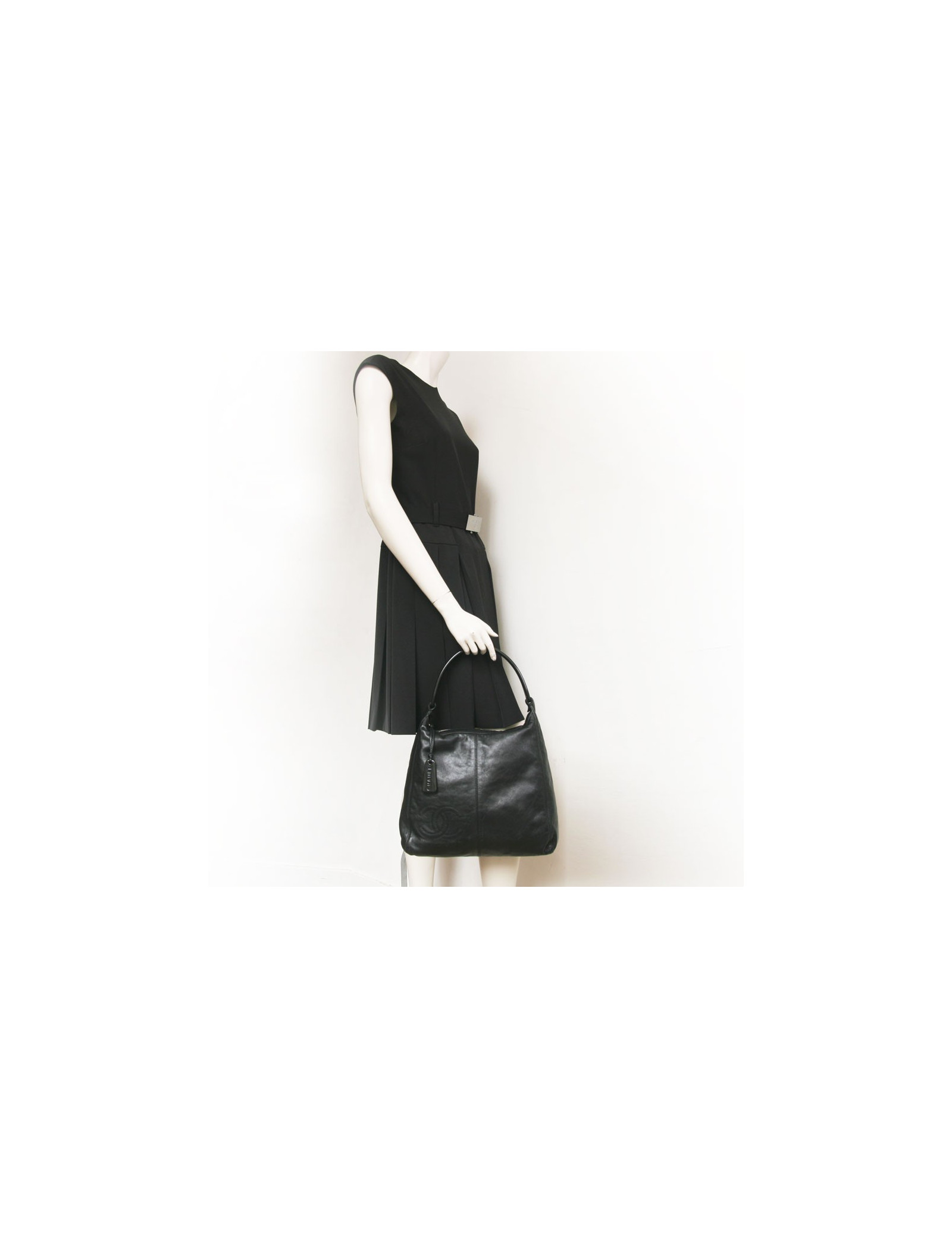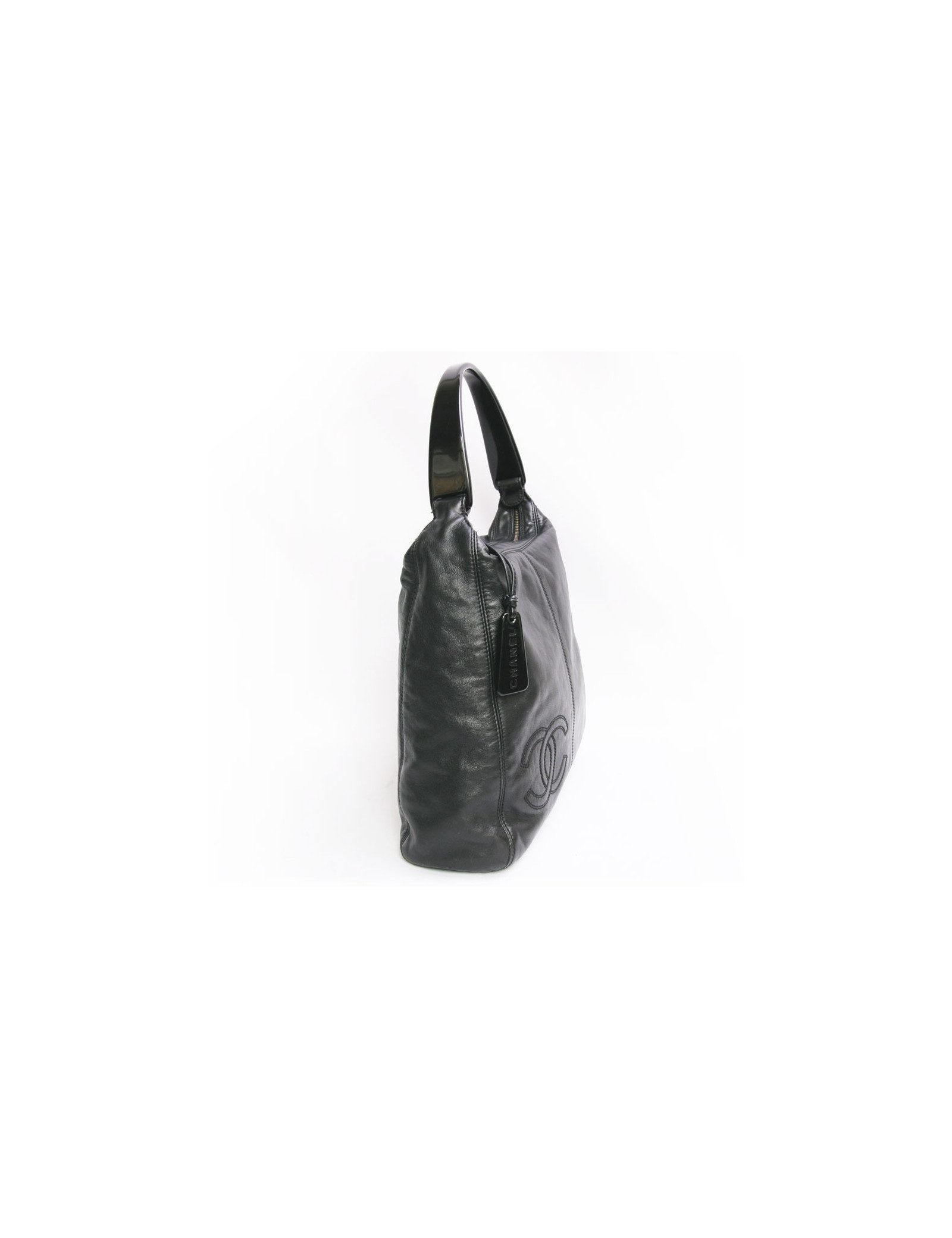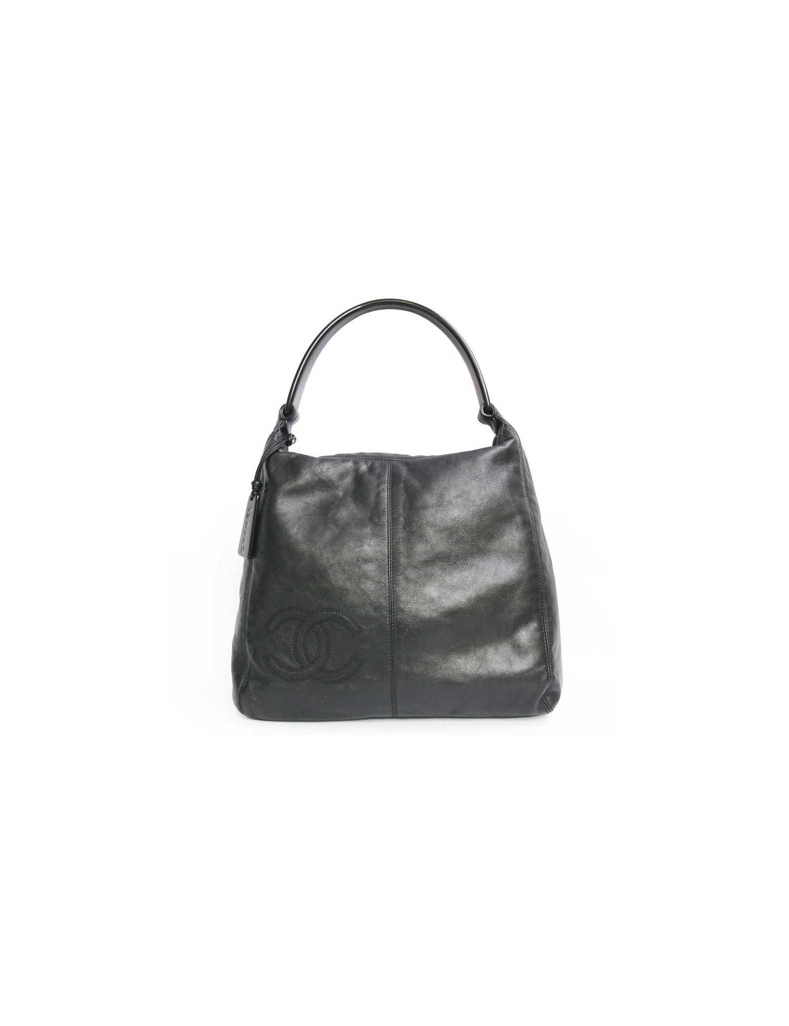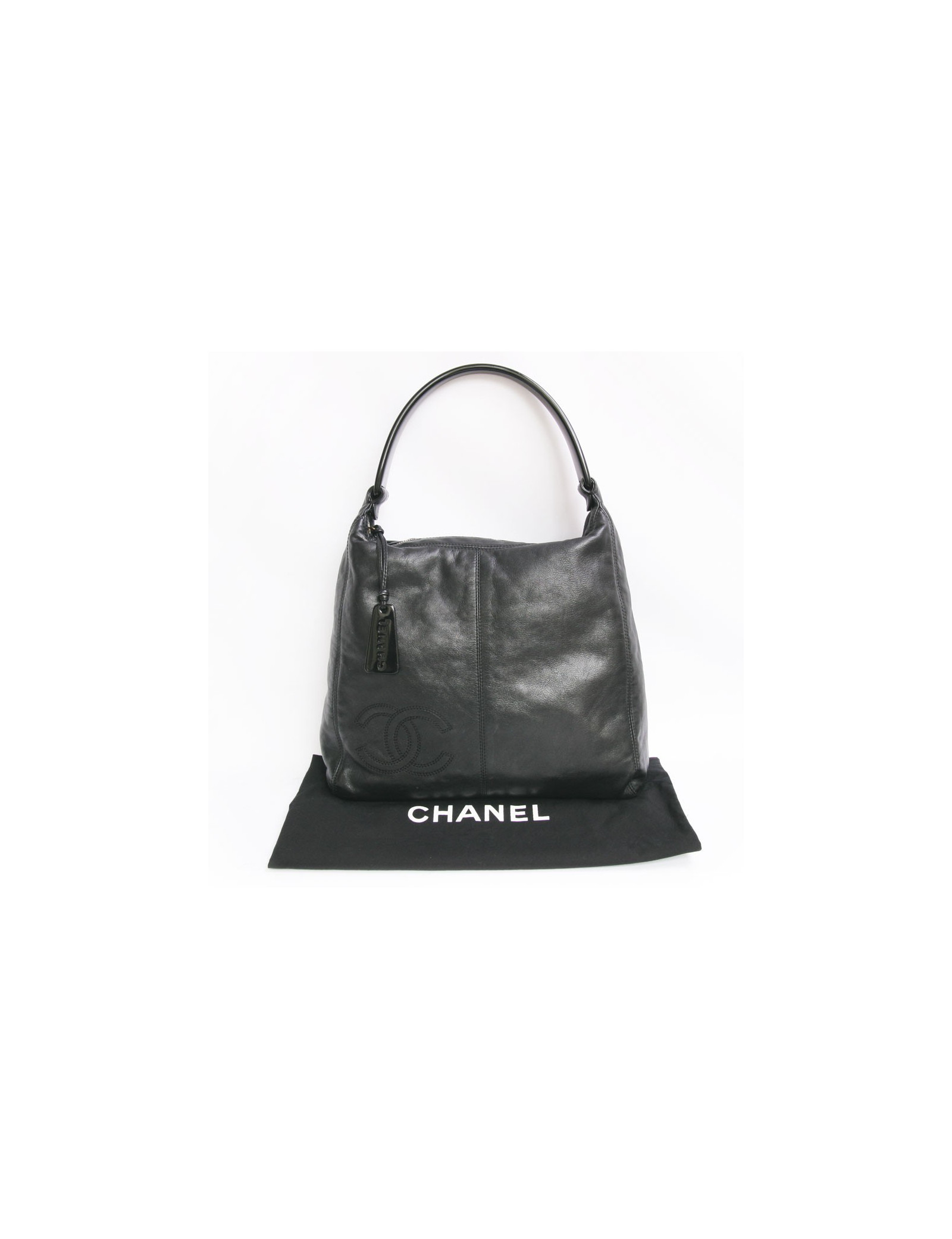 Superbe sac besace Chanel en cuir souple noir. L'anse est en plexiglas noir. Fermeture zippée. L'intérieur est en toile noire avec deux poches zippées. Le sigle "CC" est surpiqué avec des coutures noires en bas à gauche du sac. Hologramme: 5594... En très bon état. micro rayures sur l'anse.
