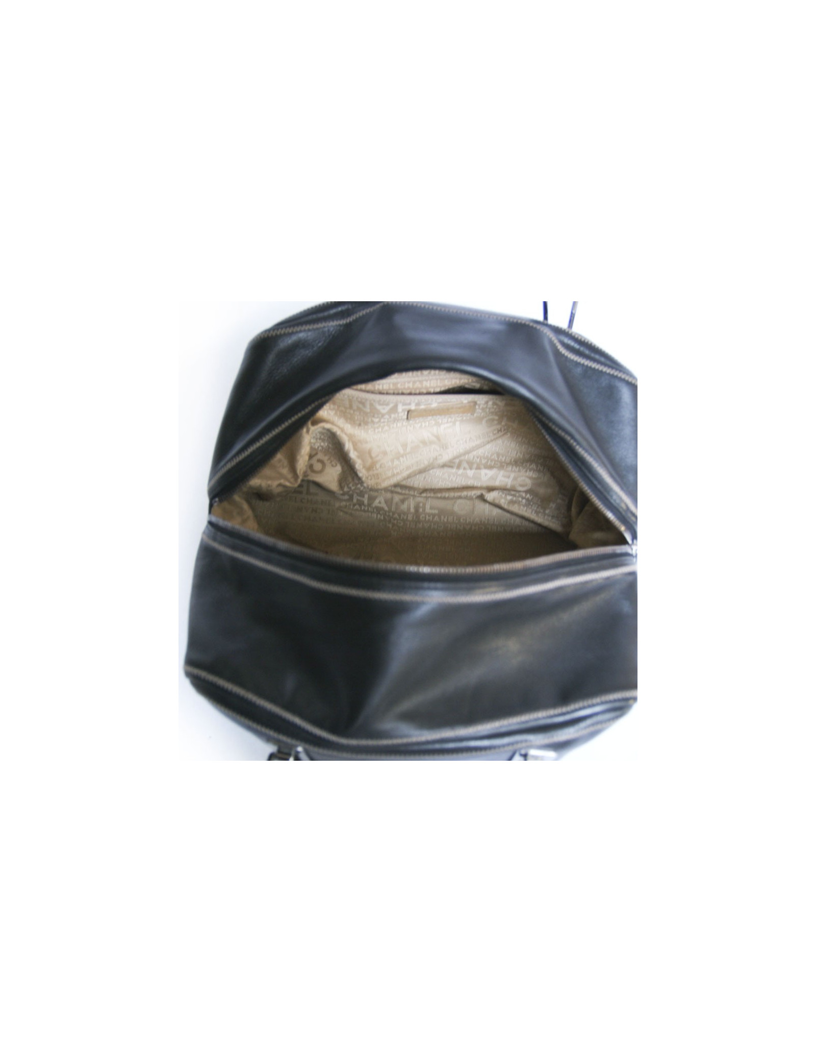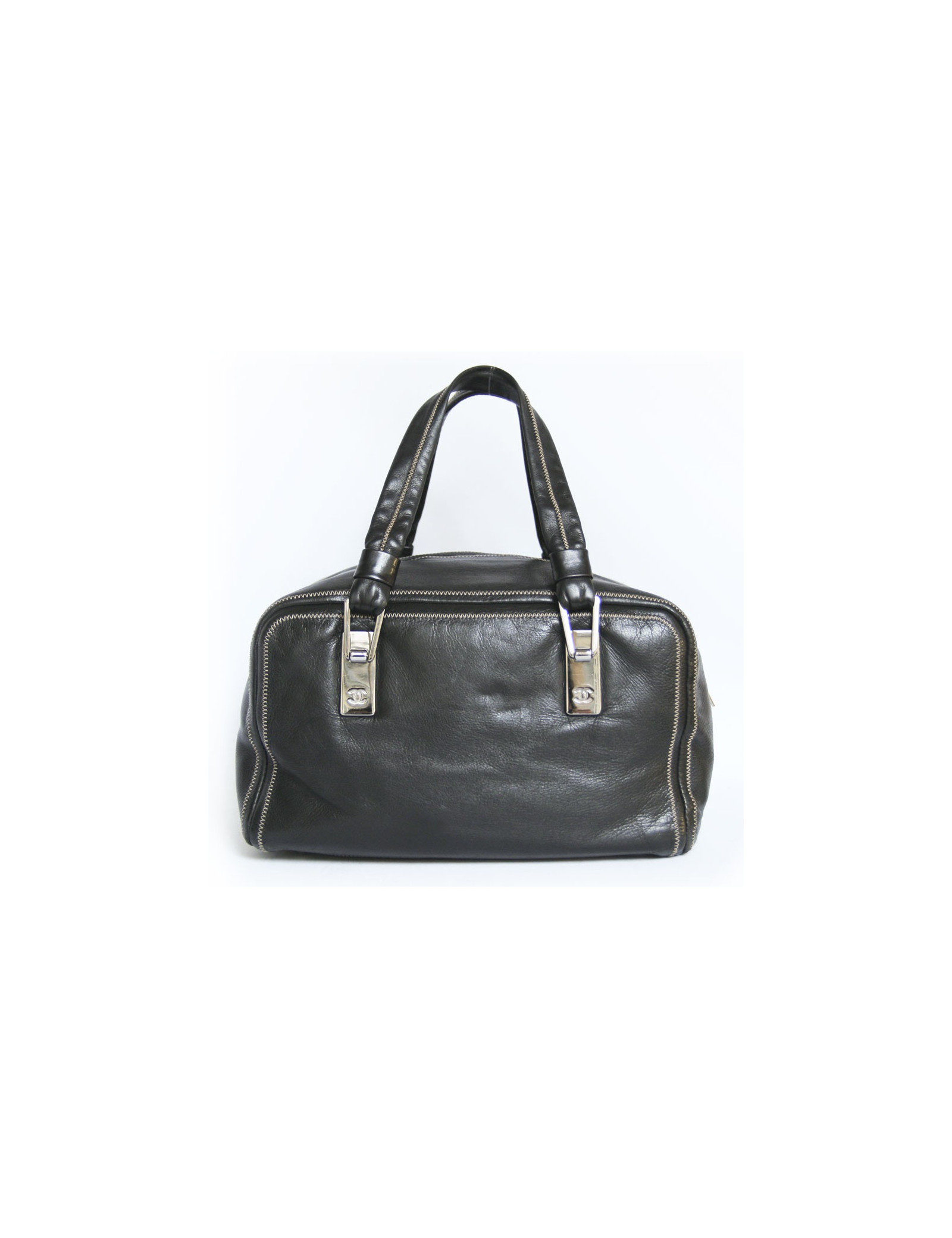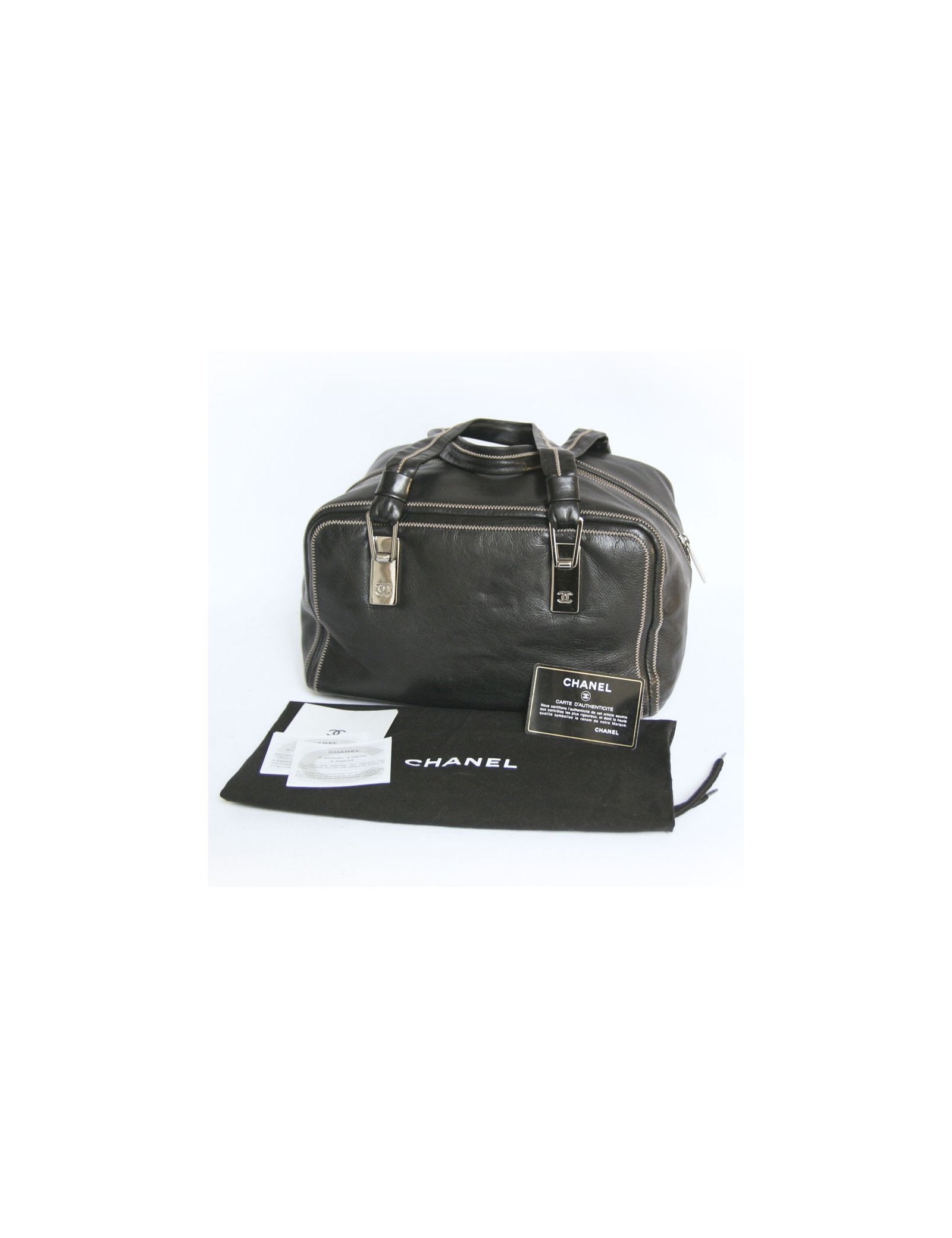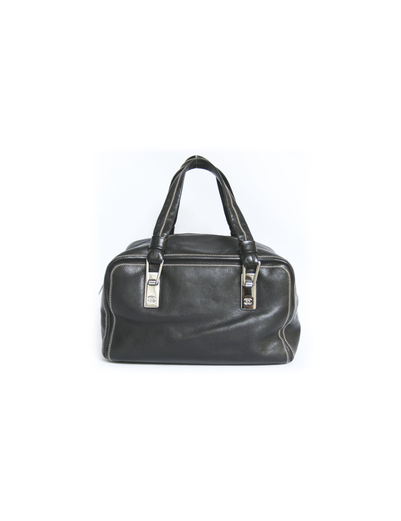 Sac bowling Chanel en cuir d'agneau noir. Fermeture zippée. L'accastillage est en métal doré. Les surpiqûres sont grises. L'intérieur est en tissu monogram beige avec une poche zippée. Double poignée. En très bon état. Très légères rayures sous le sac. Carte d'authenticité 8525...(l'hologramme s'est détaché)