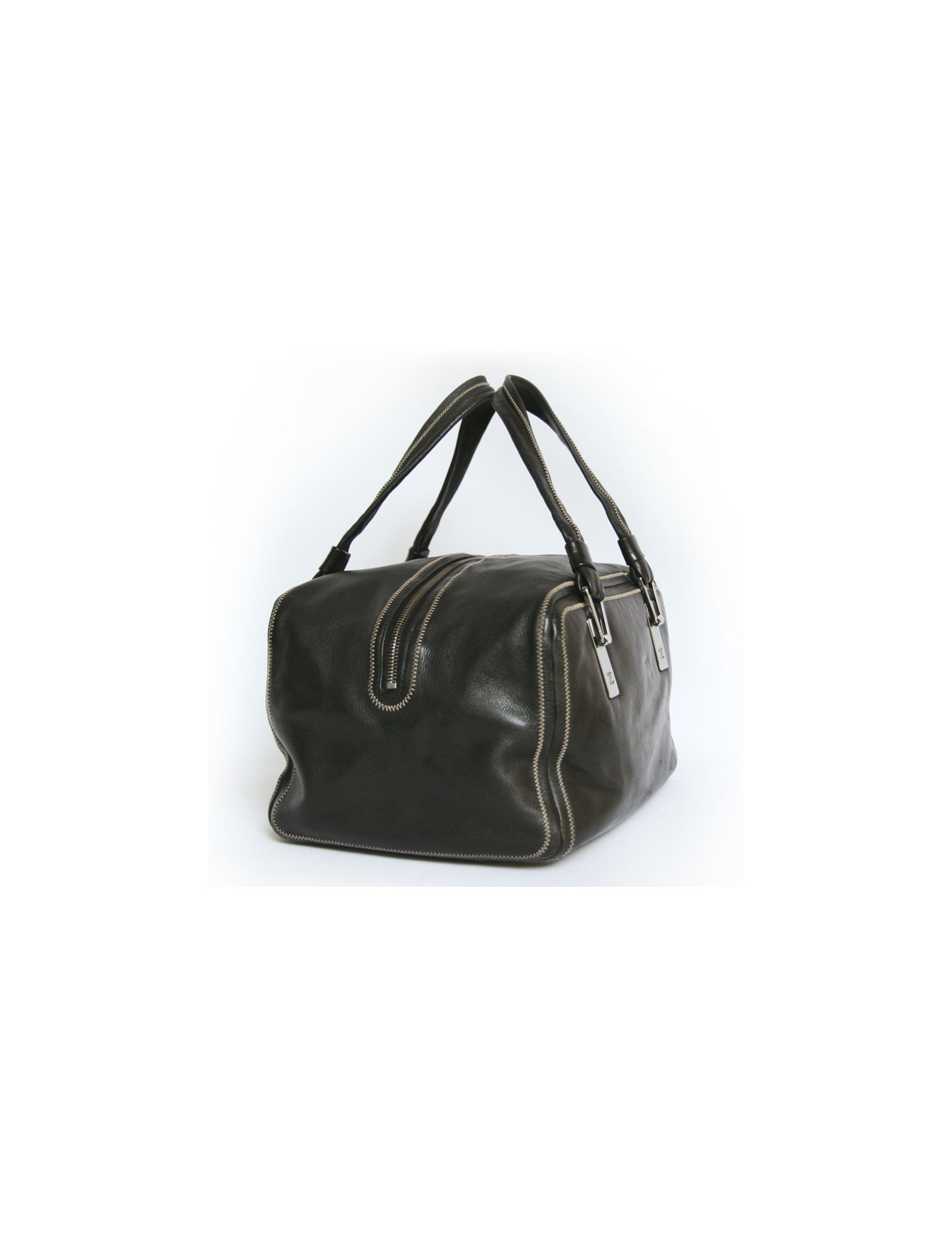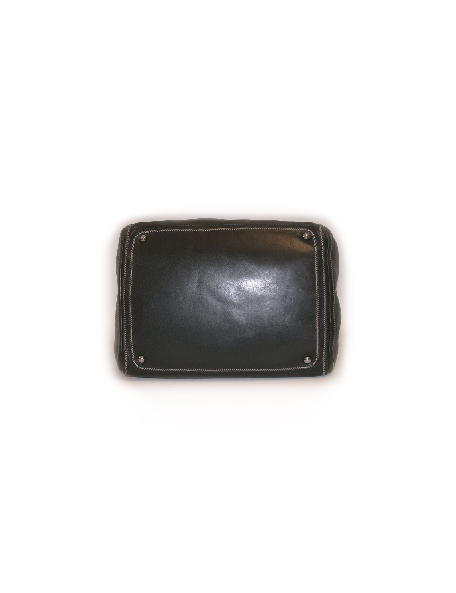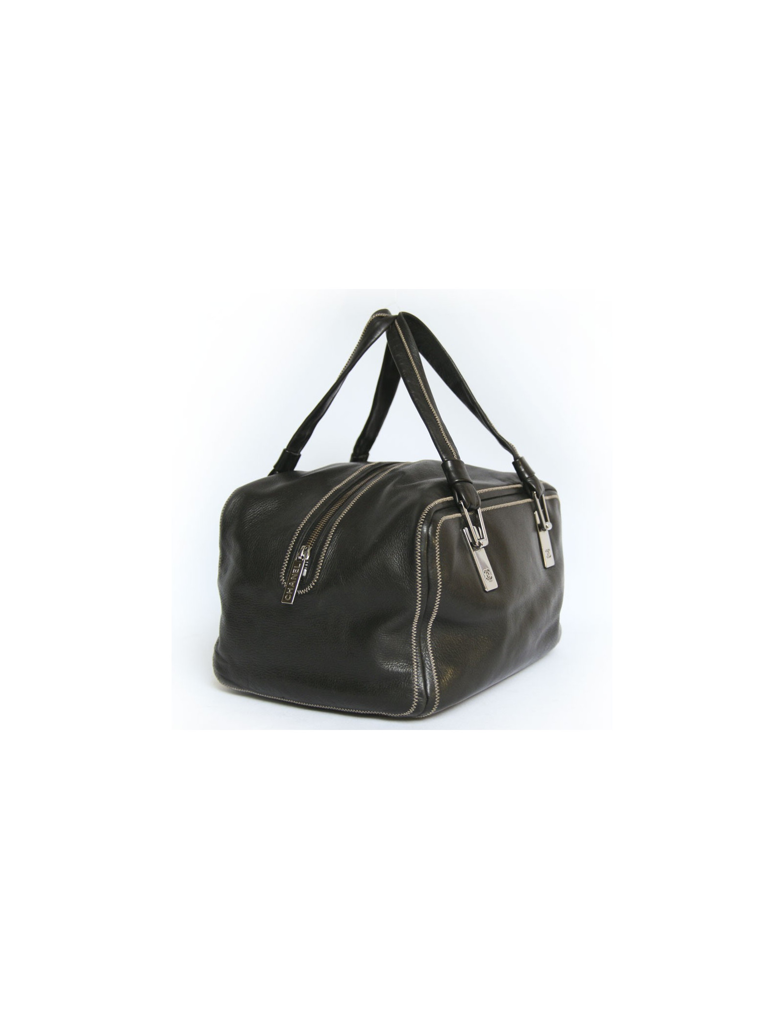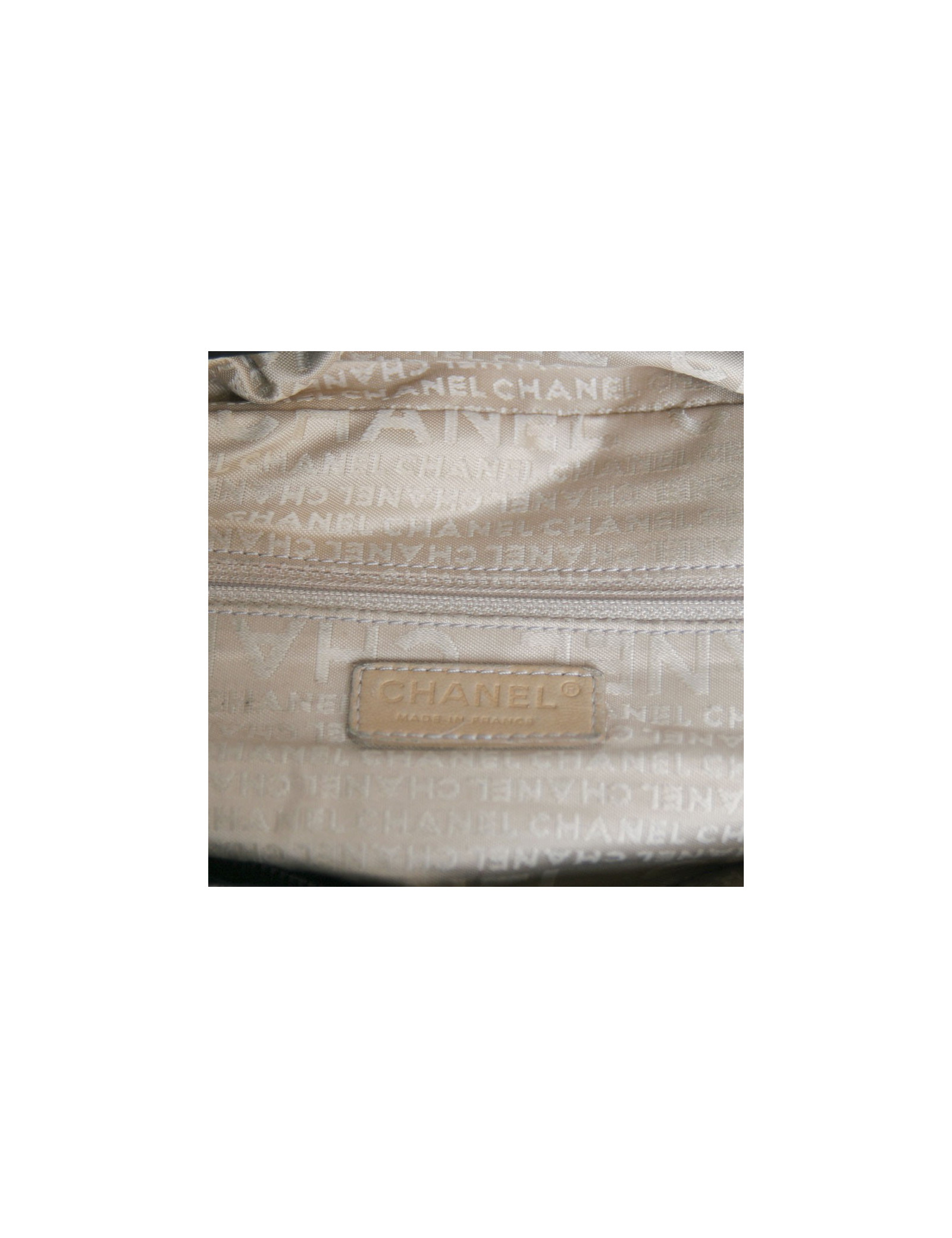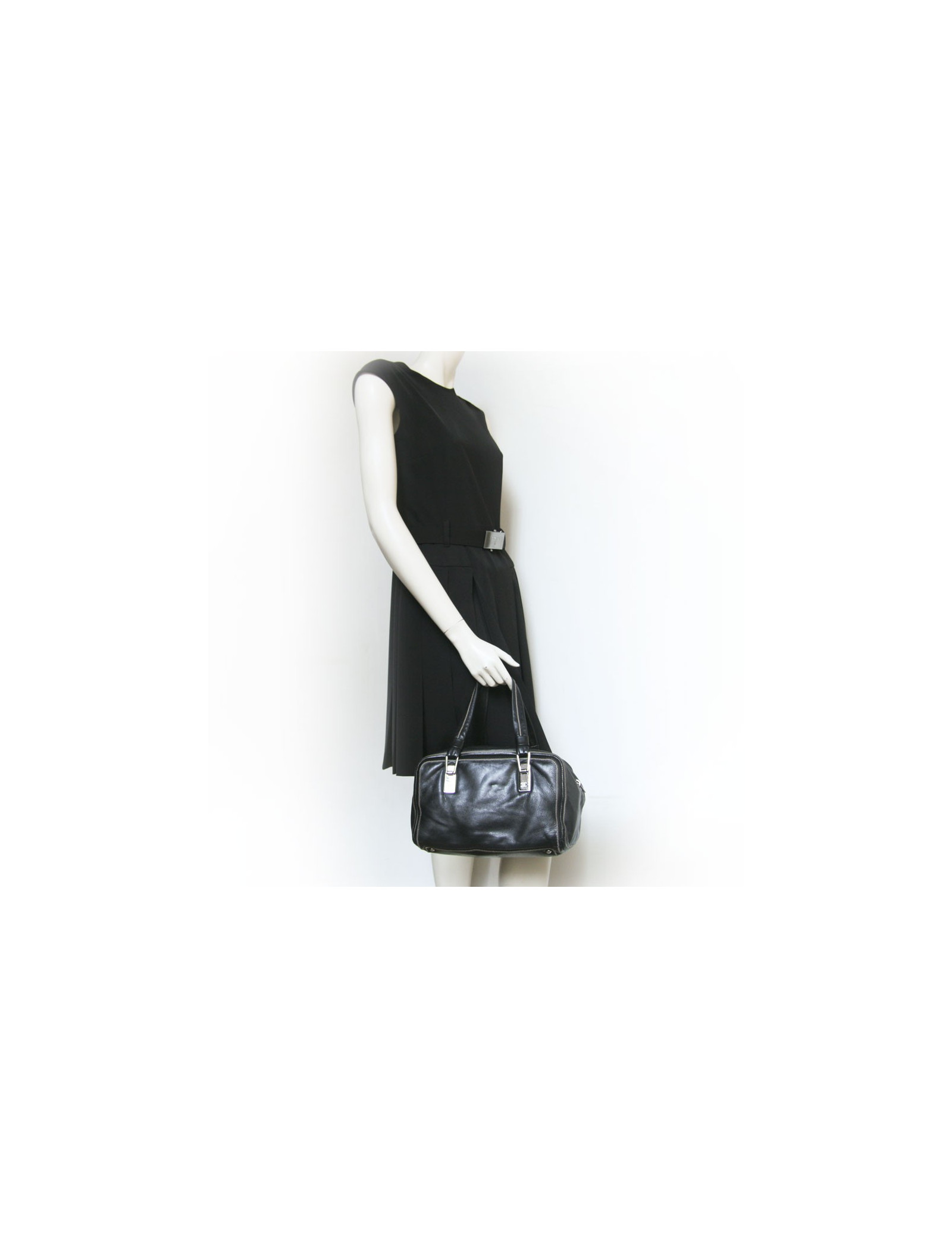 Sac bowling Chanel en cuir d'agneau noir. Fermeture zippée. L'accastillage est en métal doré. Les surpiqûres sont grises. L'intérieur est en tissu monogram beige avec une poche zippée. Double poignée. En très bon état. Très légères rayures sous le sac. Carte d'authenticité 8525...(l'hologramme s'est détaché)