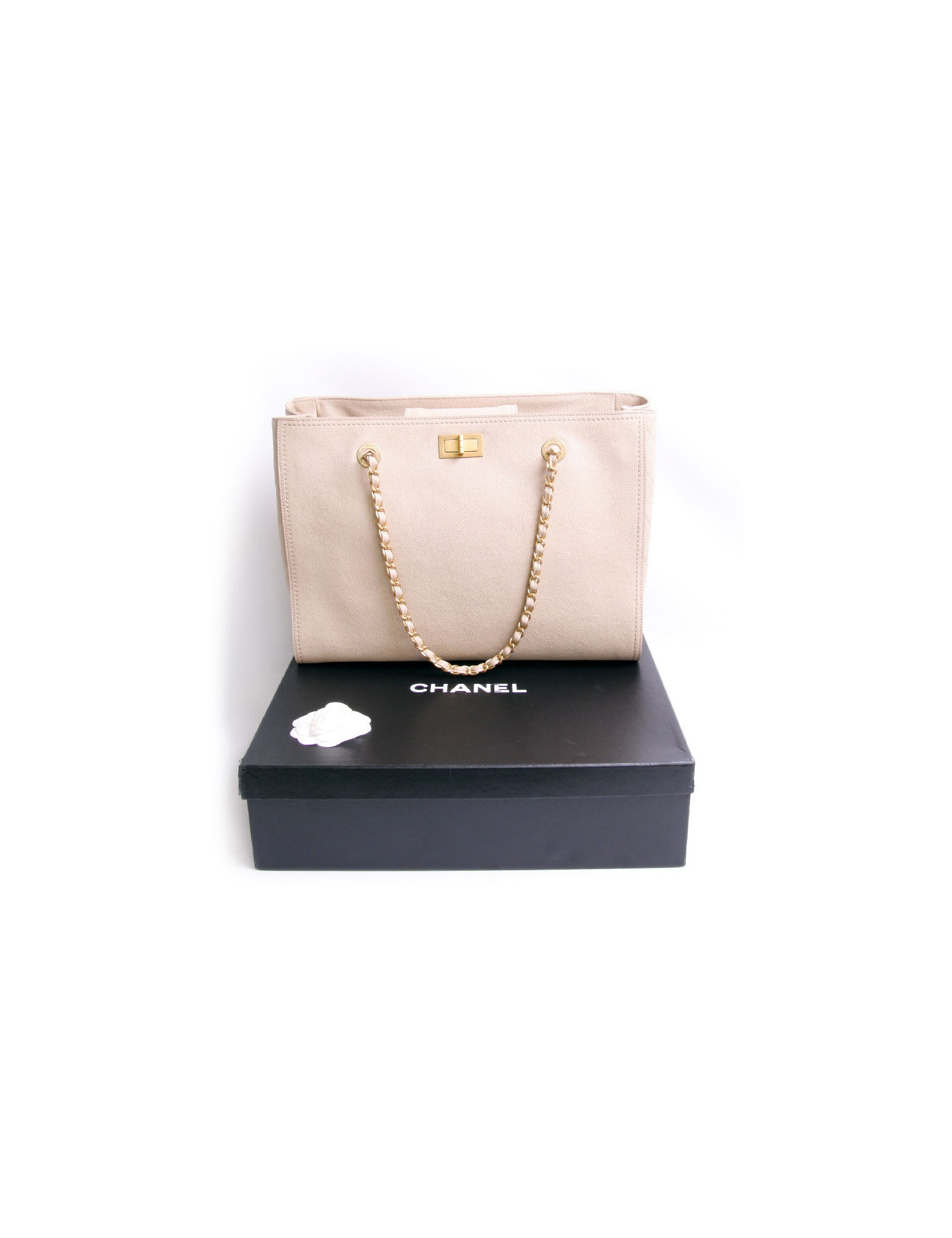 Sac cabas de la Maison Chanel en cuir naturel. Il est en cuir grainé sur la face avant et arrière et en cuir grainé sur les côtés. La bijouterie est en métal doré. Fermoir mademoiselle. L 'intérieur est en toile marron avec 3 poches dont une zippée et une pour smartphone. En très bon état. Très peu porté