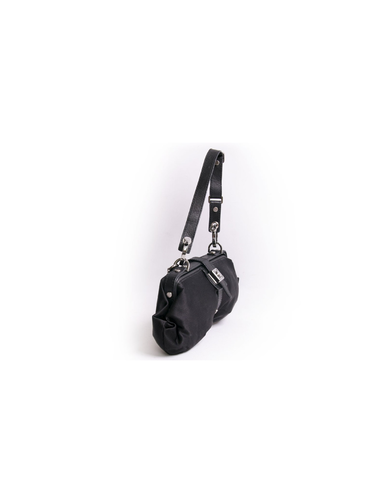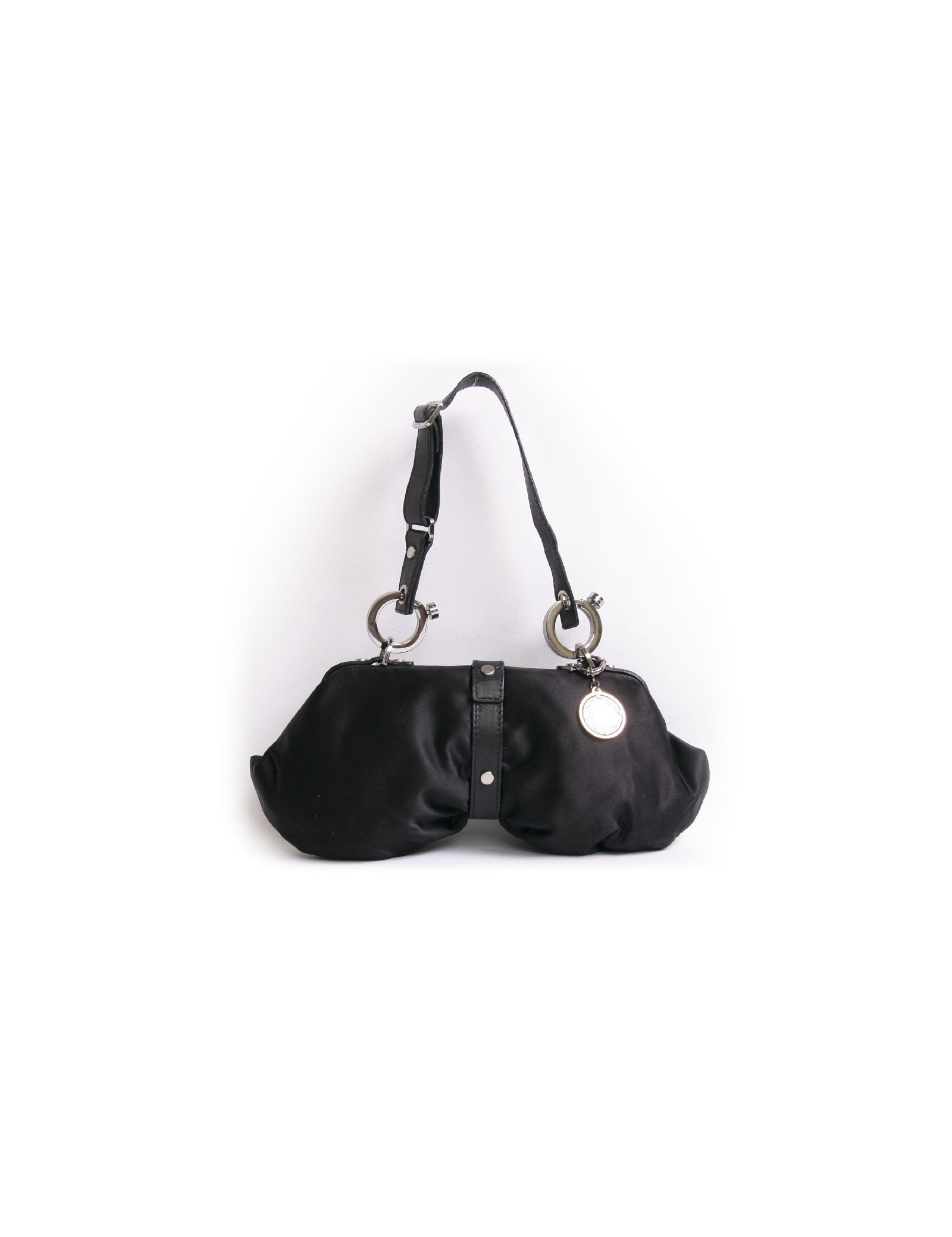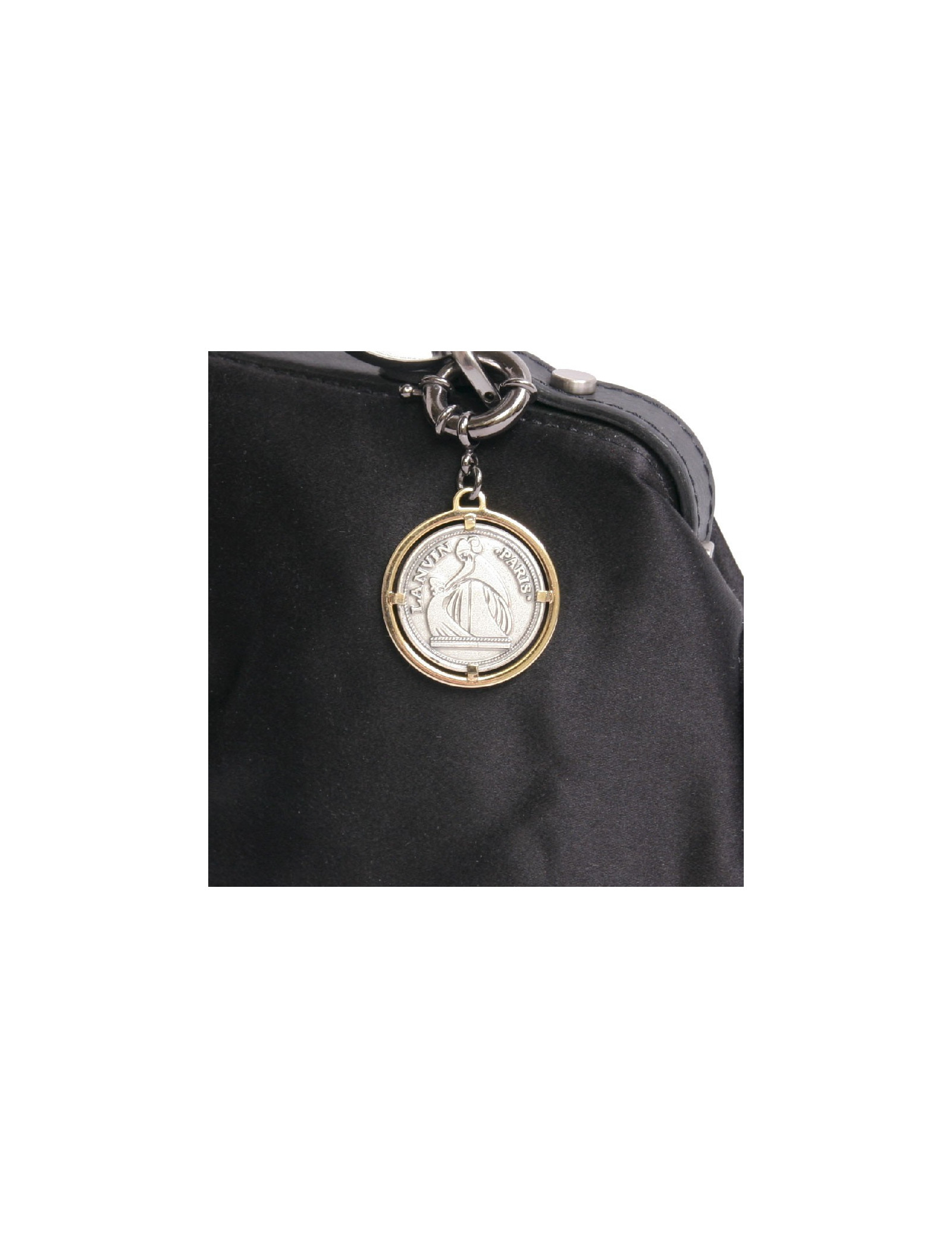 Sac pochette Lanvin en satin duchesse noir. La bijouterie est en métal argenté. L'intérieur est en tissu noir avec un miroir attaché. Il peut se porter à l'épaule ainsi qu'au bras à l'aide d'une anse réglable. En très bon état.