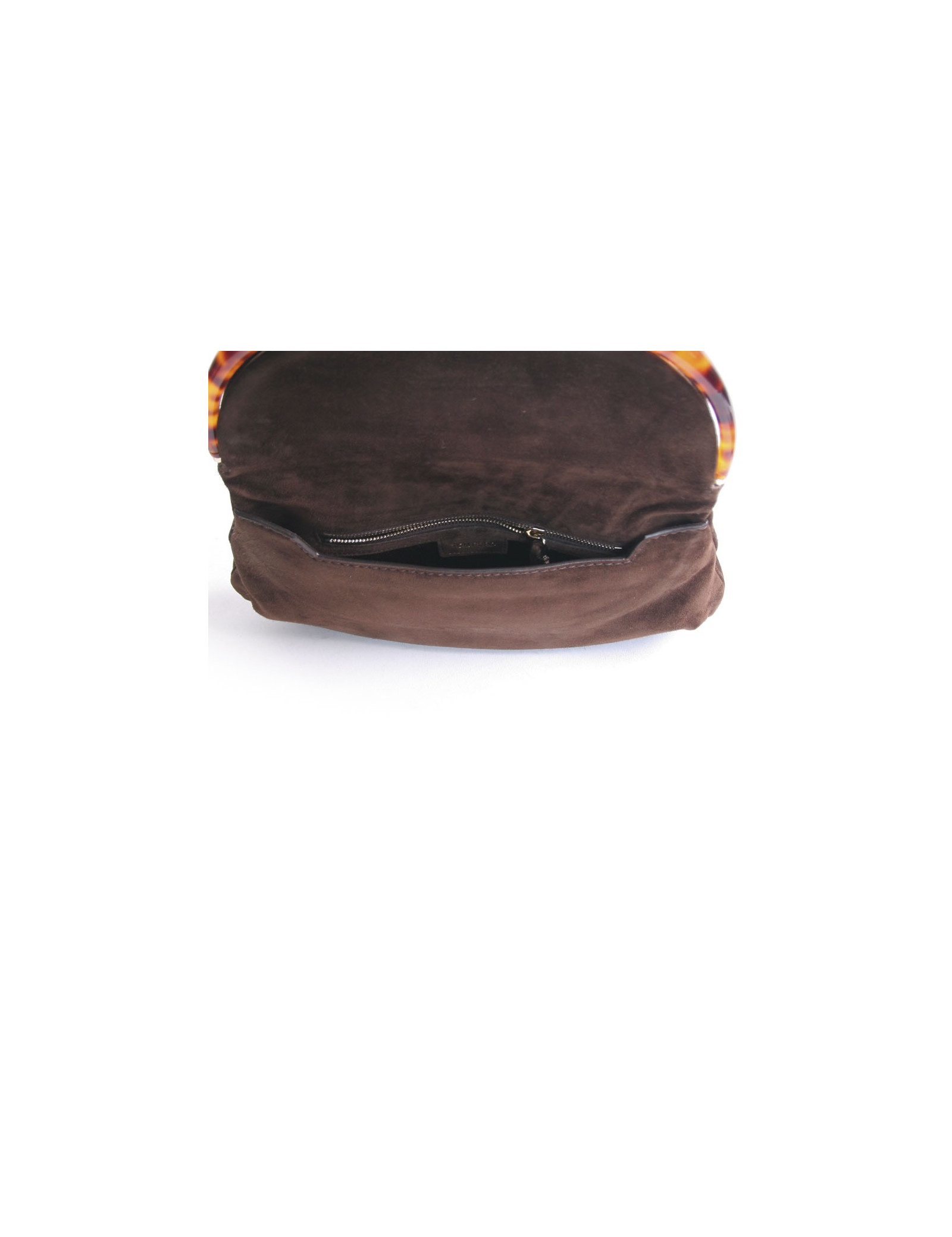 Pochette Tom Ford en suède marron, avec fermoir clapet doré en plexi écaille de tortue, doublée de satin de soie avec 2 poches dont une zippée. En excellent état.