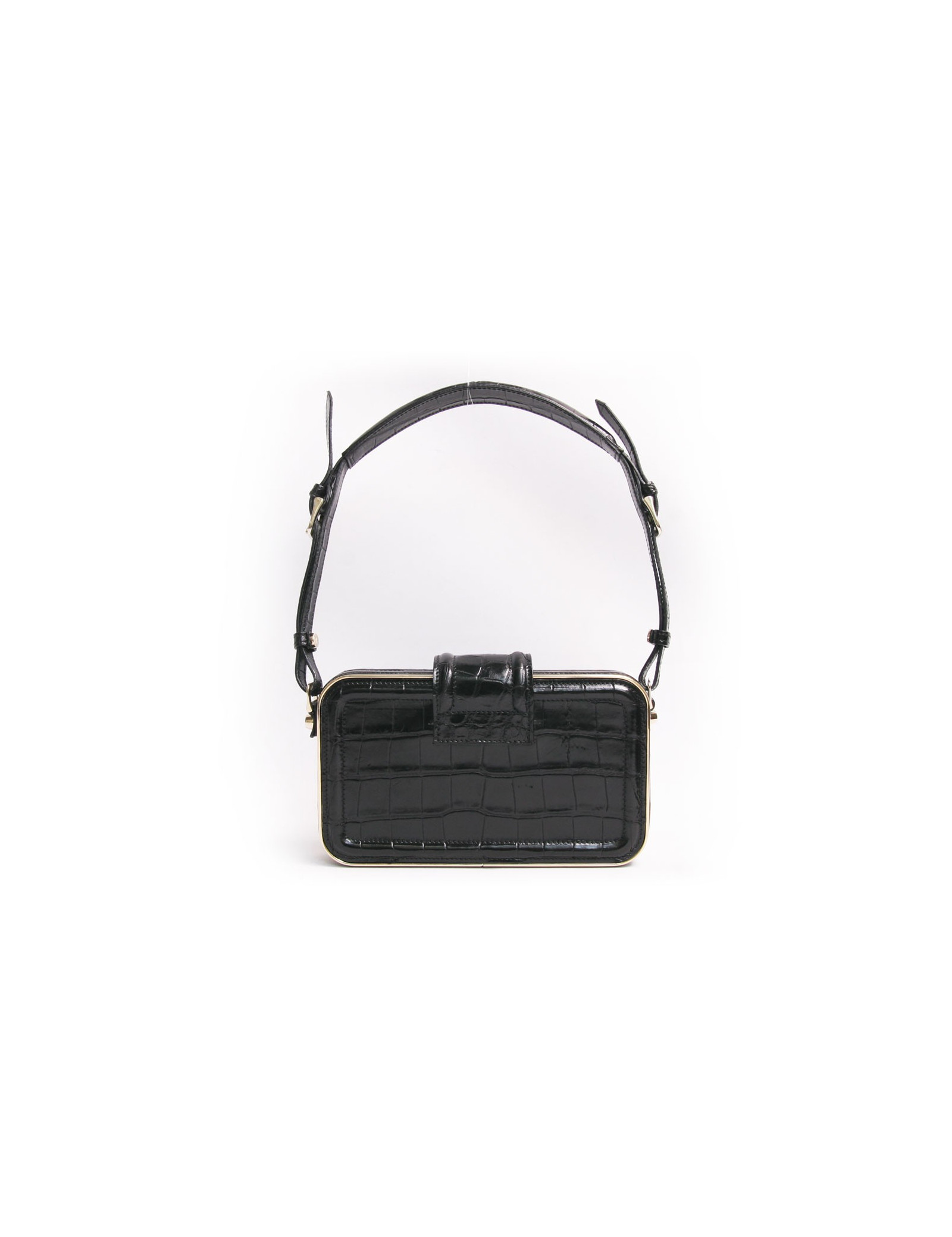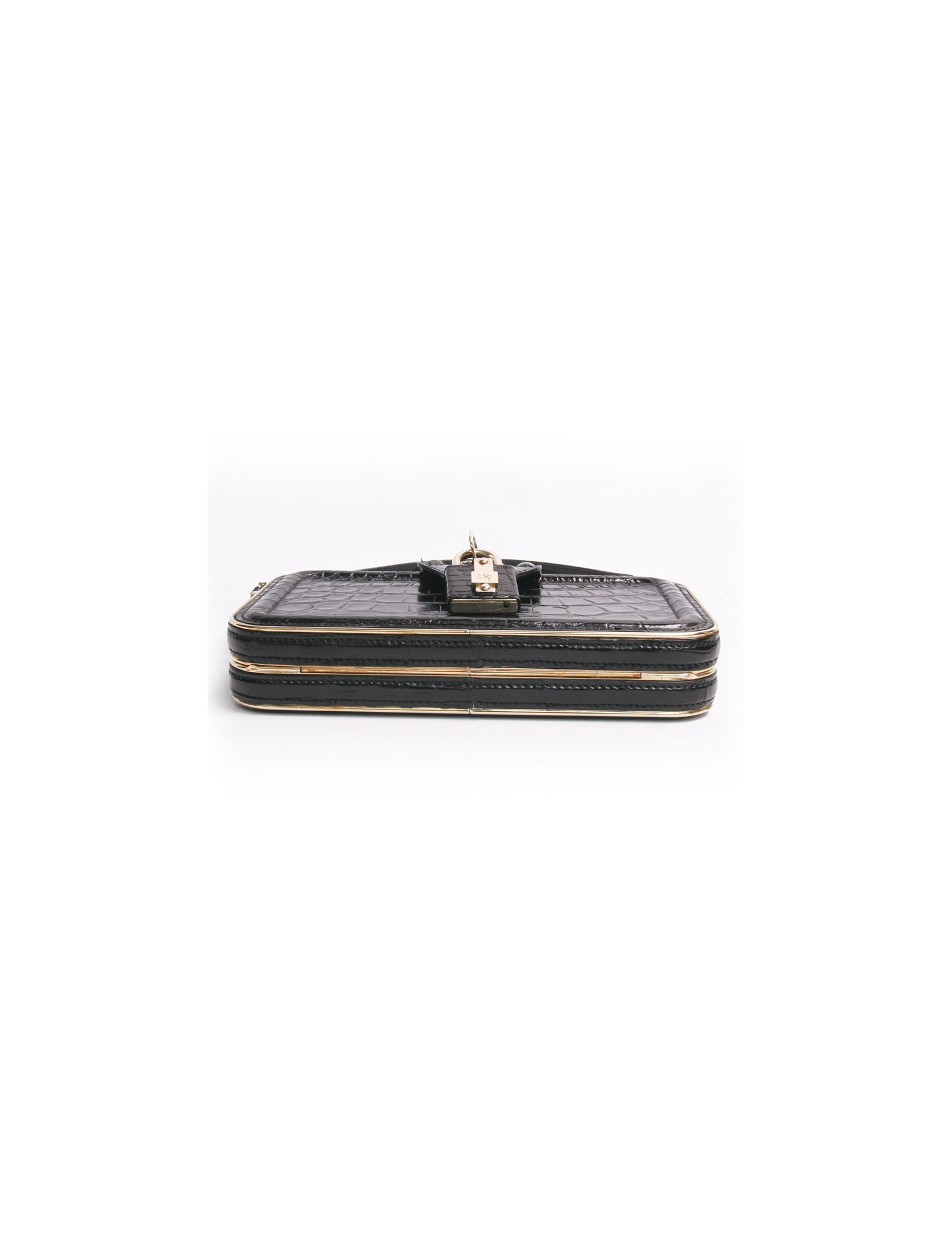 Magnifique minaudière de la Maison Burberry en crocodile noir. La bijouterie est en métal or. Fermeture pression. L'intérieur est en toile matelassé bordeaux. Il se porte à l'épaule à l'aide d'une bandoulière réglable avec un renfort. En très bon état.
