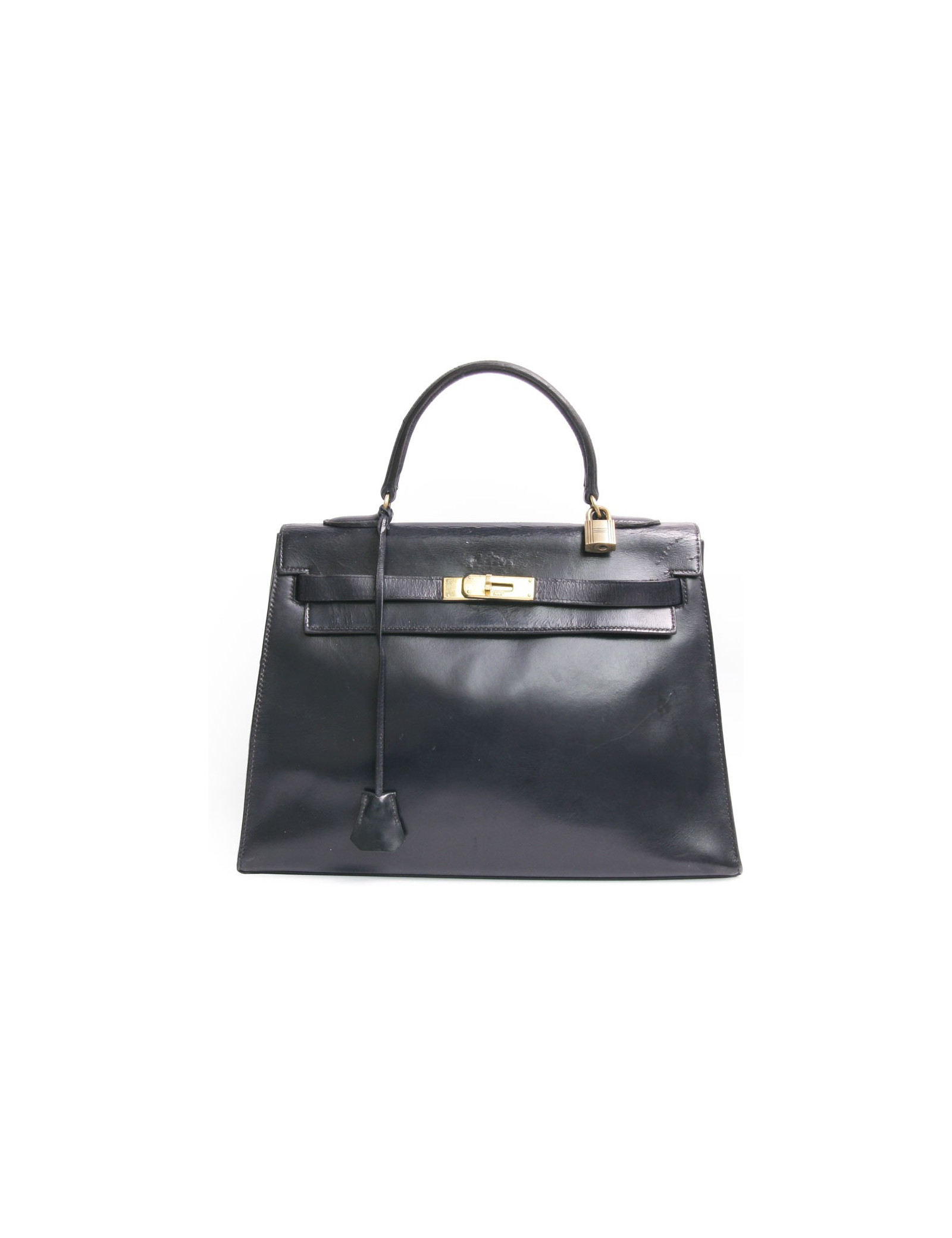 Sac Kelly 32 de la Maison Hermès en cuir box bleu marine vintage. La garniture est en laiton plaqué or. Tirette, clochette, clefs et cadenas. L'intérieur est en cuir bleu marine comprenant deux grandes poches dont une zippée (fermeture "éclair"). Etat vintage. des années 70.Craquelures sur la poignée ainsi que sur le rabat. Légère usure sur les coins. Quelques rayures se trouvent à l'avant ainsi qu' à l'arrière du sac.