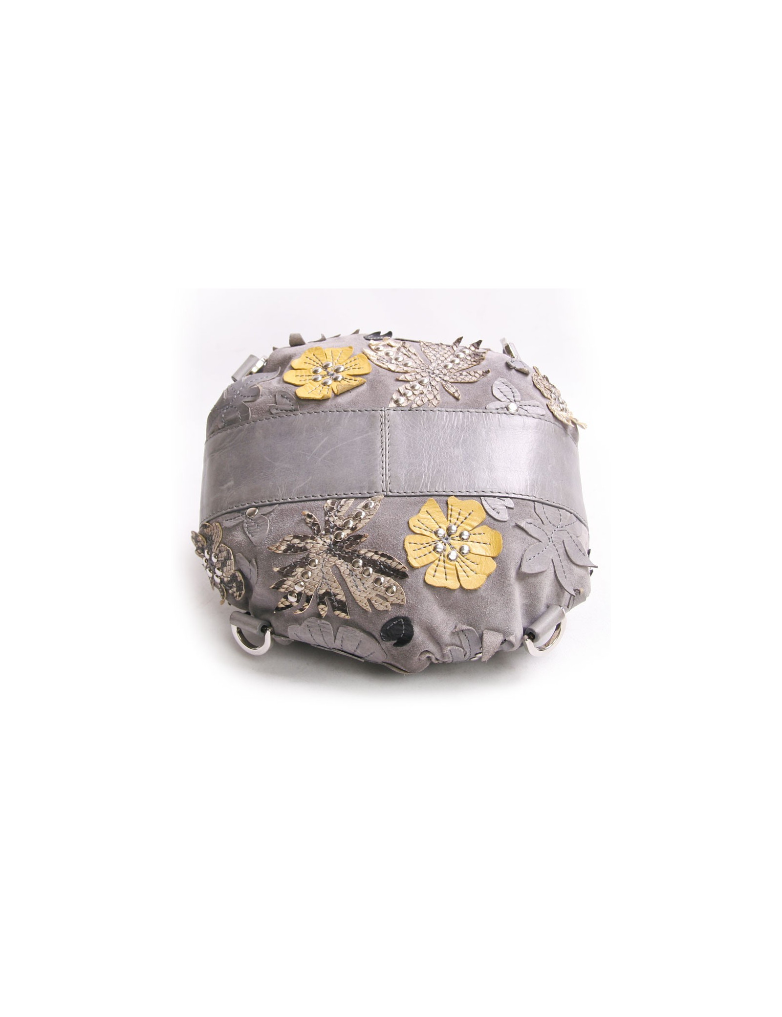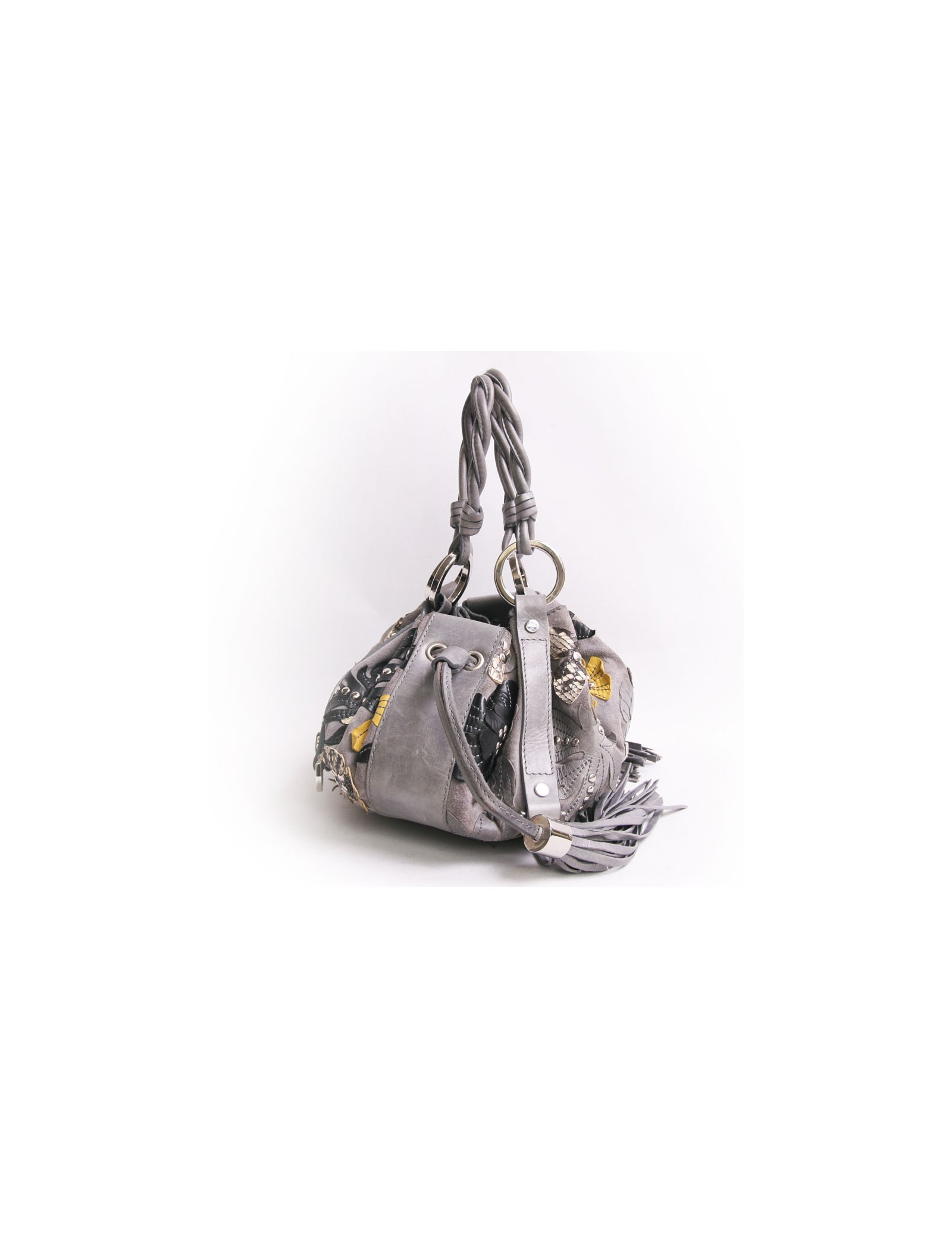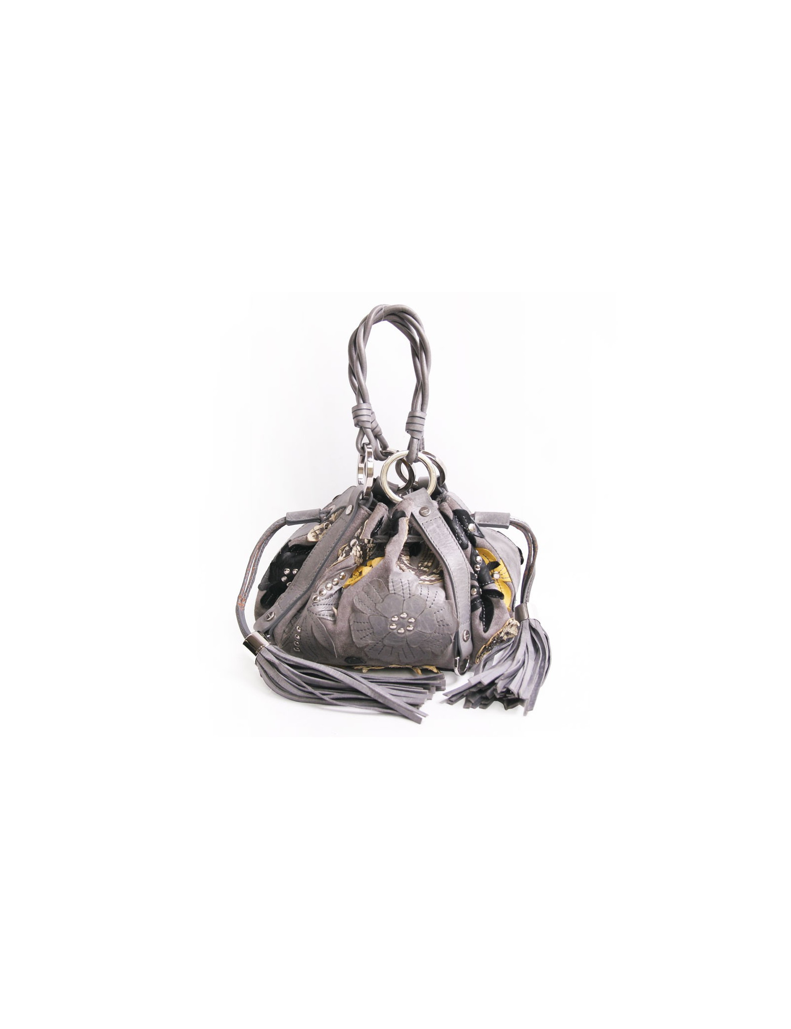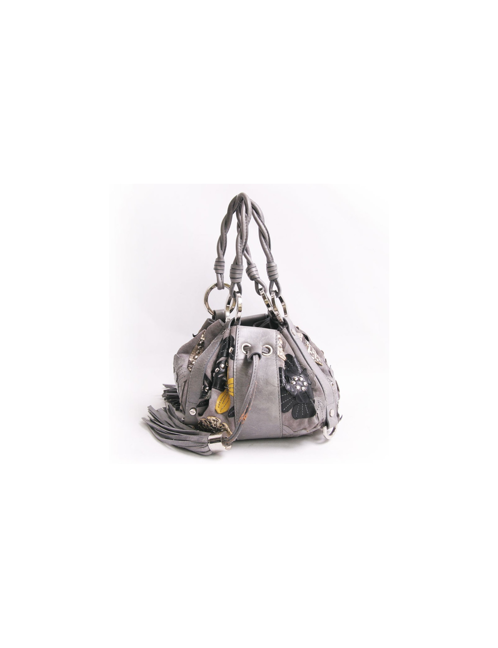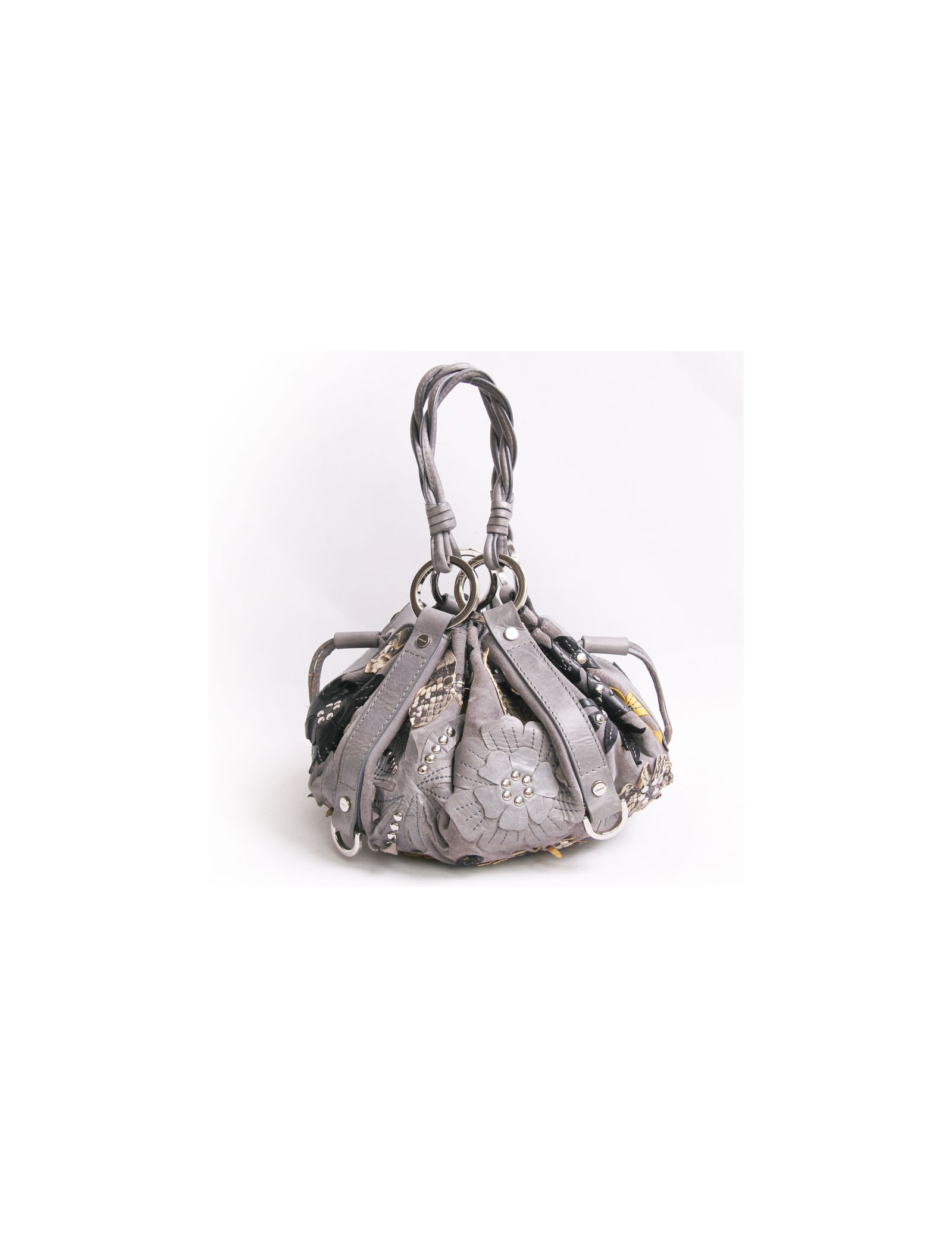 Mini bourse Givenchy gris avec empiècements de fleurs en cuir et python multicolores. La garniture est en métal argenté. Double poignée. Deux ponpons sur le côté servent à resserrer le sac. En très bon état. Légère décoloration des liens en cuir. Voir photos.