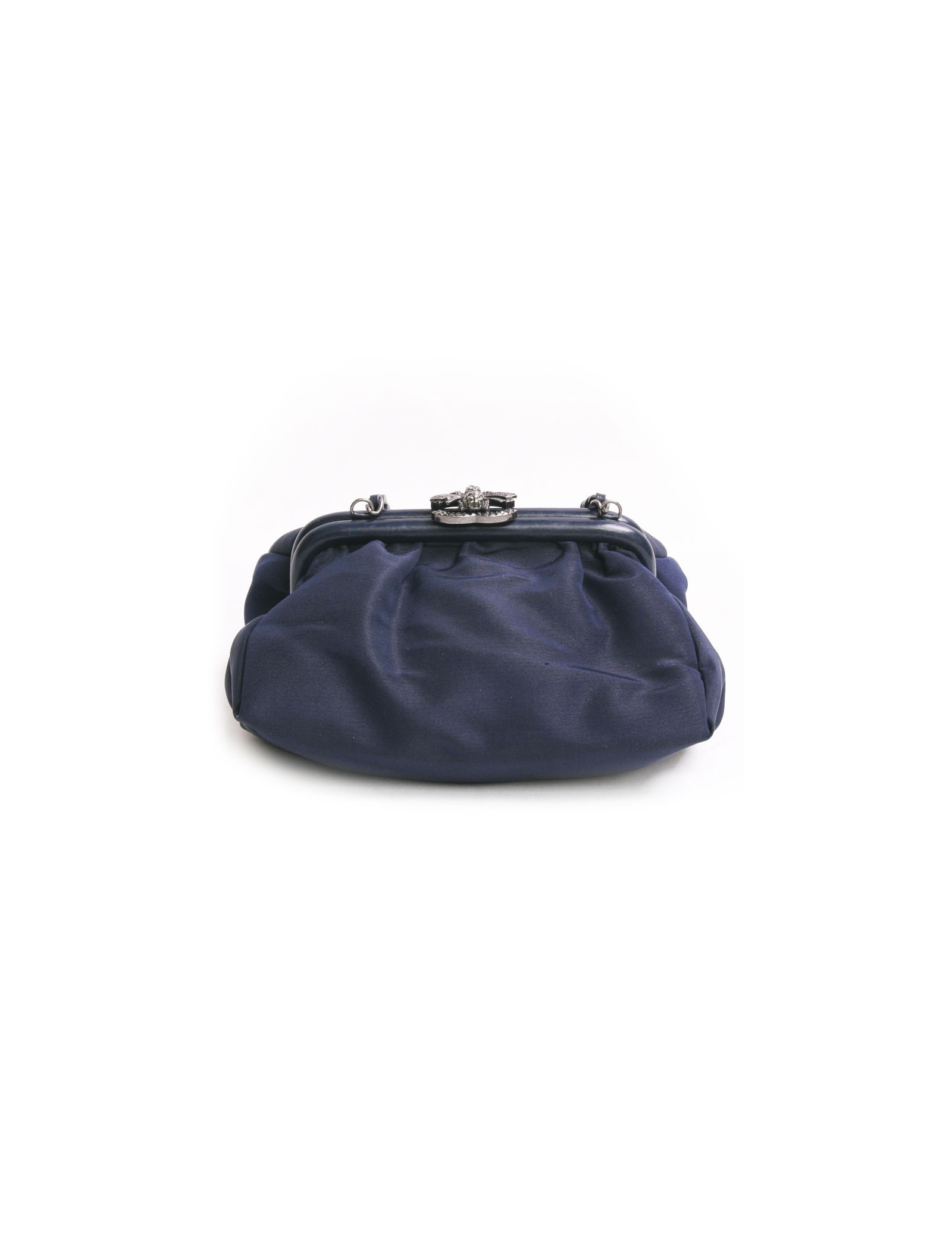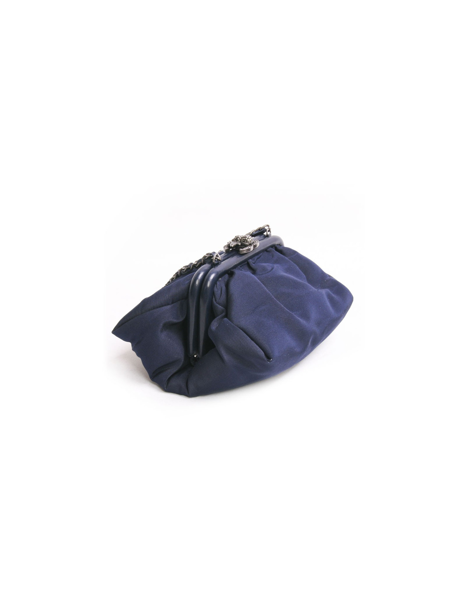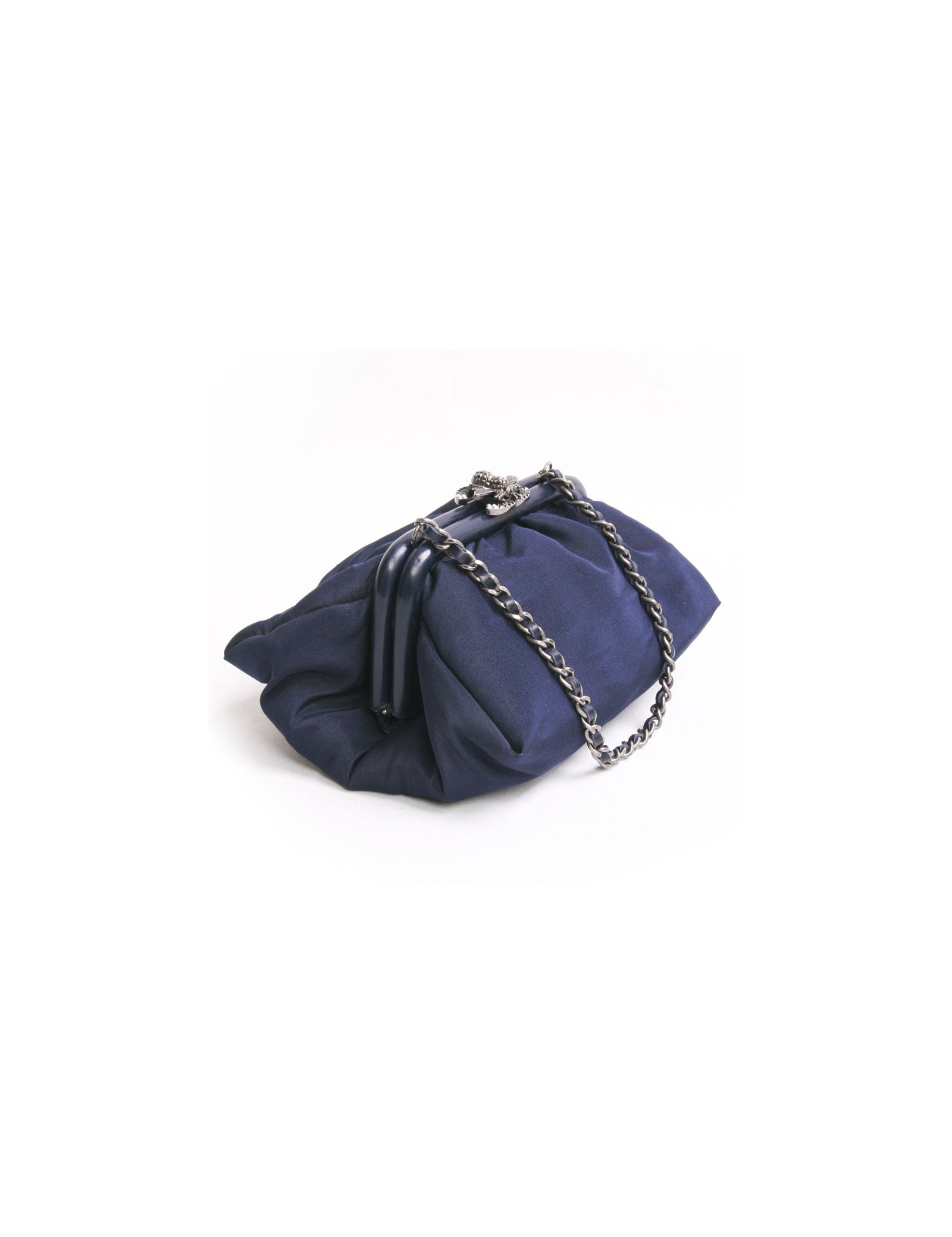 Sac pochette de la Maison Chanel en toile bleu avec pour fermoir un bijou en forme d'abeille. Il peut se porter au bras à l'aide d'une anse en cuir bleu et chaine en métal argenté et également à la main lorsque l'on rentre la chaine à l'intérieur. En très bon état.