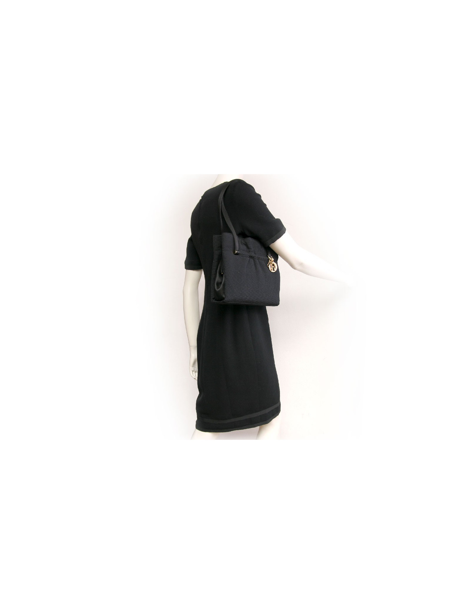 Sac Christian Dior en piqué et satin de soie de couleur bleu marine. La bijouterie est en métal doré. L'intérieur est en satin de la même couleur que le sac avec une poche zippée. Il provient des soldes. En très bon état. Très peu porté.