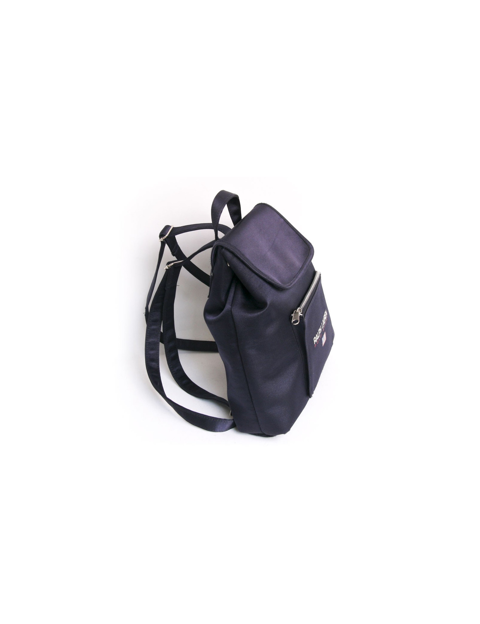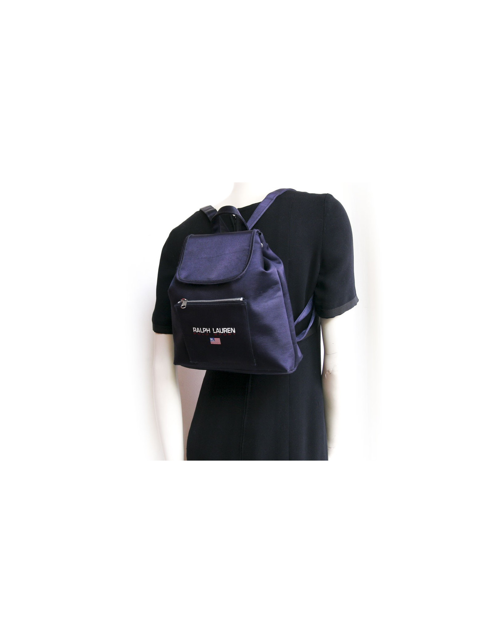 Sac à dos Ralph Lauren en toile bleu marine brillant. Fermeture par bouton pression. Petite poche à l'avant, fermeture zippée. Il peut se porter à la main à l'aide d'une poignée ainsi qu'au dos. Les anses dans le dos sont réglables avec un système de glissière. En très bon état. Légère griffure sur l'une des anses. Voir photos.