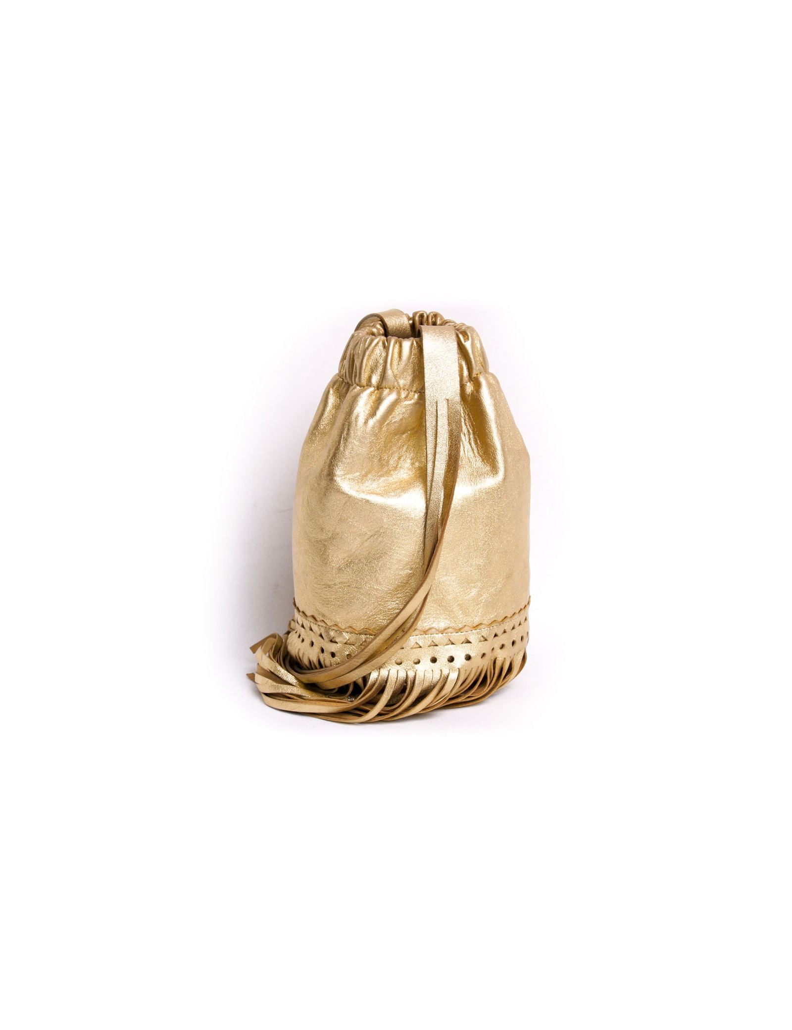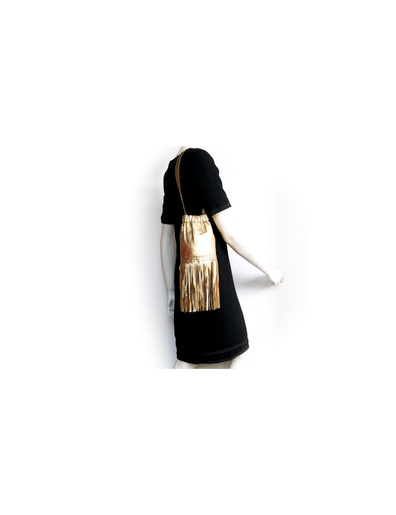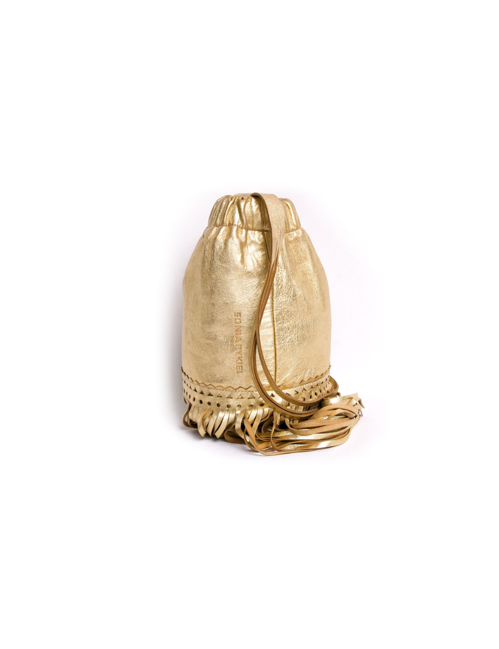 Charmant sac Sonia Rykiel en cuir lamé doré. Il se porte à l'épaule à l'aide d'une anse. Il dispose de franges en bas du sac. L'inscription "Sonia Rykiel Paris est gravé sur le sac. En très bon état.