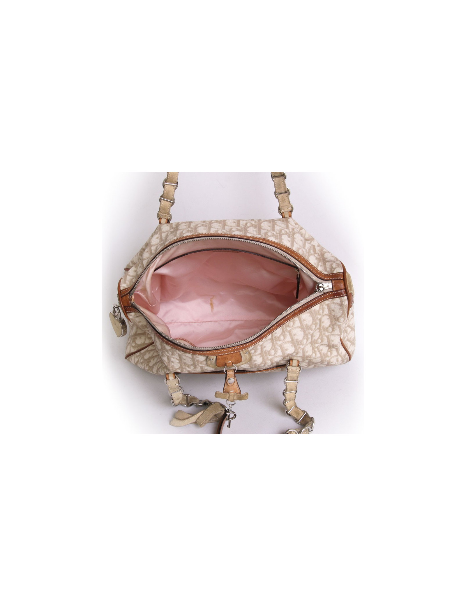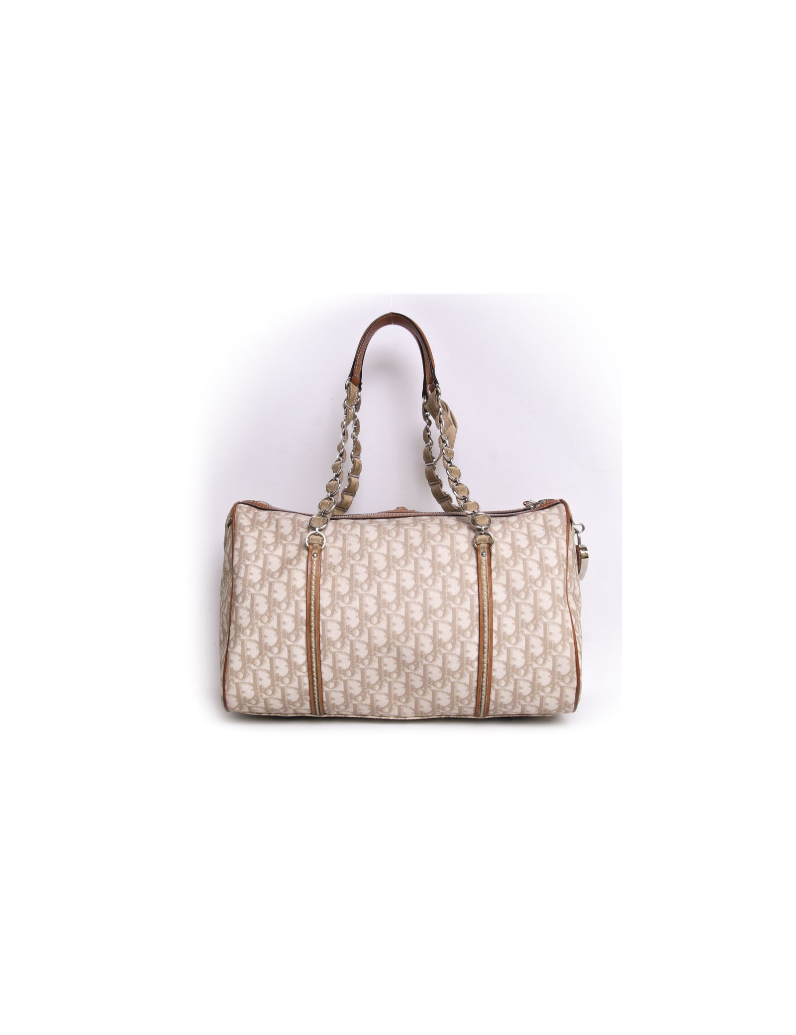 Sac Christian Dior en toile monogram enduite ivoire et marron. La bijouterie est en métal argenté. Fermeture zippée. L'intérieur est en satin rose avec une poche zippée ainsi qu'une poche pour smartphone. Il se porte à l'épaule à l'aide de deux anses en cuir marron, daim beige et chaîne argentée. Il dispose d'une poche plaquée à l'avant. En très bon état.