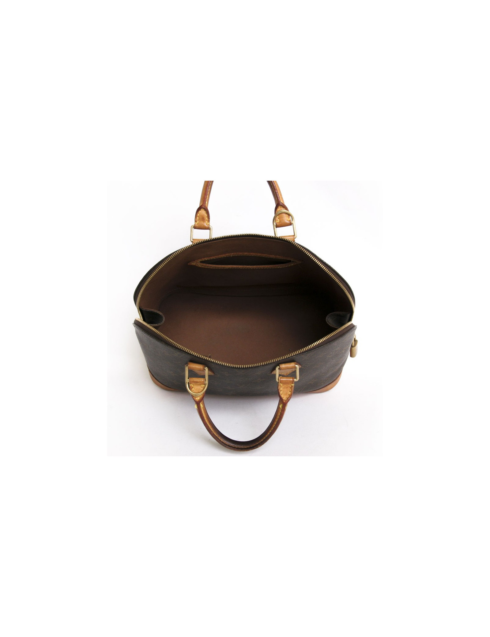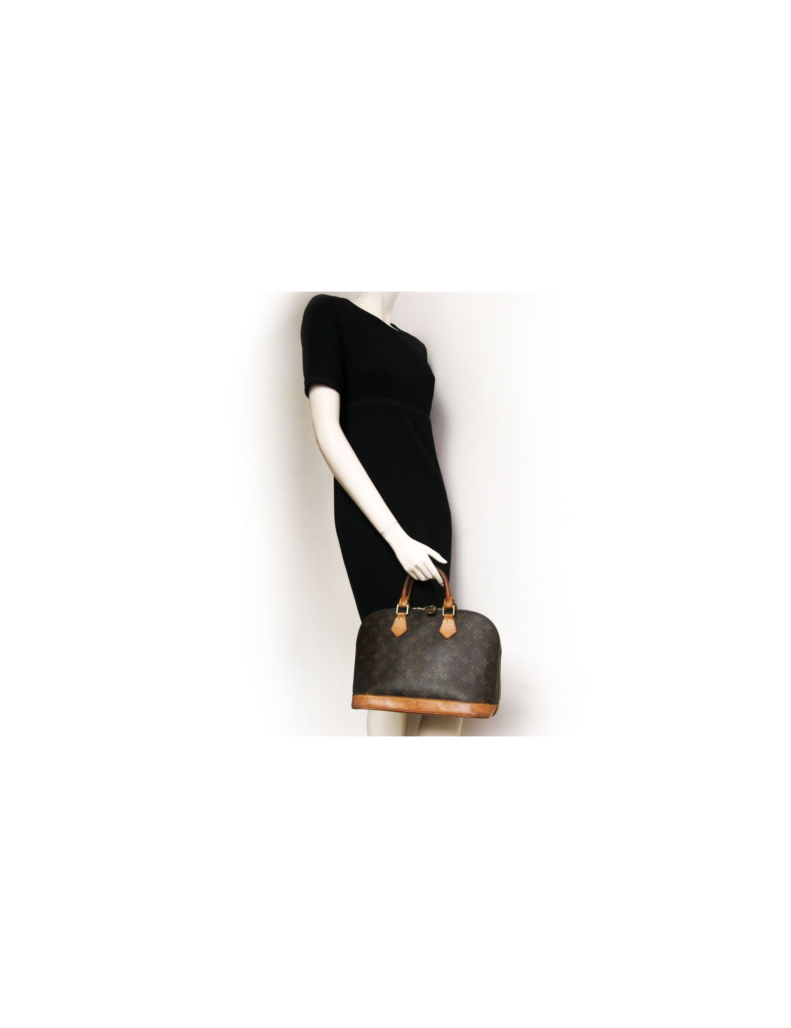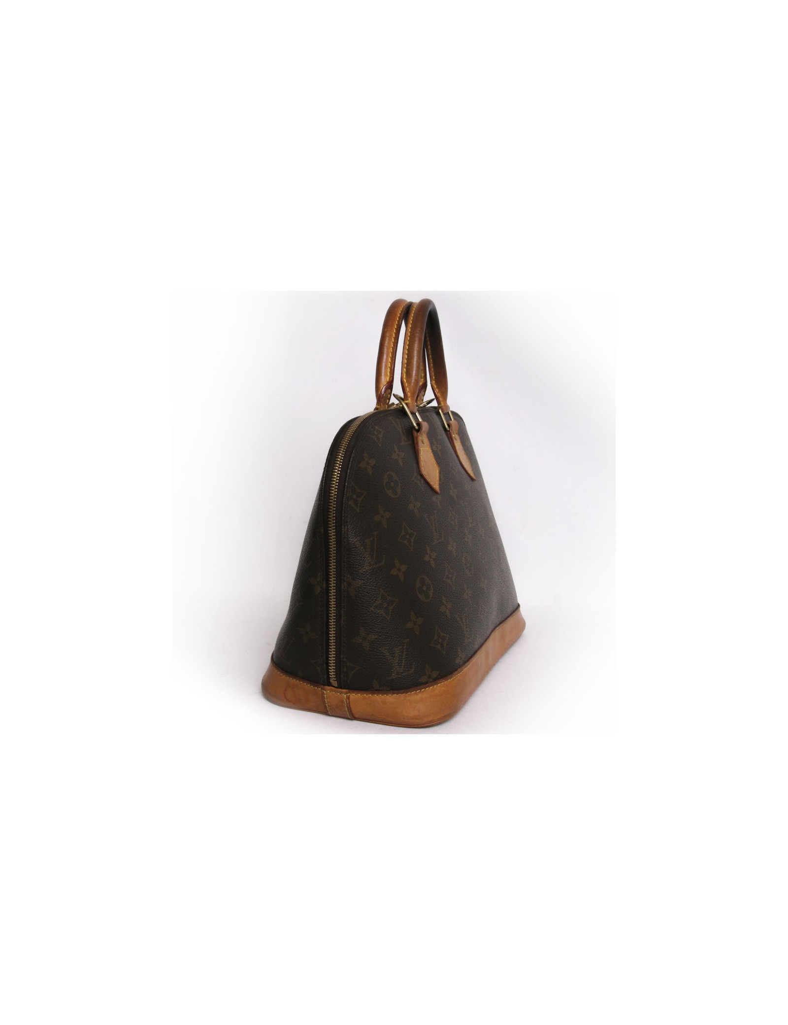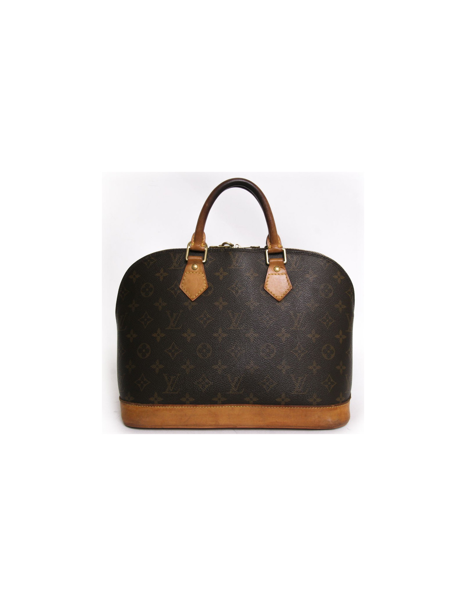 Sac "Alma" de la Maison Louis Vuitton en toile monogram marron vintage. Crée en 1930, Il est le plus structuré des sacs iconiques de la marque. En hommage au Pont de l'Alma, Il reflète le chic parisien. Porté main. Double fermeture à glissière avec cadenas. Pièces métalliques en laiton doré. Finitions en cuir de vache naturel. A l'intérieur, une poche plaquée ainsi qu'une autre pour smartphone. Etat vintage. Le cuir est patiné. Quelques taches sont visibles sous le sac.