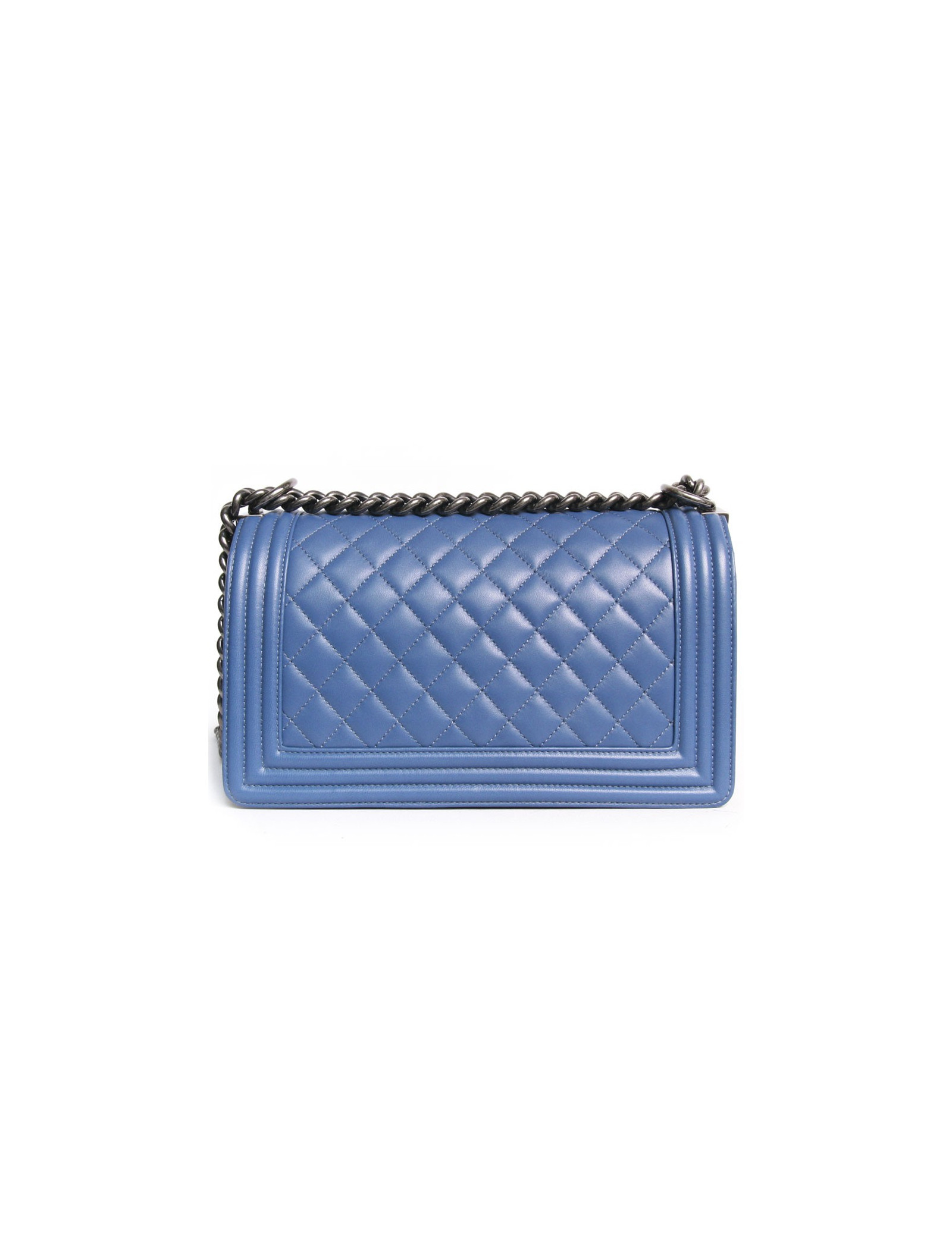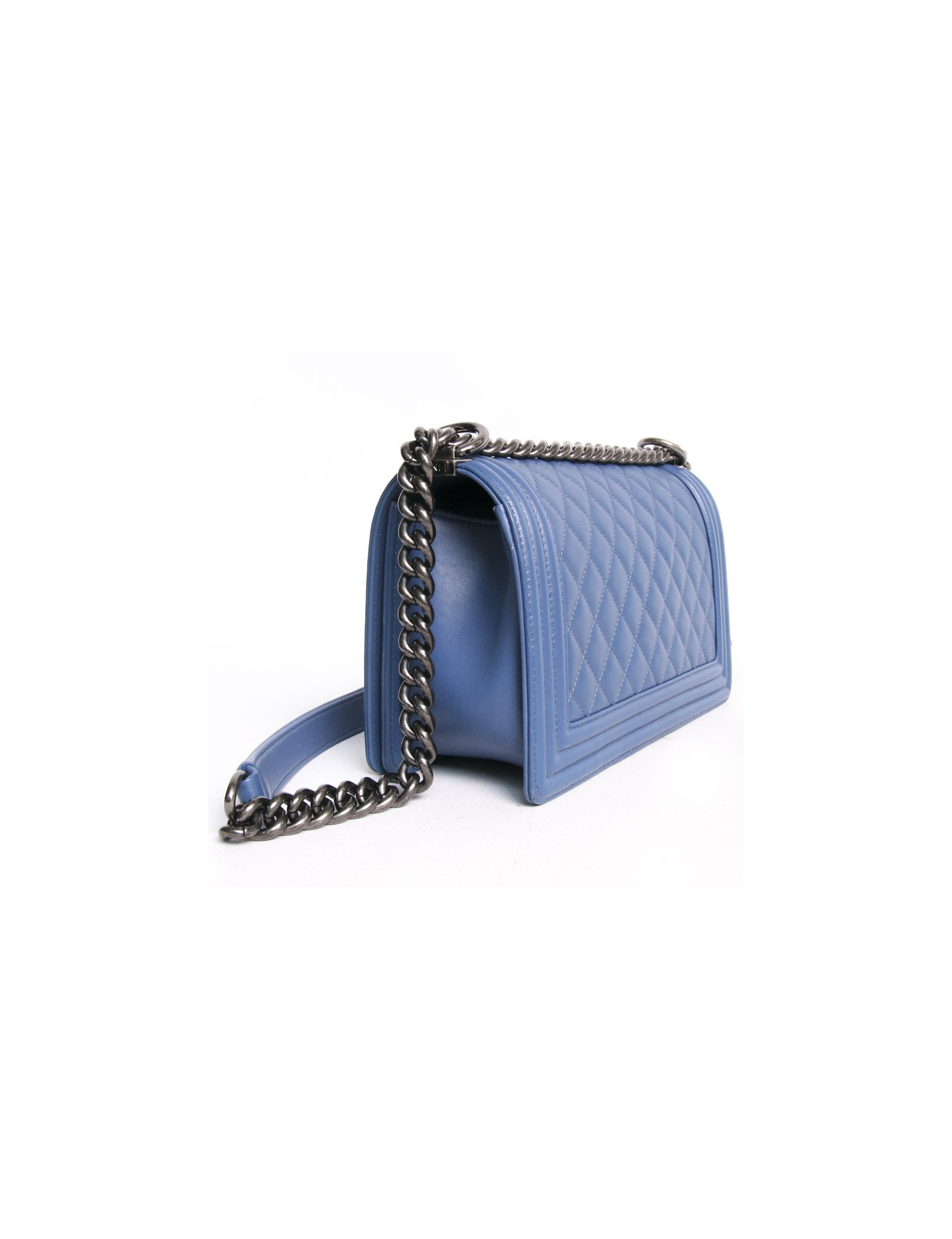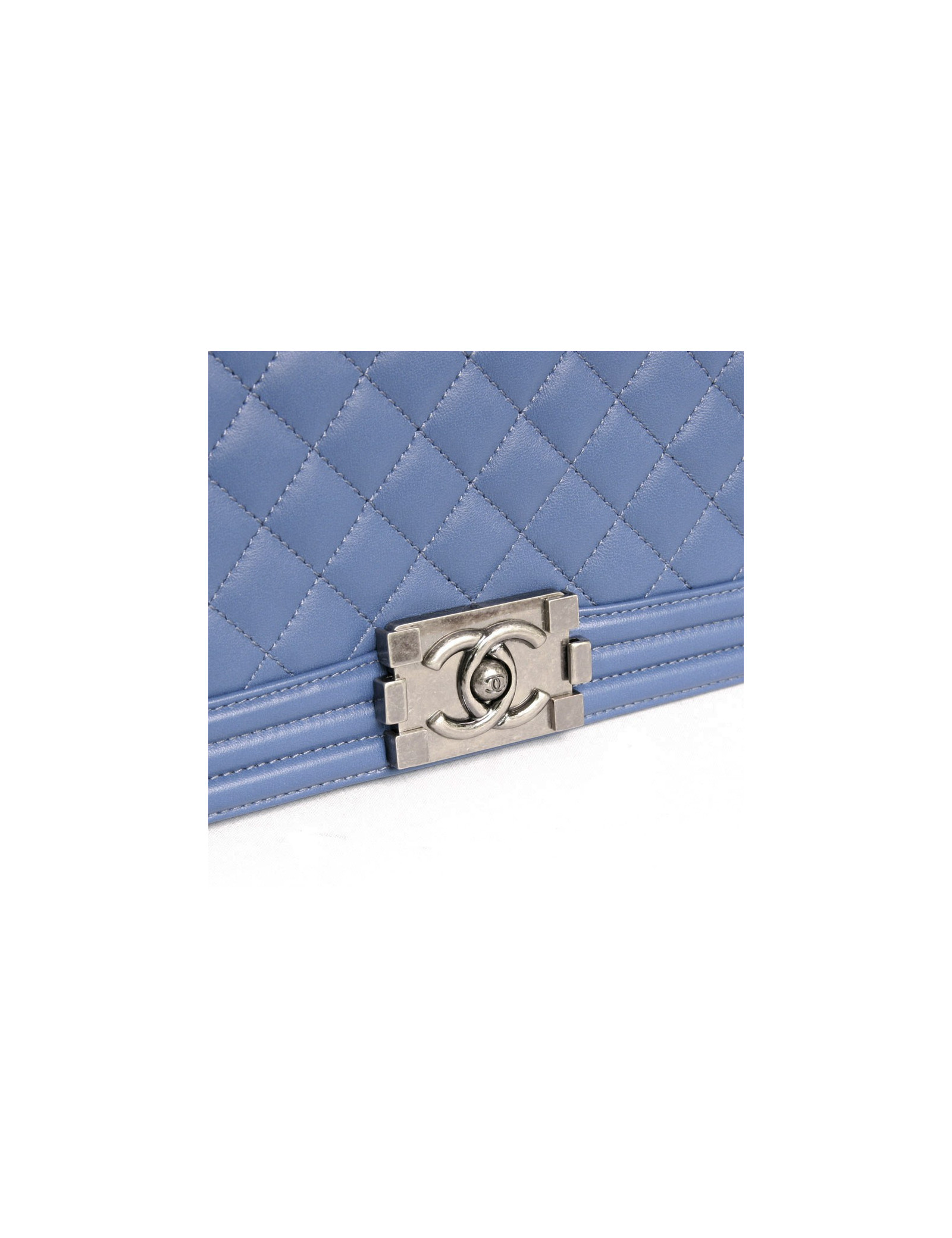 Mythique sac "Boy" de la Maison Chanel en cuir d'agneau matelassé bleu. La bijouterie est en métal argenté vieilli. Il se porte à l'épaule à l'aide d'une bandoulière en cuir et chaine. L'intérieur est en toile grise avec une petite poche plaquée. Hologramme: 1769... En très bon état. Très légère usure des coins sous le sac.