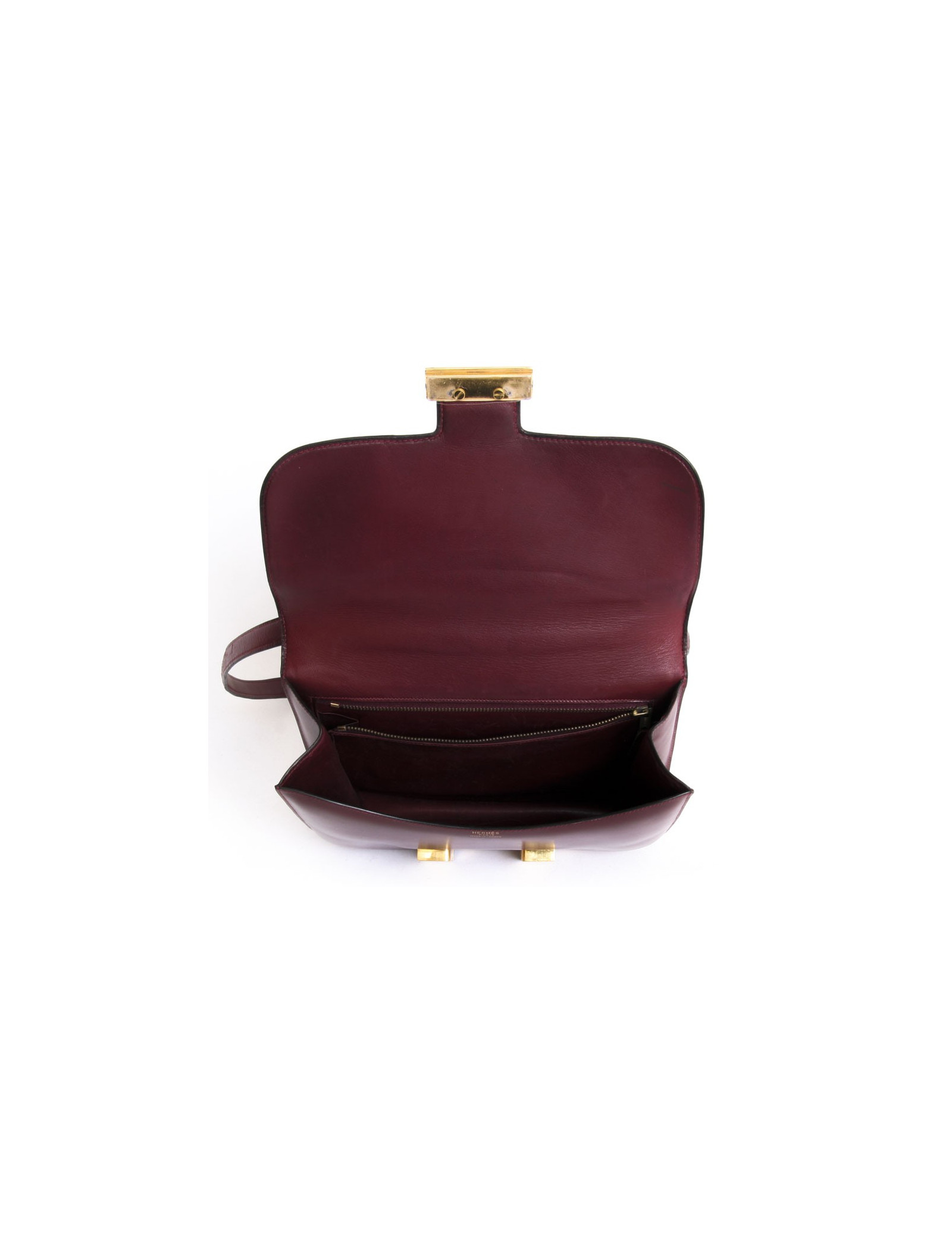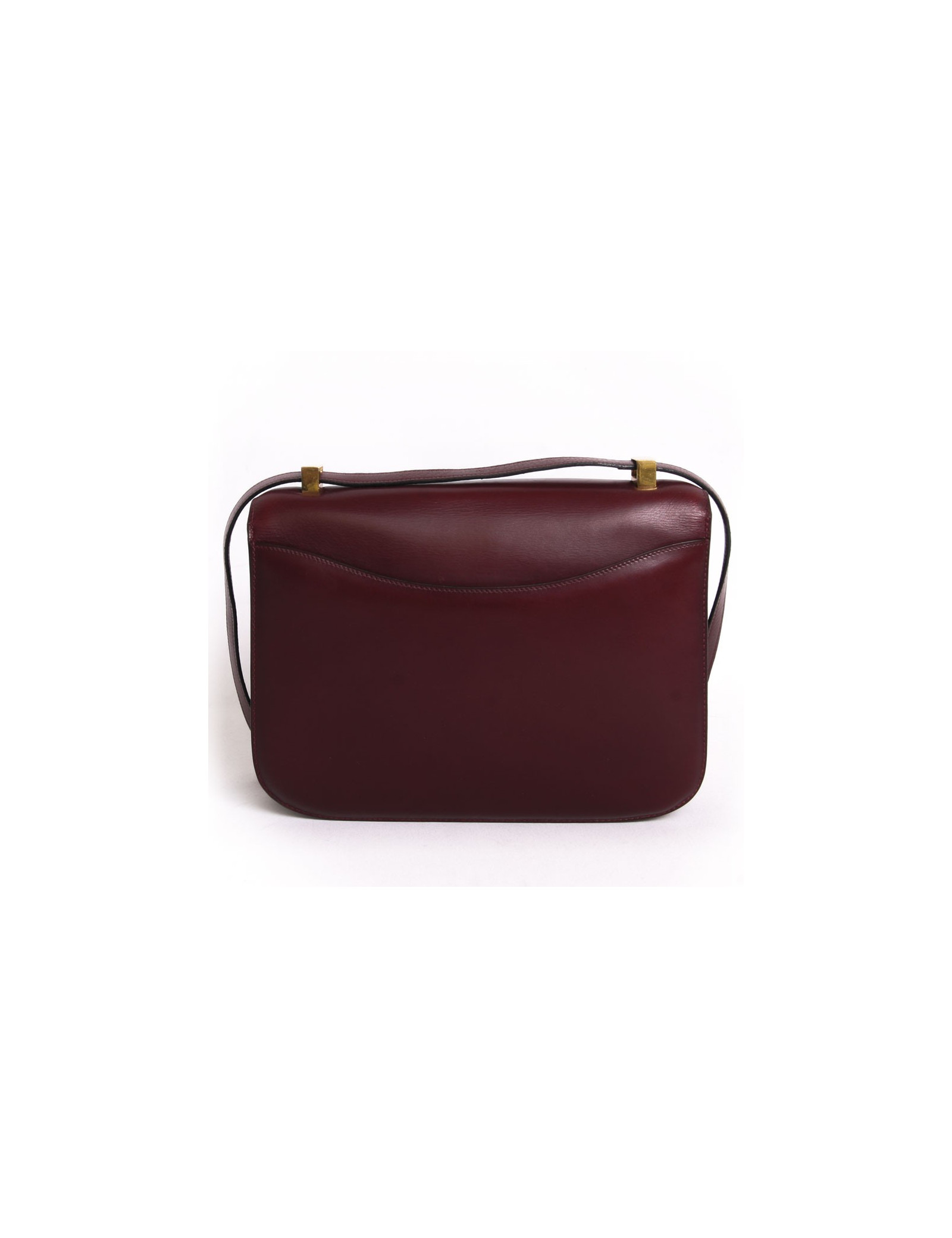 Mythique sac "Constance" de la Maison Hermès en cuir box rouge H, (griffure sur le côté). Fermoir figurant un H en métal plaqué or, doublure en agneau plongé rouge H comprenant une poche à fermeture sur glissière, une poche plaquée et bandoulière (le cuir est abîmé) poche au dos. Etat vintage. micro rayures sur la bijouterie. Voir photos. Il se porte à l'épaule.