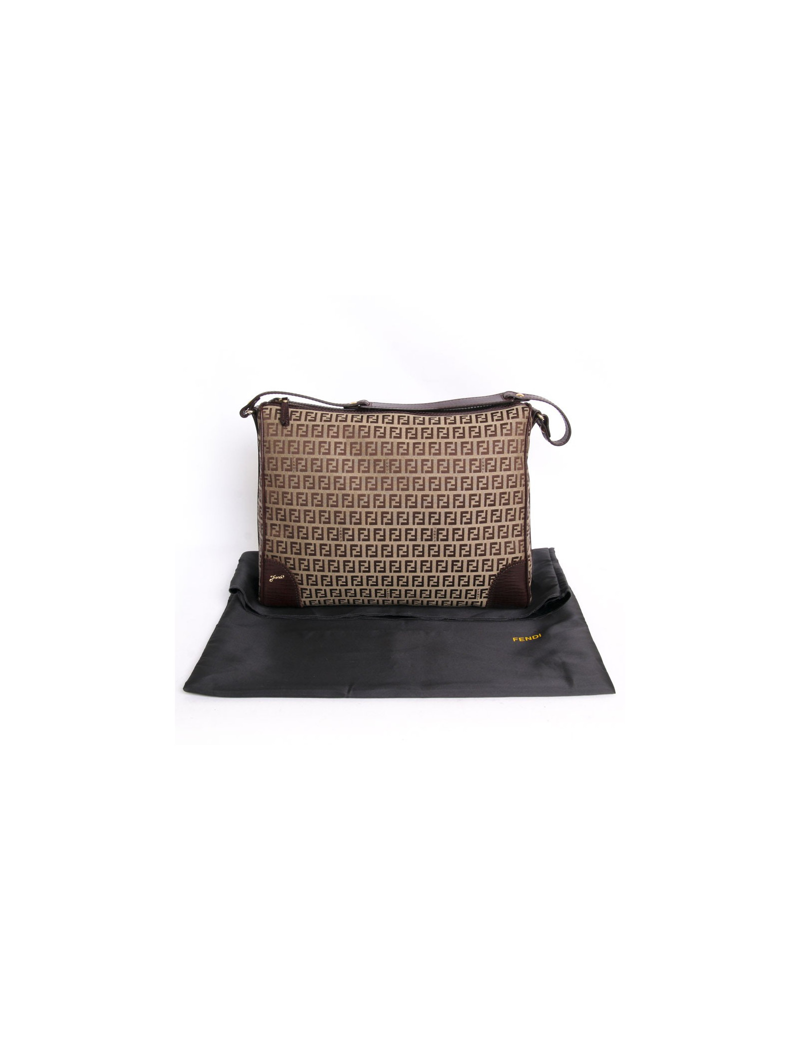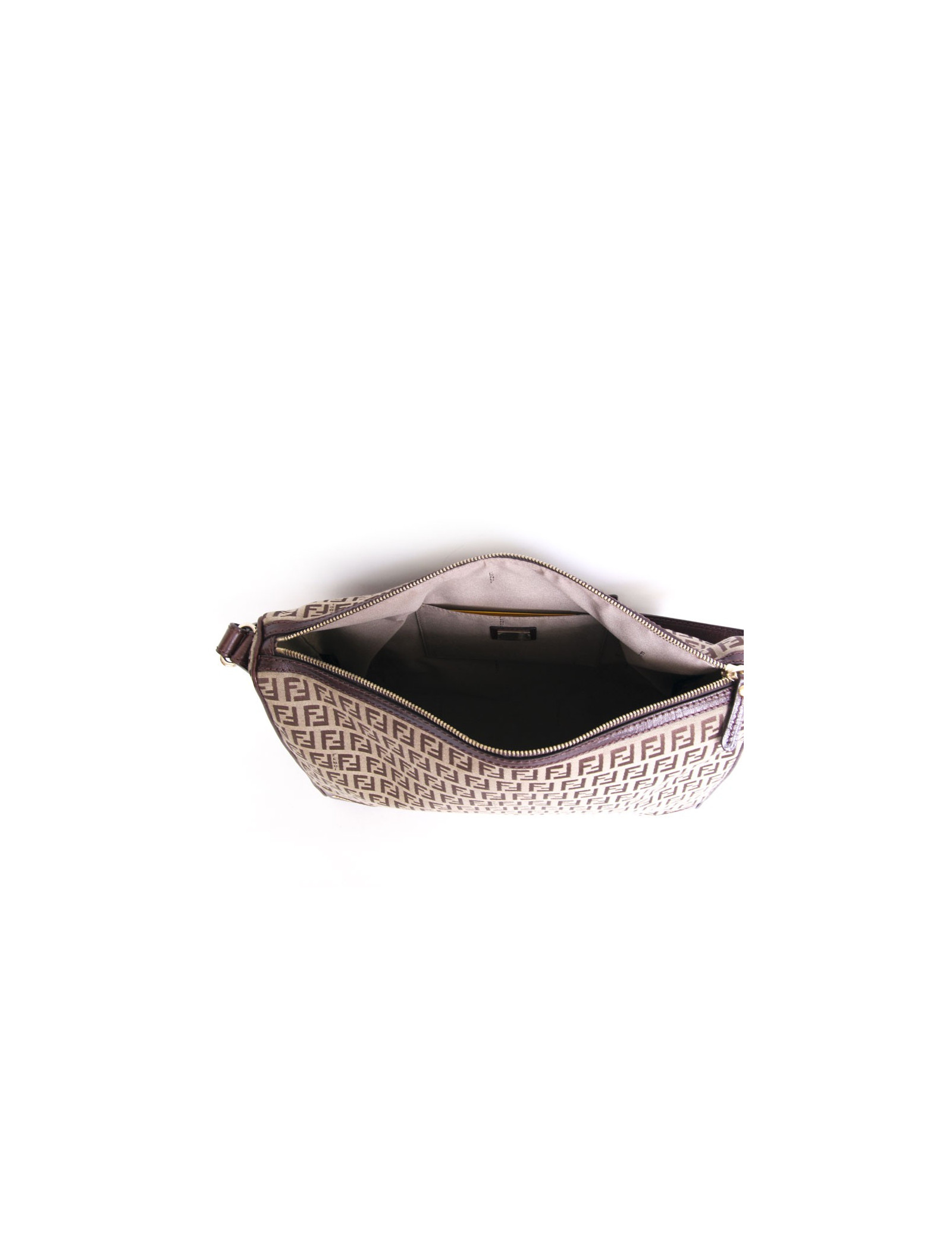Sac sacoche Fendi en toile monogram et cuir marron. La bijouterie est en métal doré. Fermeture zippée. L'intérieur est en toile beige avec une petite poche plaquée. Grand espace de rangement pour y glisser tous vos accessoires. Etat neuf.