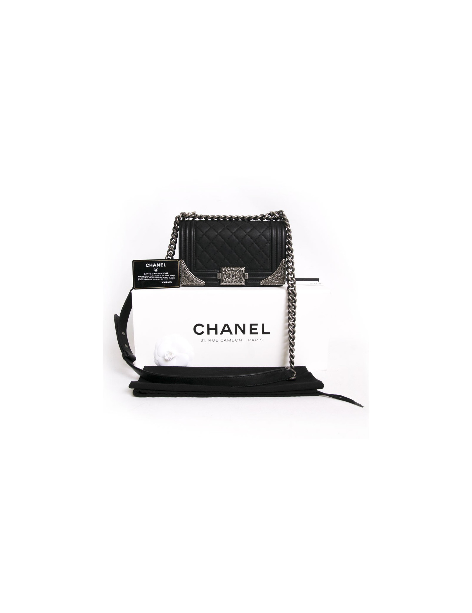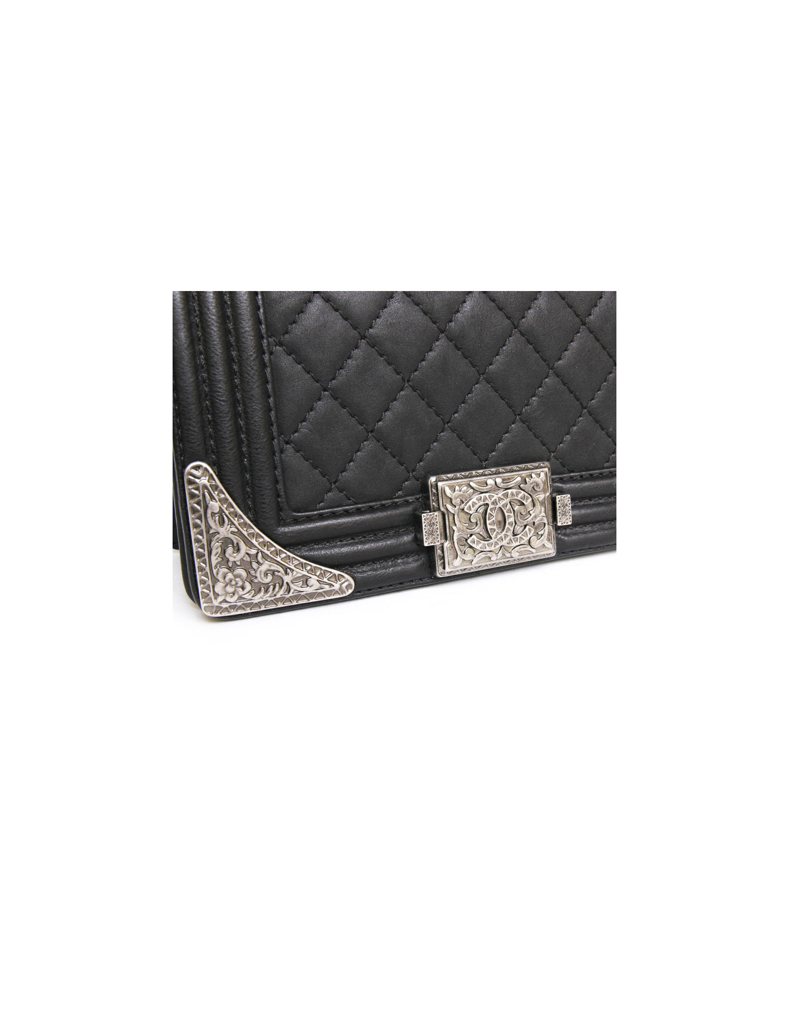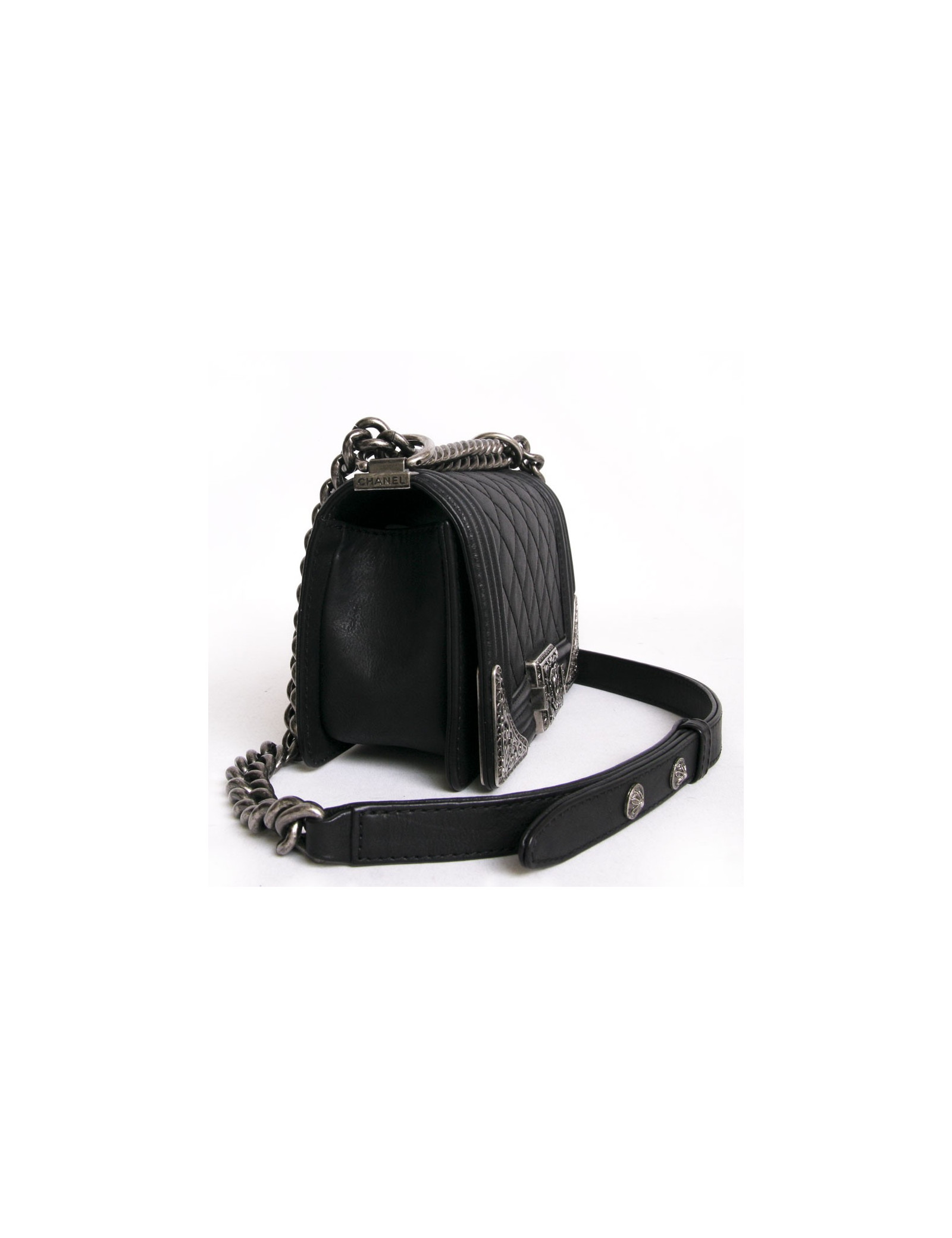 Sublime! Pièce rare! Sac Boy de la Maison Chanel, collection "Paris-Dallas" édition limitée. Il est en cuir noir matelassé. Il se porte à l'épaule ou en crossover à l'aide d'une bandoulière en cuir et chaine en métal argenté vieilli. Fermoir "Boy".