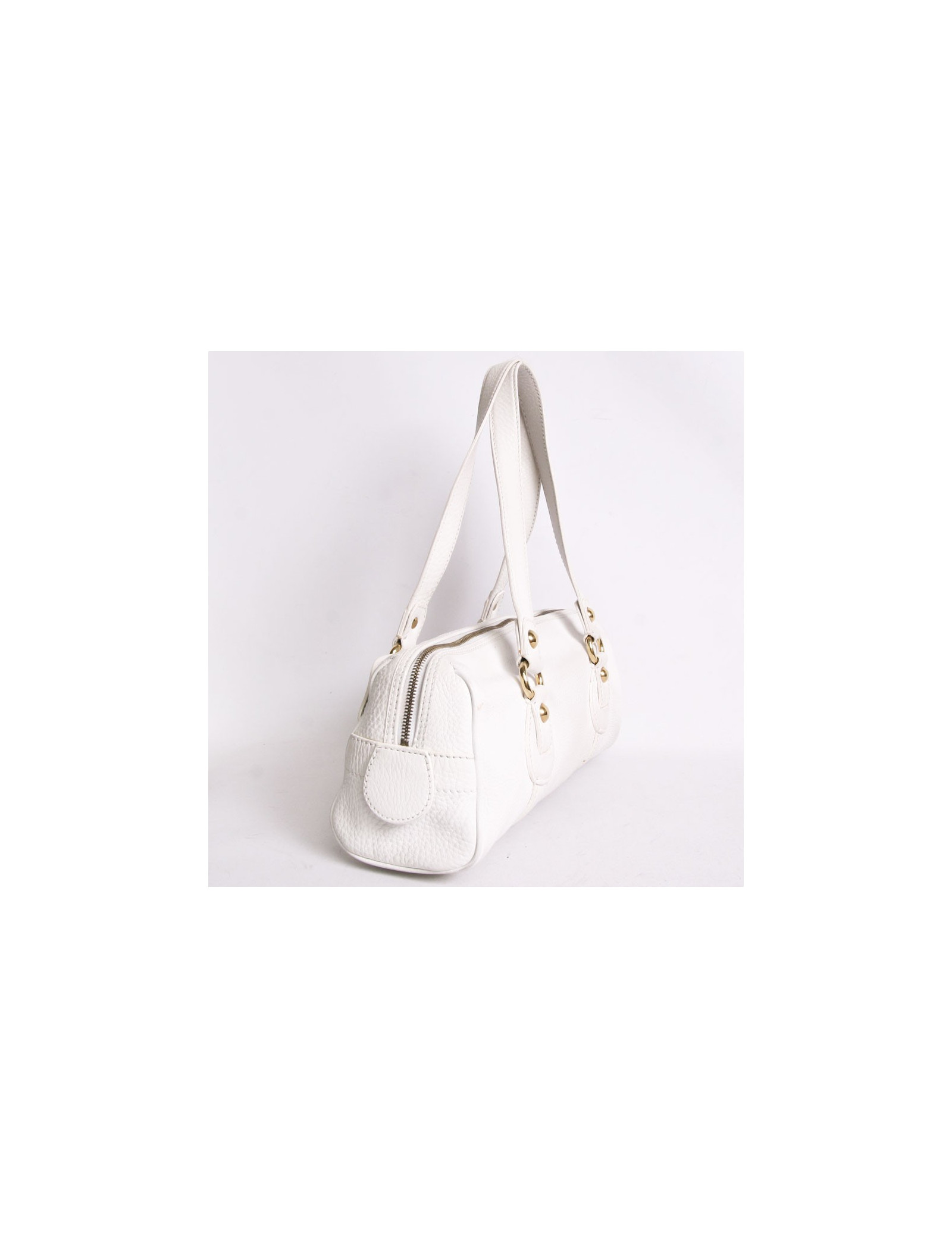 Sac Céline en taurillon clémence blanc et bijouterie dorée. L'intérieur est en daim beige et muni d'une poche plaquée zippée. Sur l'avant du sac, il y a une poche qui se ferme par un bouton pression, la fermeture principale est zippée. Le sac peut se porter aussi bien à l'épaule qu'au bras. En très bon état. Quelques tâches sont à signaler à l'intérieur du sac par le frottement ainsi qu'une petite tache visible sur l'arrière gauche du sac.