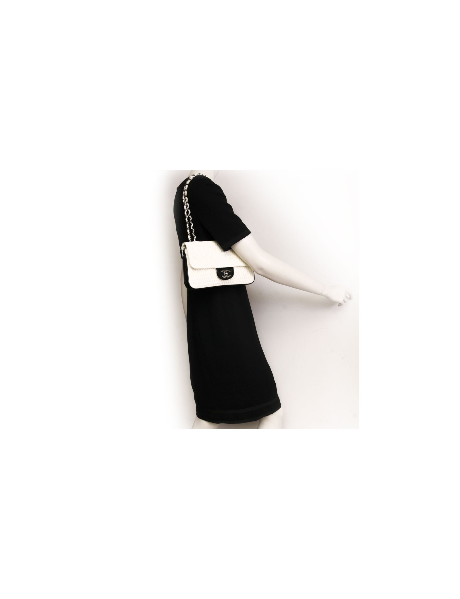Authentique sac de la maison Chanel en cuir gauffré coquille d'oeuf et verni noir; La bijouterie et la chaîne sont en métal argent. L'intérieur est en toile noire, il dispose de deux espaces de rangement ainsi qu'une poche zippée. Fermoir CC. Provient des soldes. En très bon état.