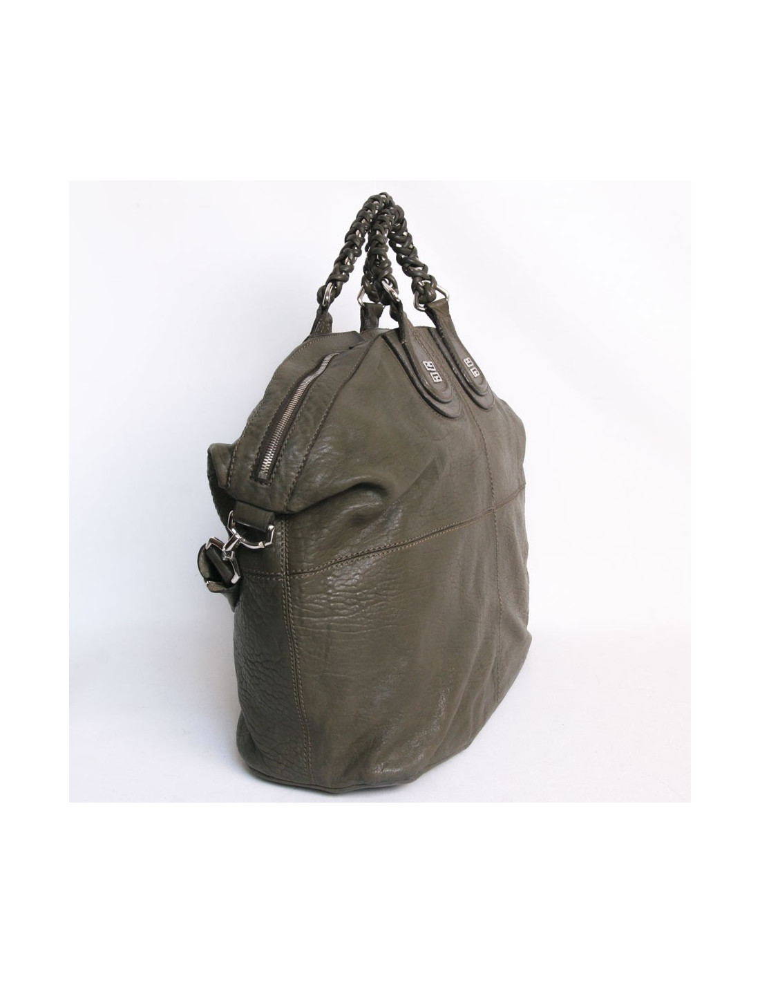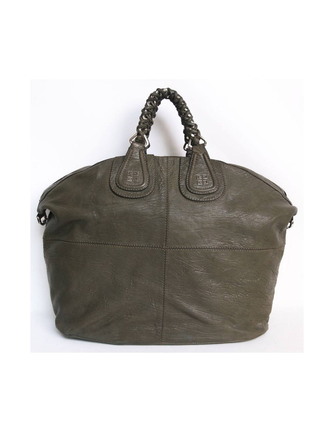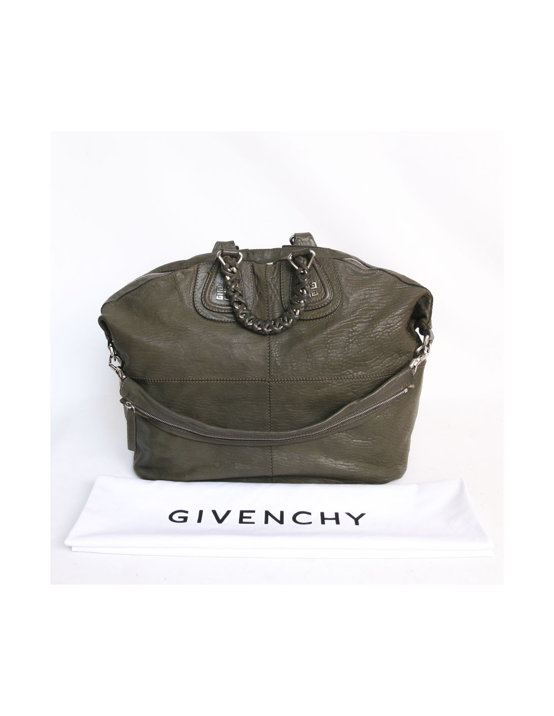 Sac besace "nightingale" Givenchy en cuir vert kaki. Fermeture zippée. L'intérieur est en toile beige avec 3 poches dont une zippée et une pour un smartphone. La bijouterie est en métal argenté. Il dispose d'une double poignée pour un porté main ainsi qu'une bandoulière amovible pour un porté épaule. En très bon état. Quelques traces d'usure  d'usage sur les coins sous le sac ainsi que sur les deux poignées.