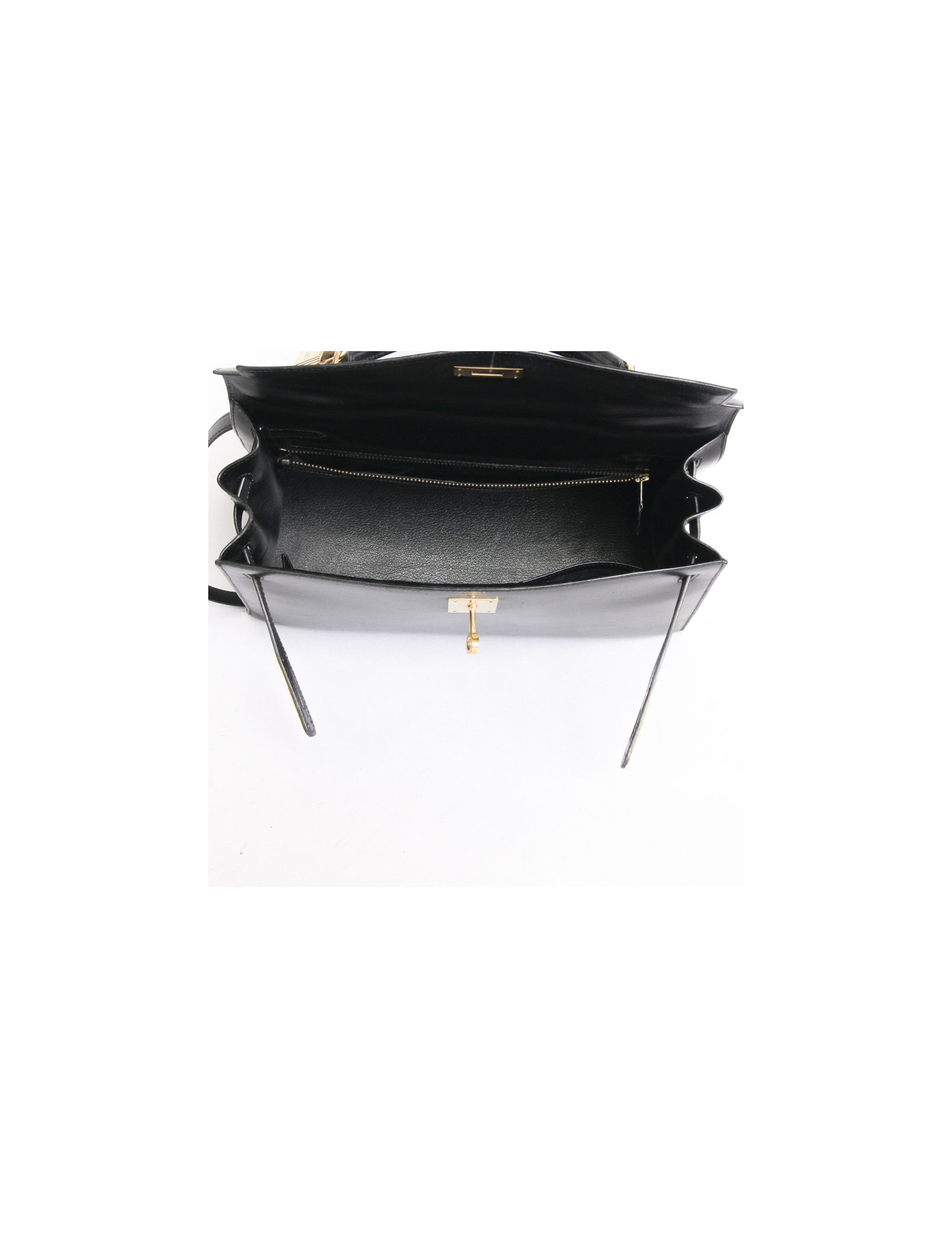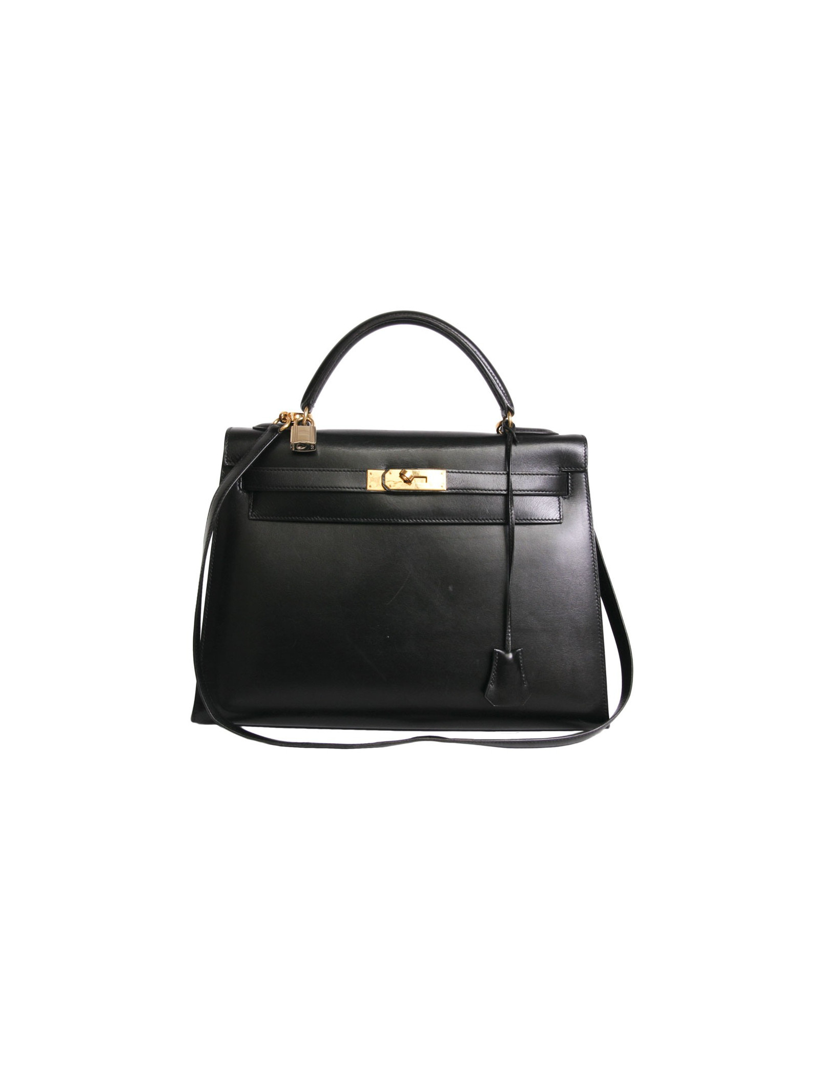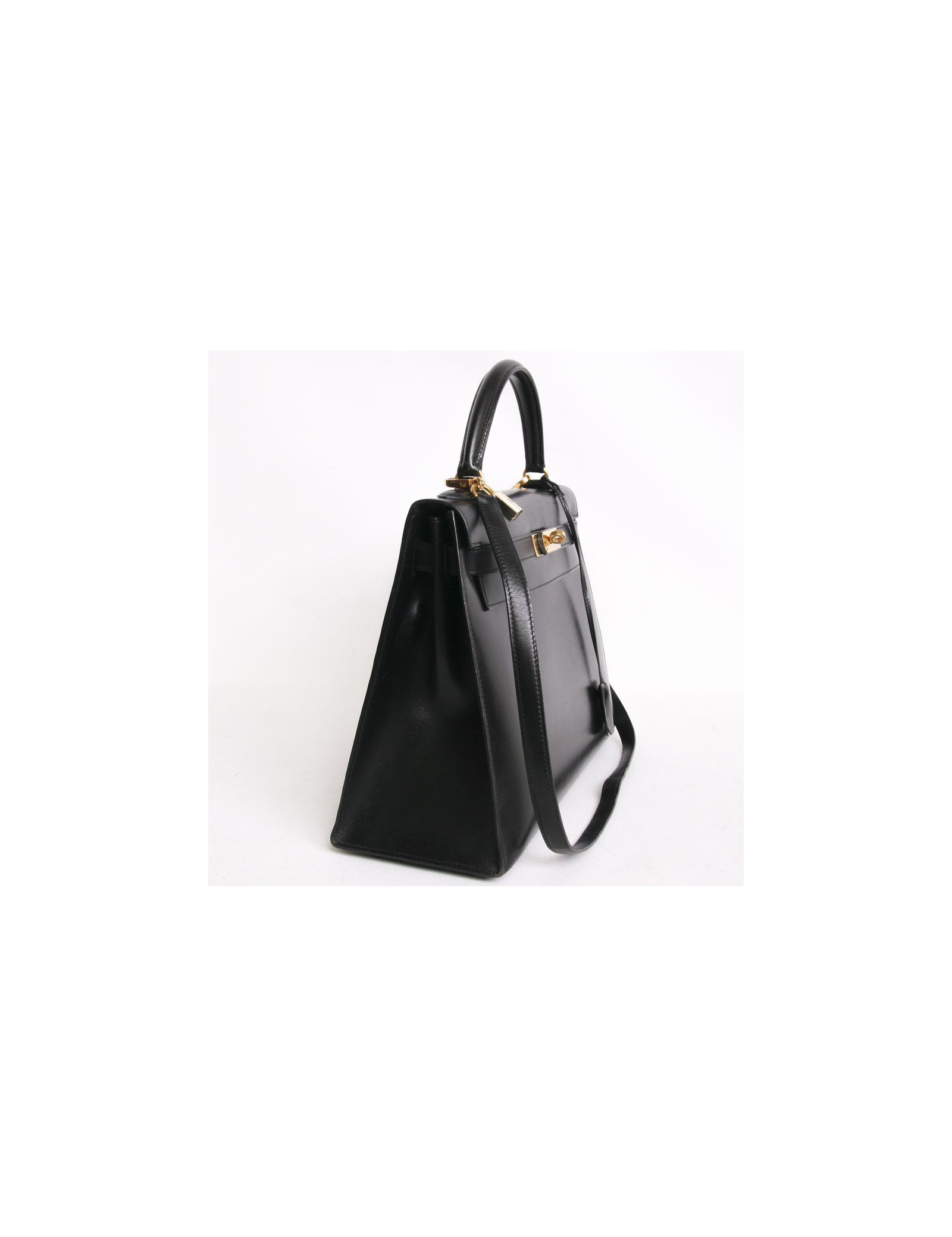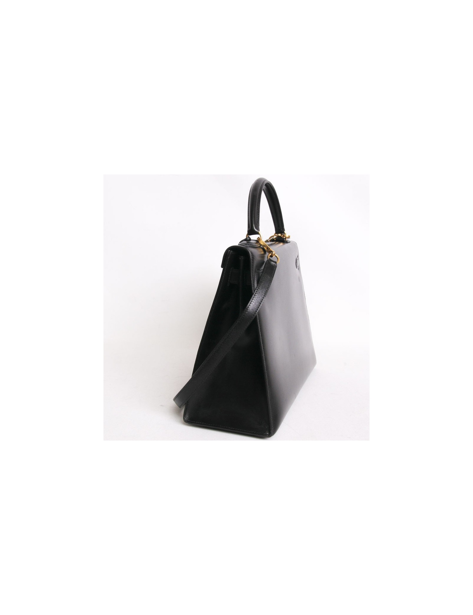 L'indémodable sac Kelly 32 de la Maison Hermès en cuir box noir piqûres sellier. La bijouterie est en métal doré. Cadenas, clochette tirette et deux clefs. Il peut se porter à la main ou à l'épaule à l'aide d'une bandoulière amovible. A l'intérieur, il dispose de 3 poches dont une zippée. Lettre V dans un rond - état exceptionnel. Quelques fines rayures d'usure parsemées à l'avant ainsi qu'à l'arrière et sous le sac. Très peu visible.