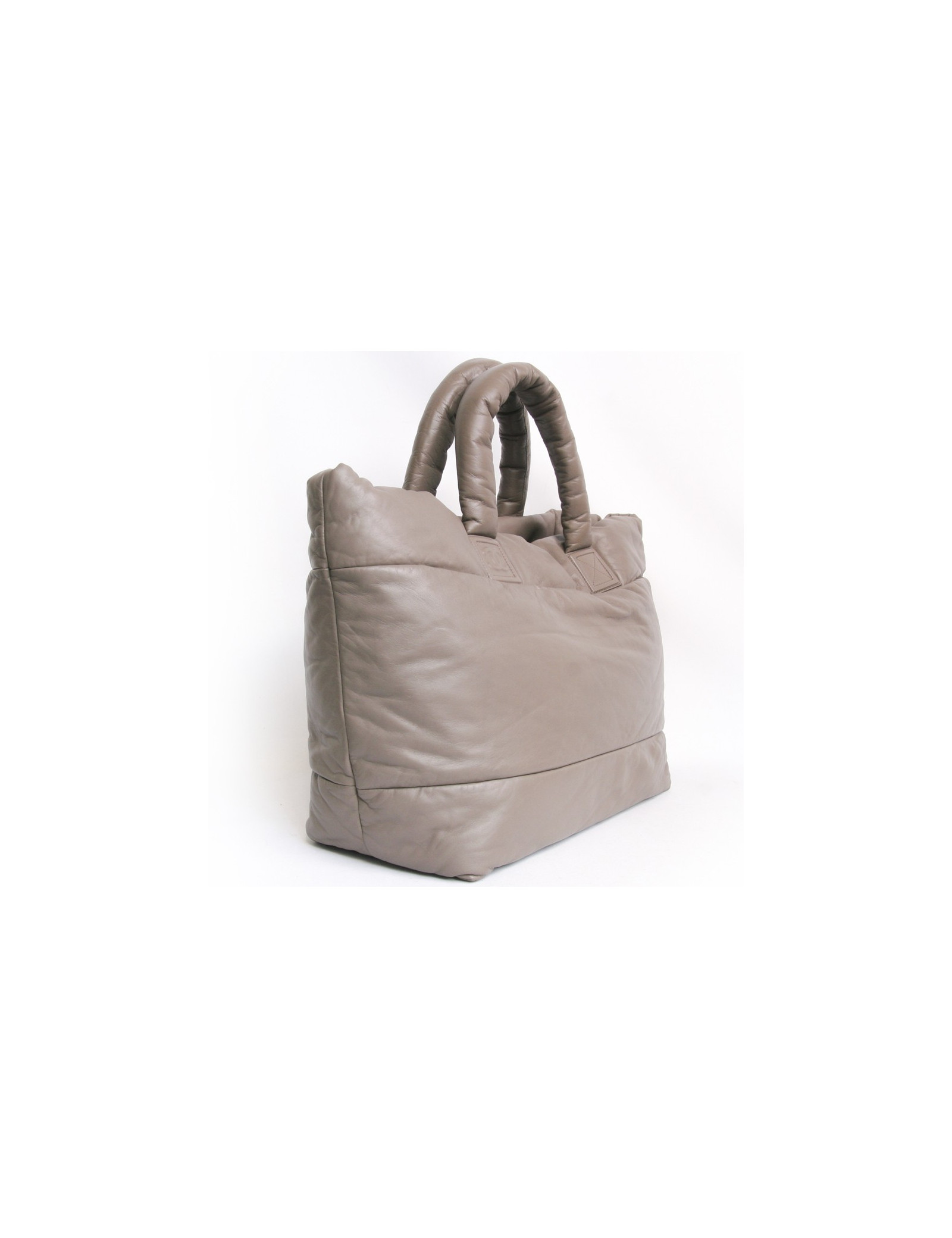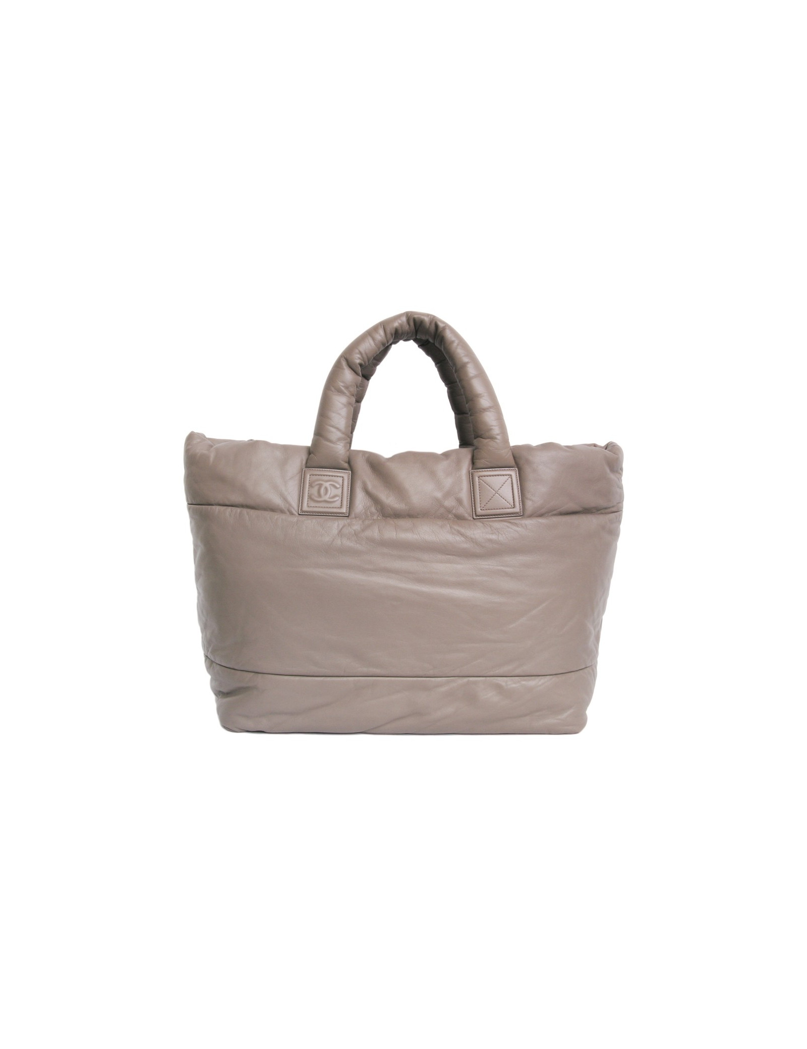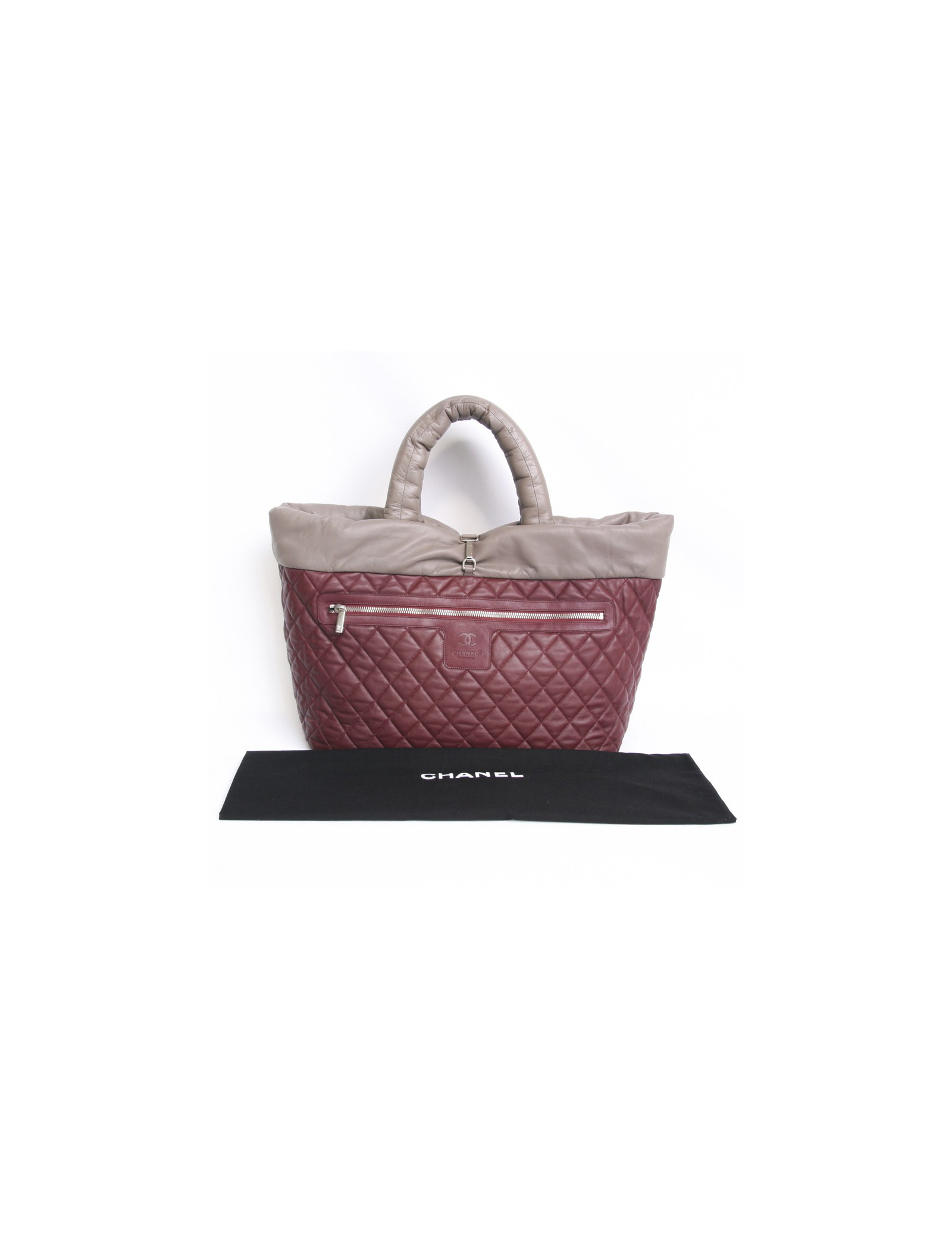 Sac "Cocoon" de la Maison Chanel en cuir souple bicolore taupe et bordeaux réversible GM. Du côté bordeaux matelassé, il dispose d'une poche zippée. L'accastillage est en métal argenté. Double poignée. Hologramme: 1311... En très bon état. Devant sous le sigle "CC" le cuir est légèrement patiné mais très peu visible.