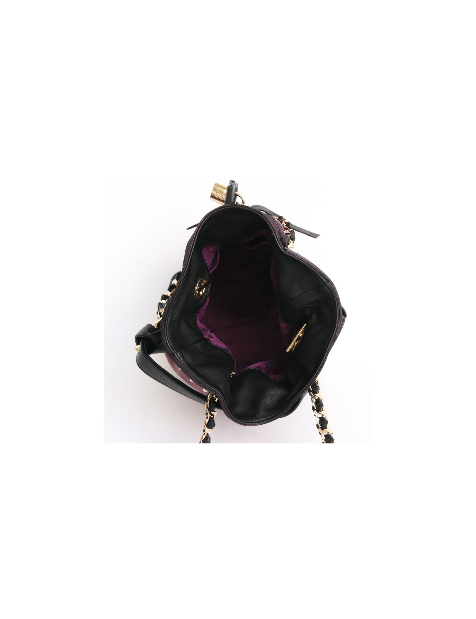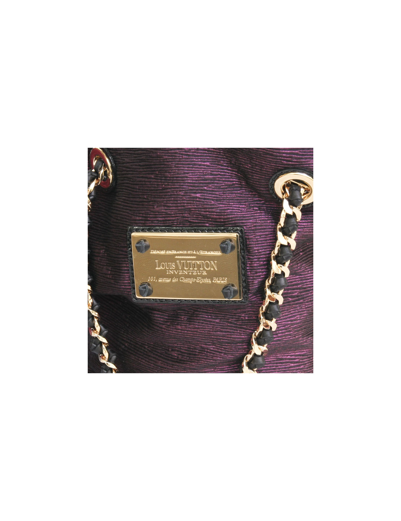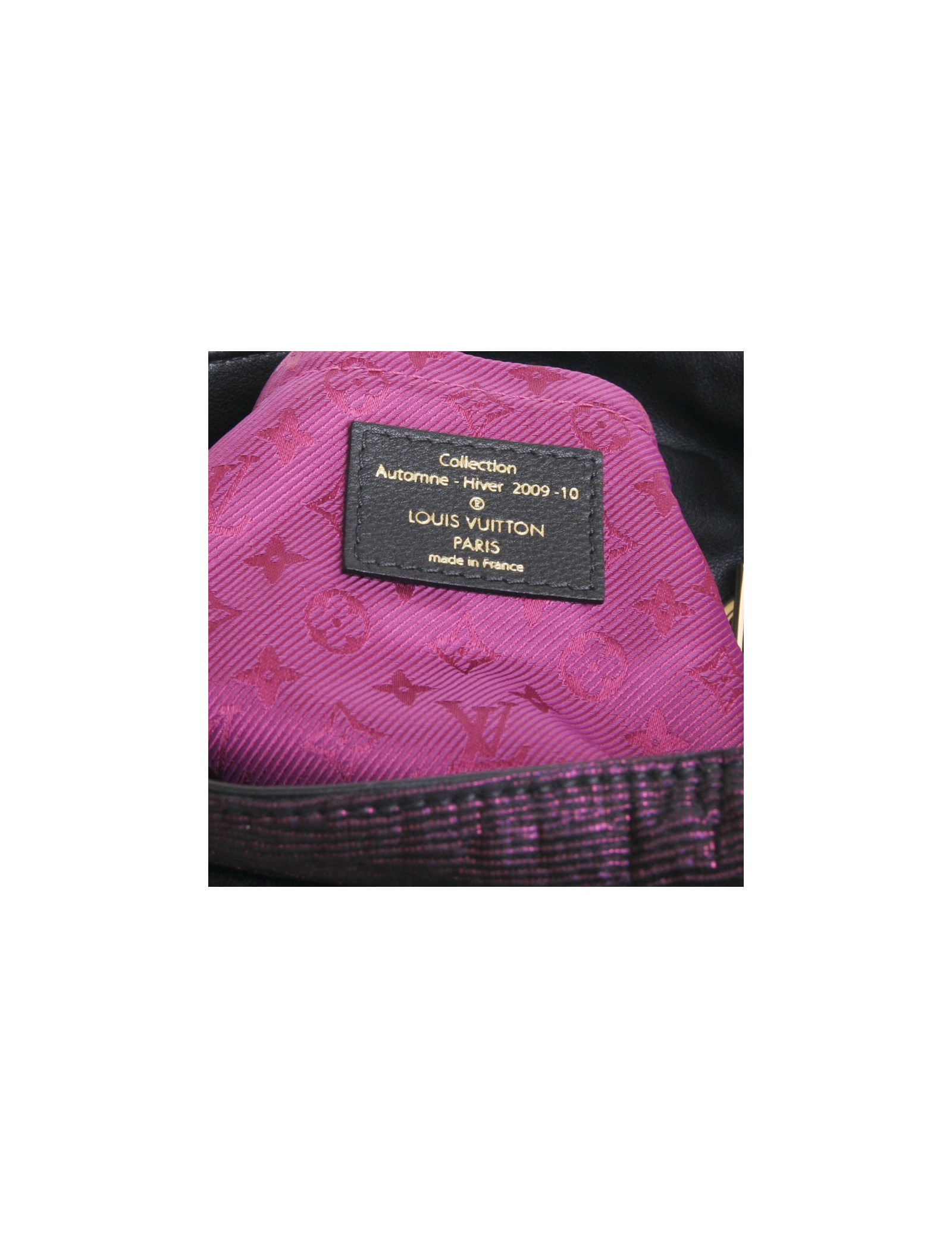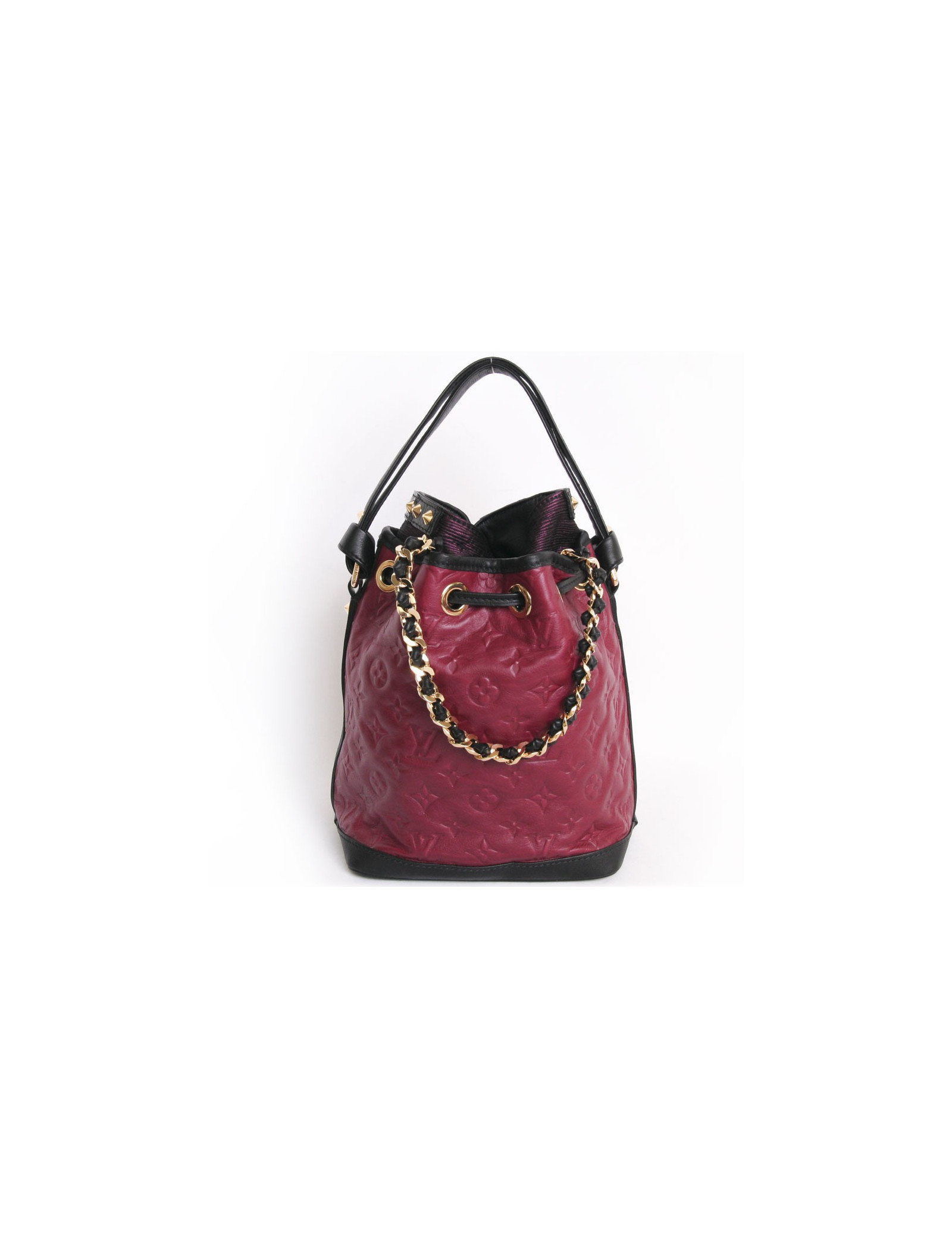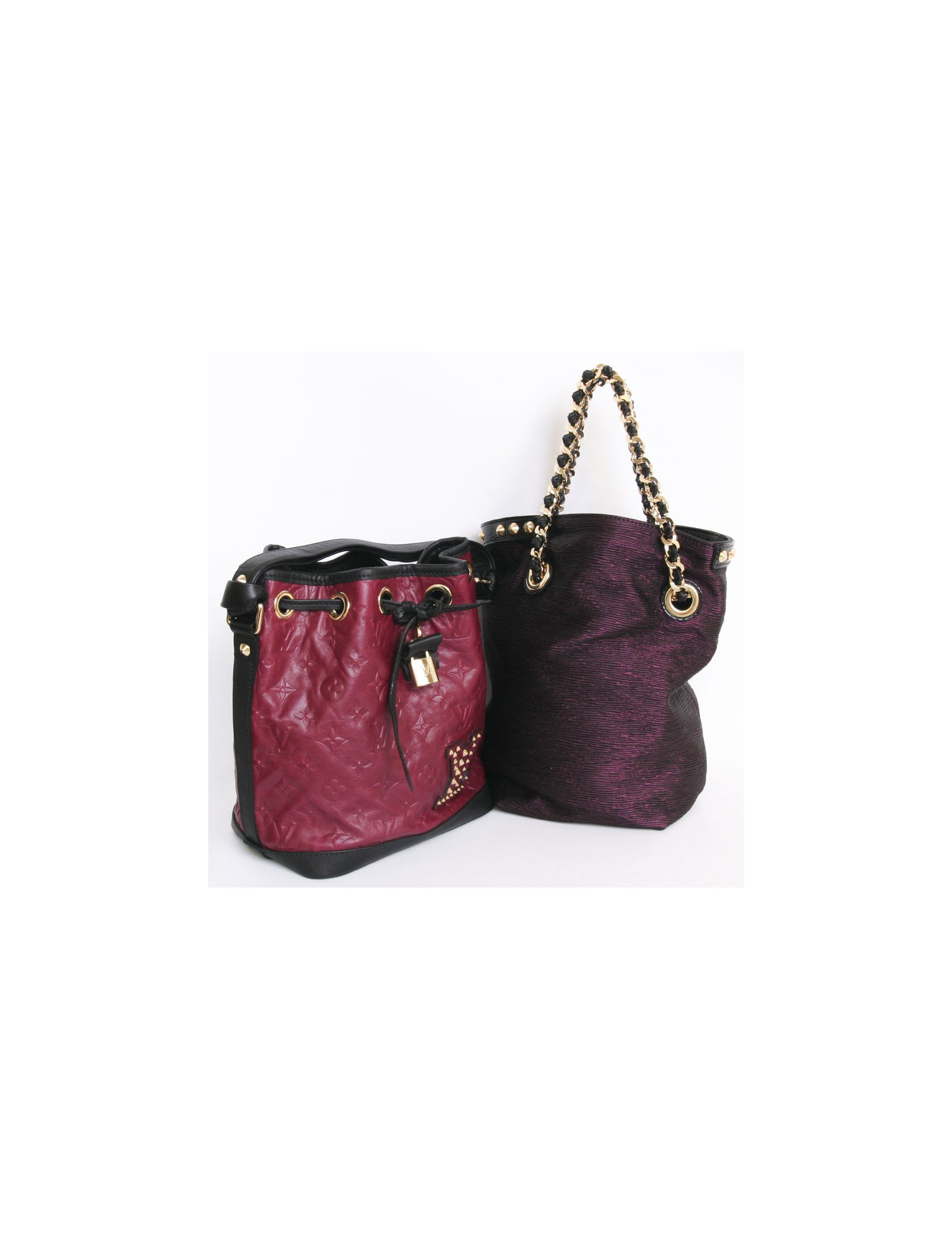 Sac "Néo noé" Louis Vuitton provenant de la ligne 'double jeu en cuir embossé monogram, couleur framboise, écusson "LV" en cuir clouté gold, bordure en cuir noir, poignée en cuir, cordon de serrage en cuir, une poche zippée intérieure. Dans ce sac se glisse une bourse en tissu texturé lamé rose foncé et noir avec 2 anses en chaîne gold entrelacées de nœuds de cuir, sur le bord deux pattes en cuir verni noir et ornées clous gold. Intérieur de la bourse en satin framboise avec une poche plaquée. Les deux sacs peuvent se porter indépendamment ou l'un dans l'autre. Collection A/H 09/10, jamais porté.