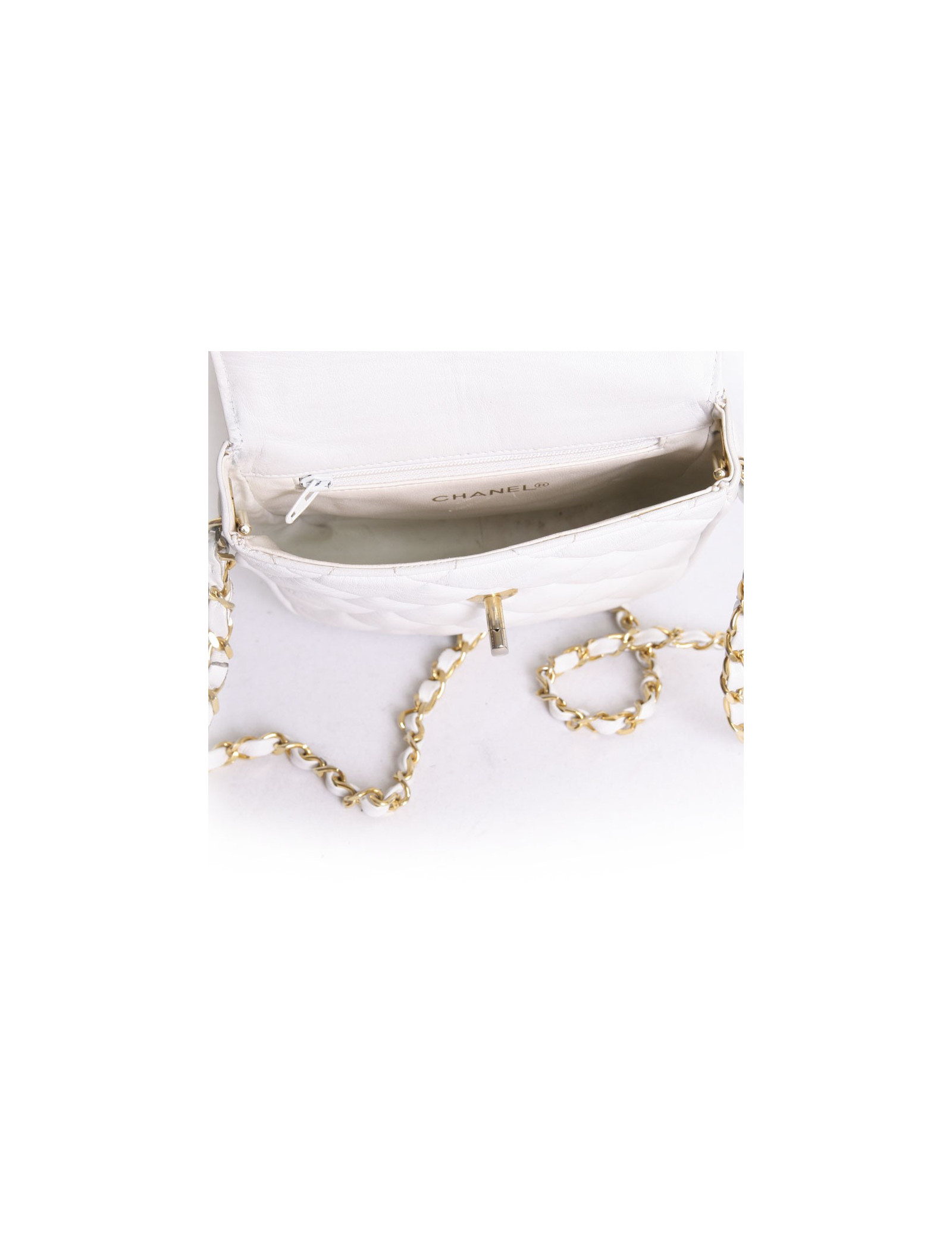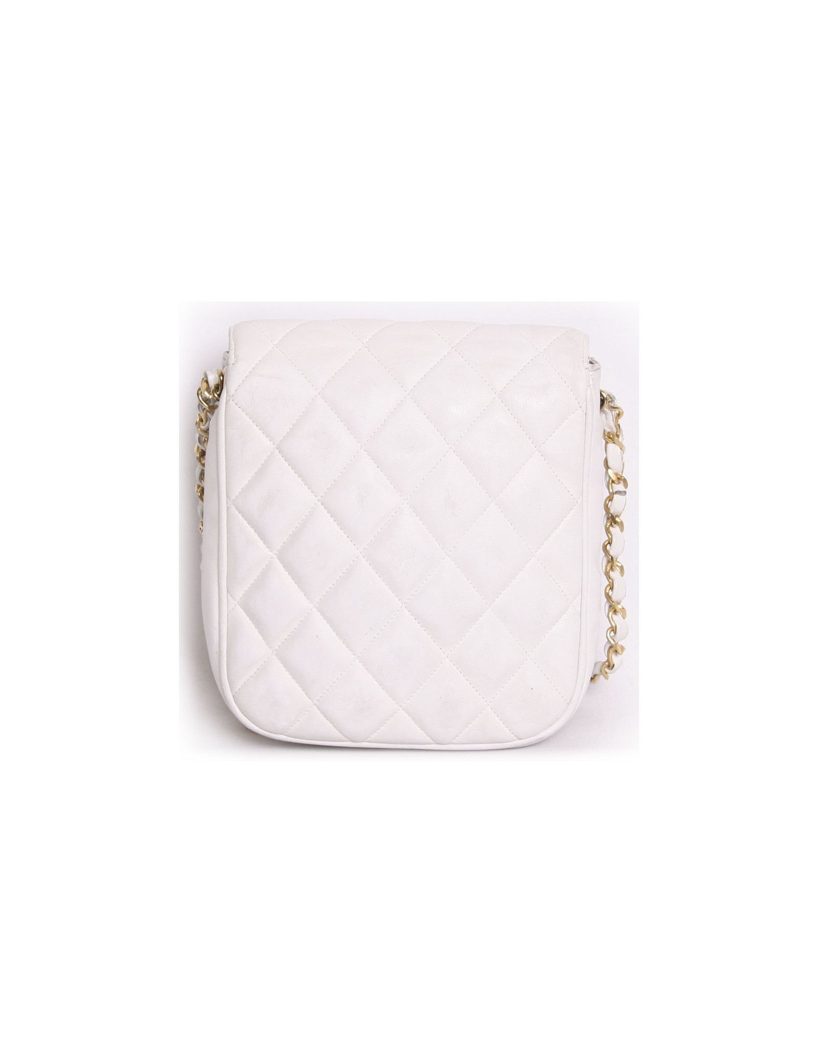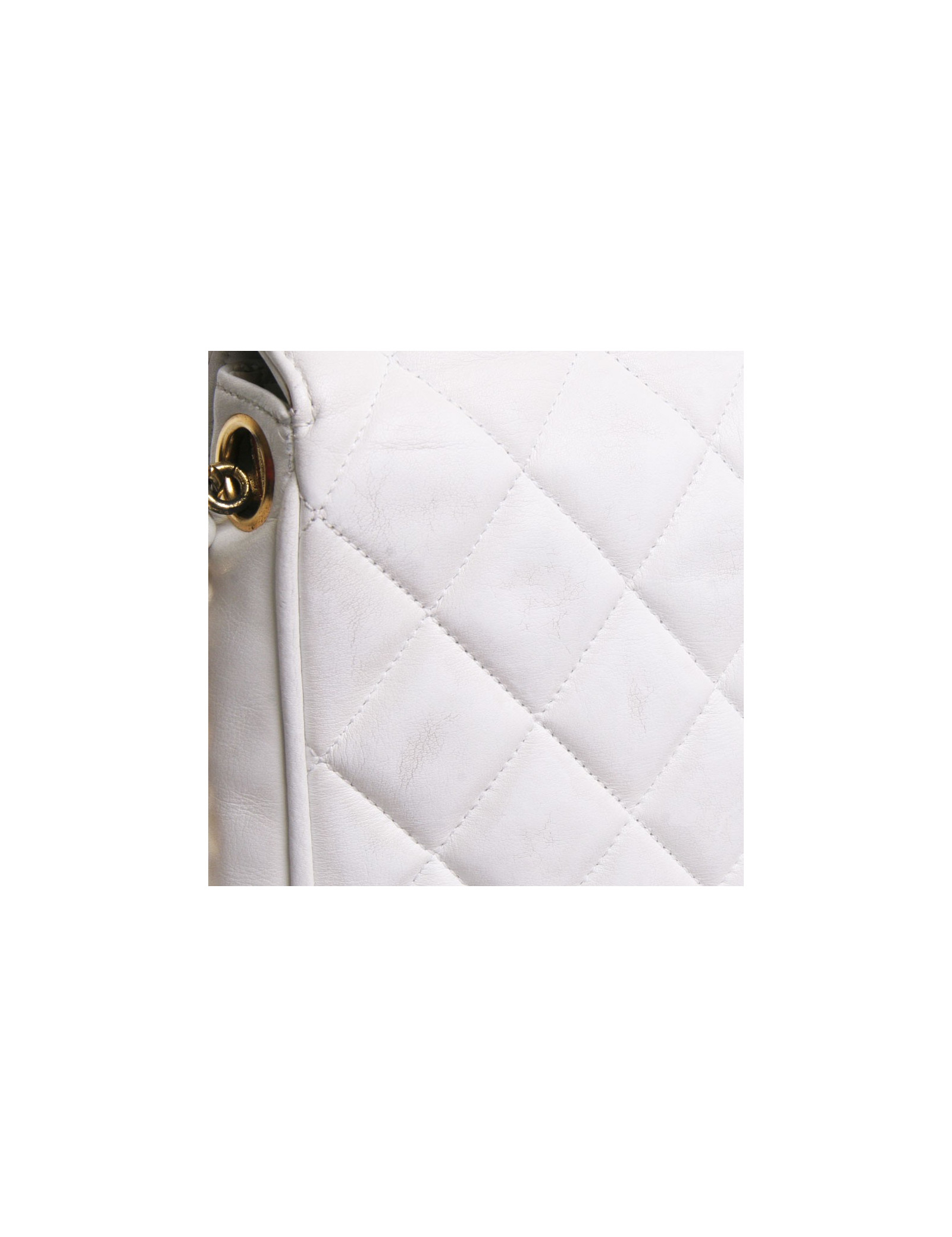 Ravissant sac Chanel vintage blanc matelassé avec bijouterie dorée. L'hologramme est dans la pochette zippée. L'intérieur est doublé de cuir beige. il se porte à l'épaule. Il est en bon état (le blanc est un peu passé)
