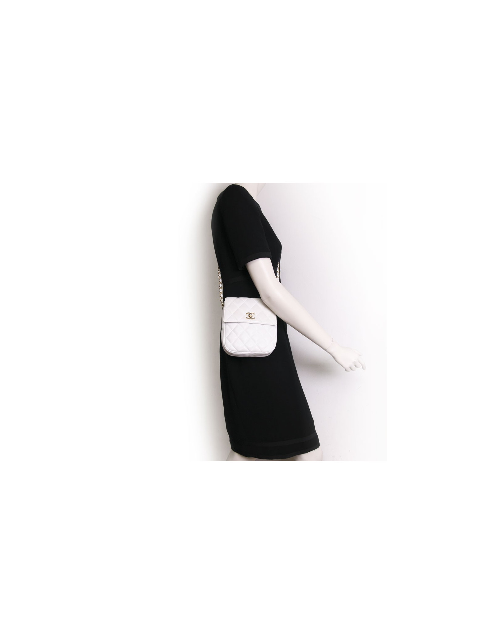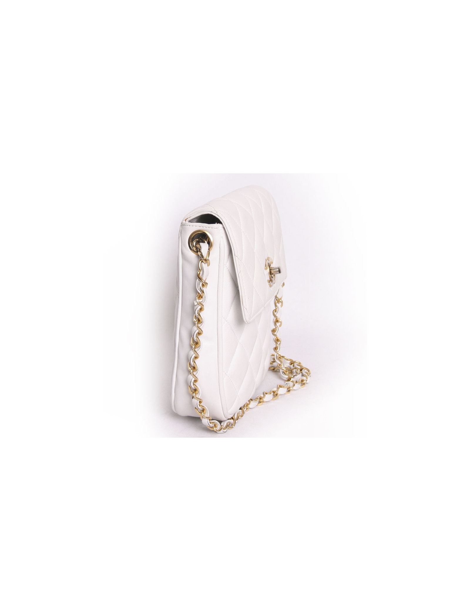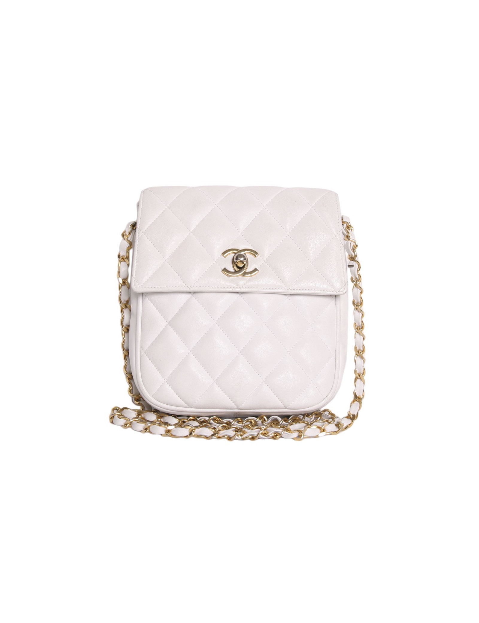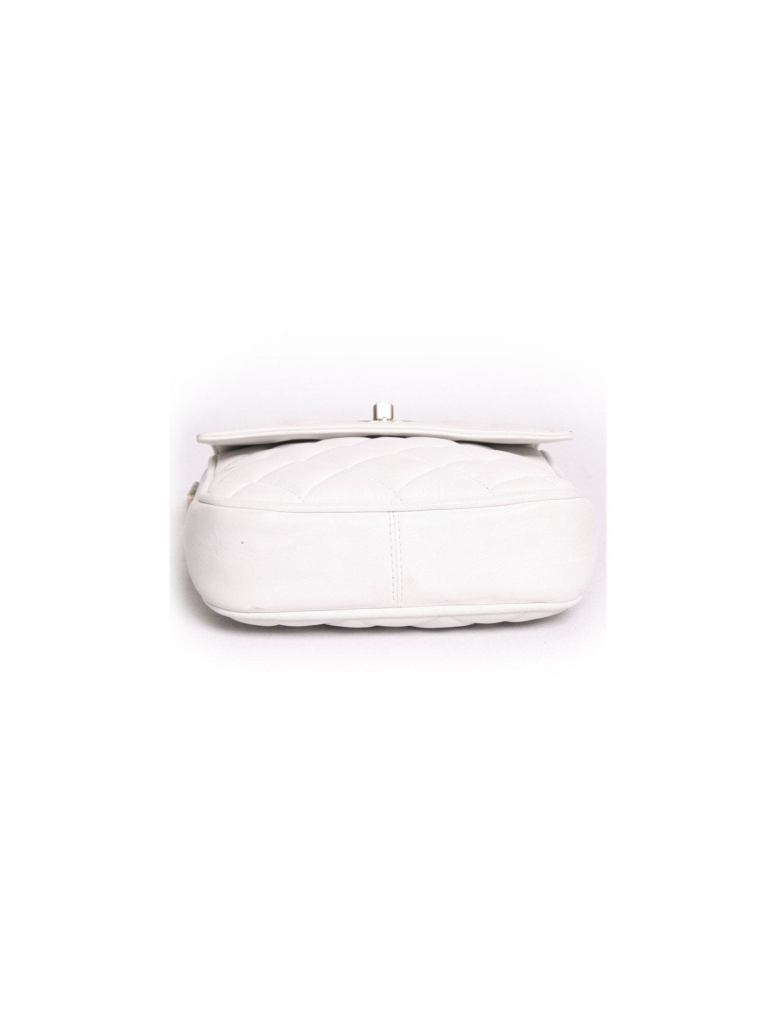 Ravissant sac Chanel vintage blanc matelassé avec bijouterie dorée. L'hologramme est dans la pochette zippée. L'intérieur est doublé de cuir beige. il se porte à l'épaule. Il est en bon état (le blanc est un peu passé)