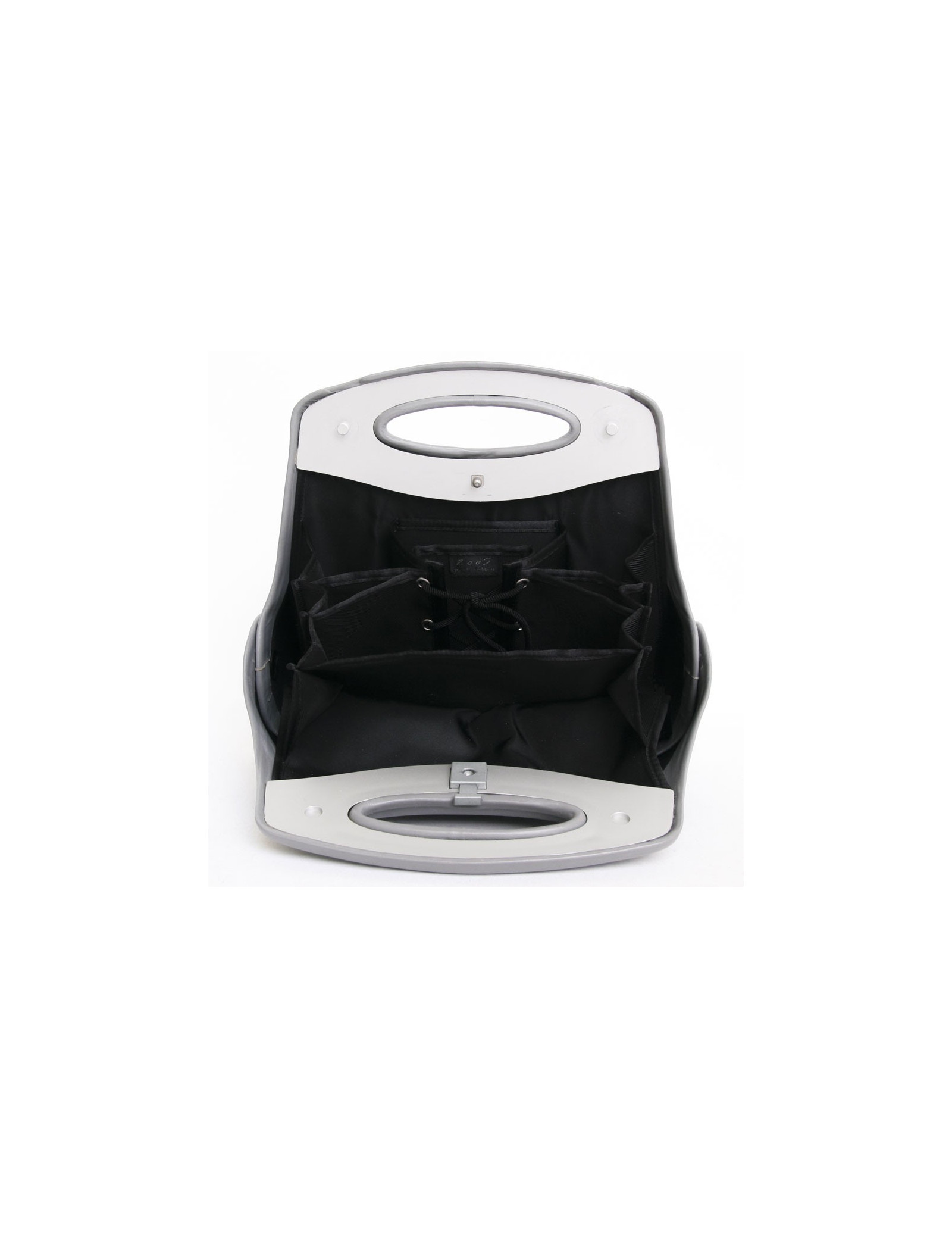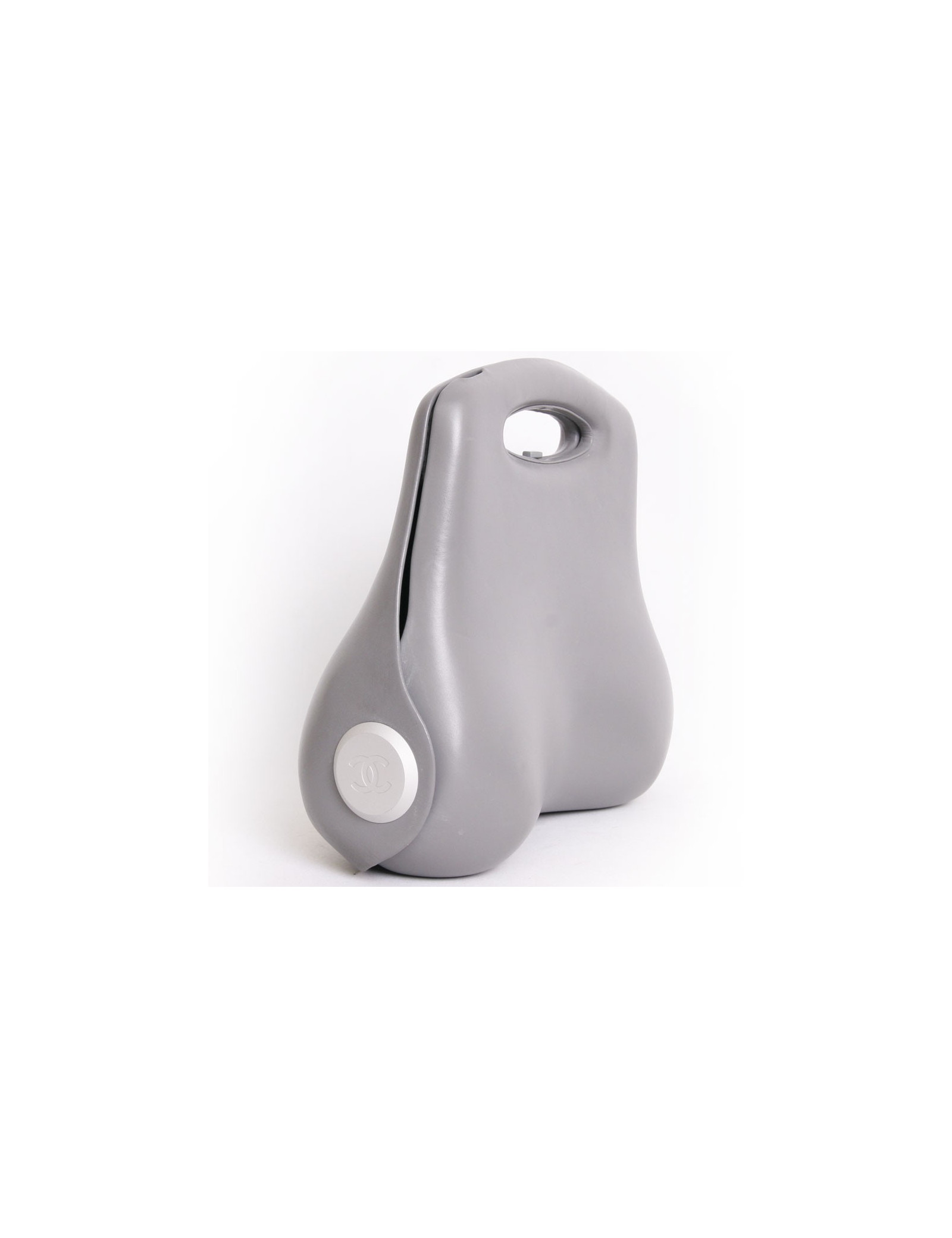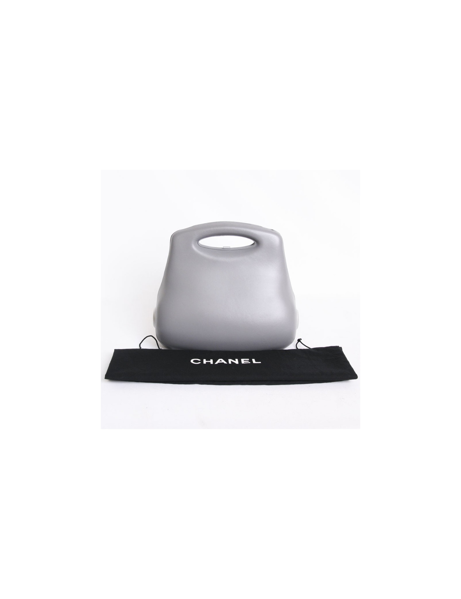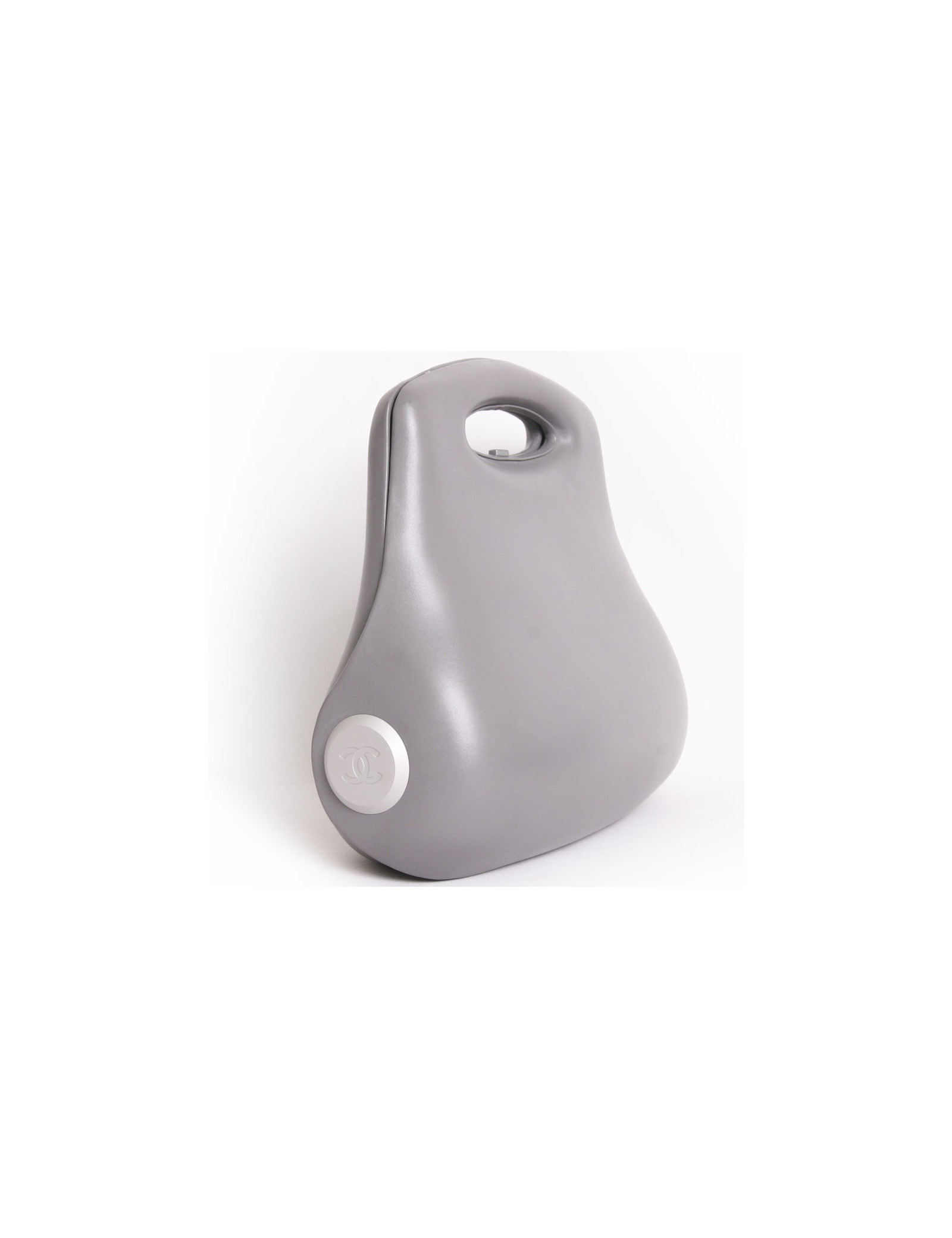 Collector ! sac rigide en cuir gris Chanel. Il s'ouvre en accordeon avec plusieurs compartiments en toile noire. l'ouverture se fait par un clips. Il se porte nà la main. sigle "CC" en métal de chaque coté.