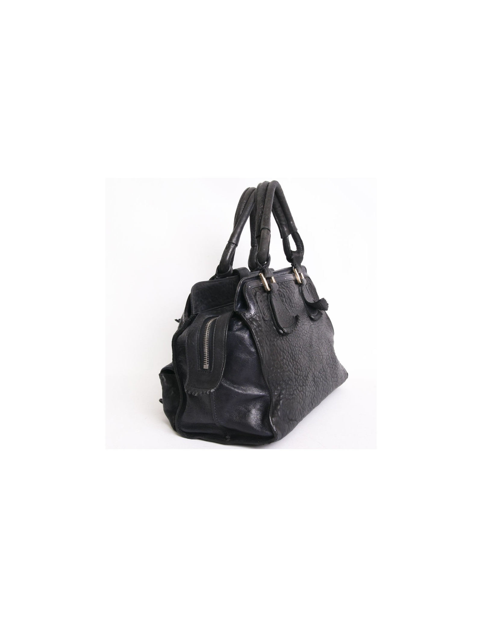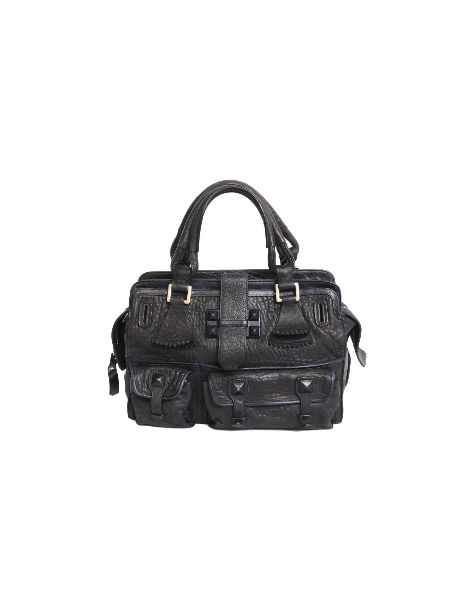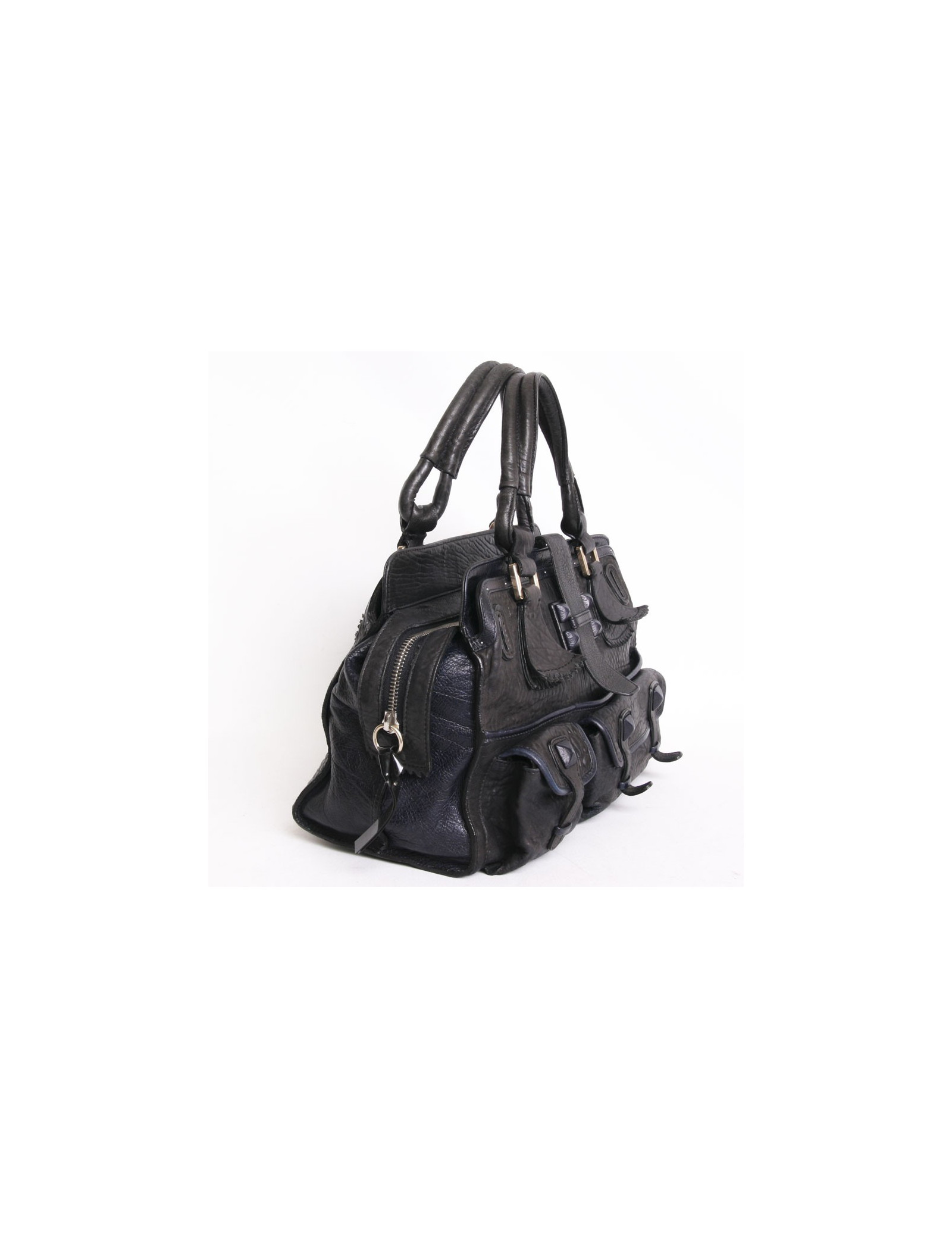 Sac Chloé, modèle Elvire, en cuir éléphant noir et bleu encre . Il y a 3 compartiments dont 2 à l'extérieur et un zippé. Devant il y a 2 poches et 2 fentes.Il y a en décoration des clous en cuir bleu encre. Il se porte également à l'épaule. l'intérieur est en toile noir avec un poche zippée.
